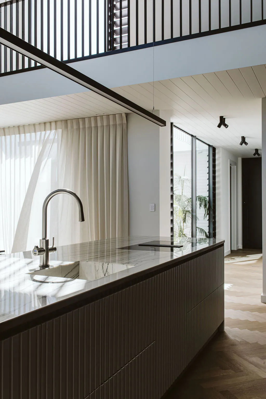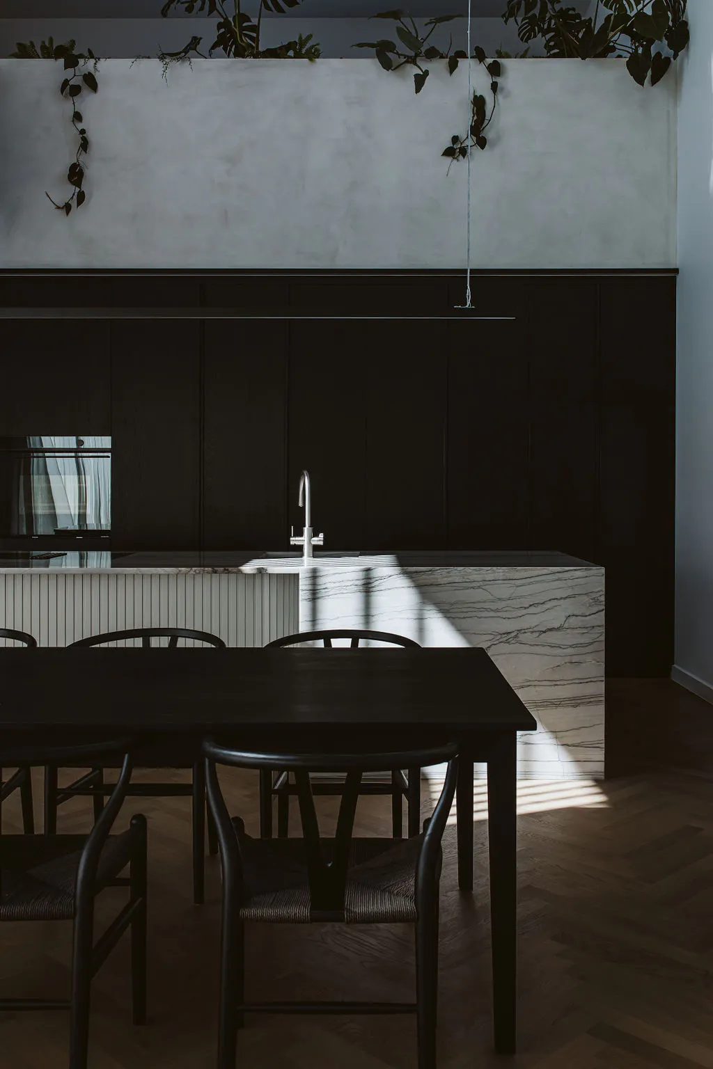 “The void above the kitchen is stunning: the space creates a sense of calm, and the mezzanine garden adds further warmth and texture to the space, with greenery hanging down the plastered back wall”, says Anika Rowson of Rowson Kitchens.