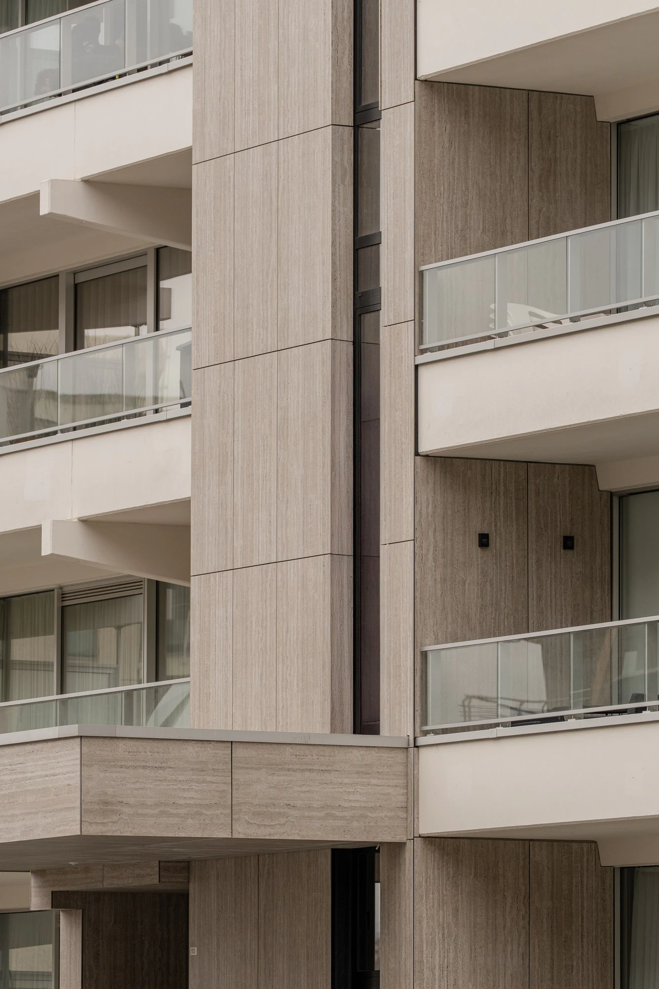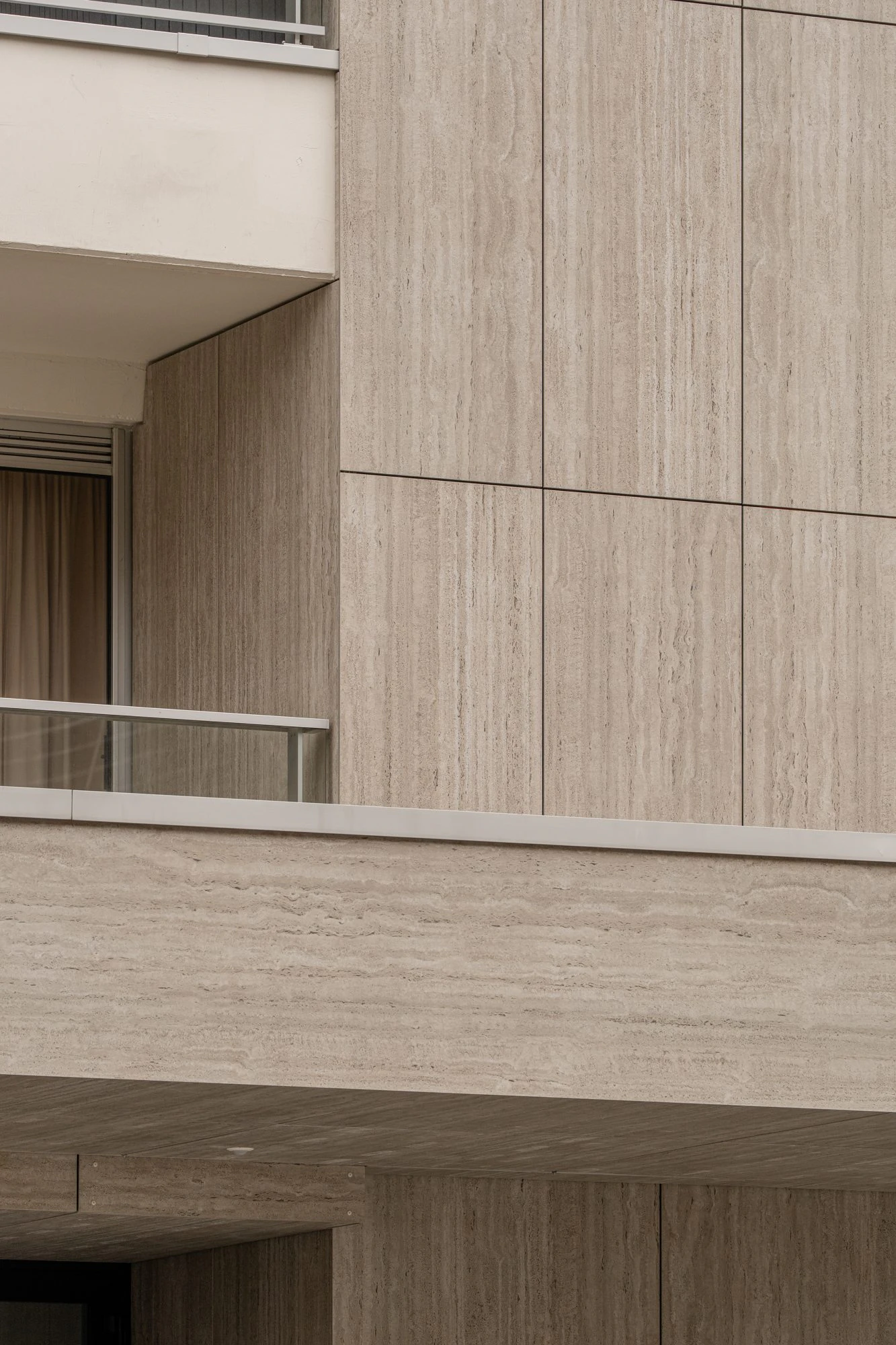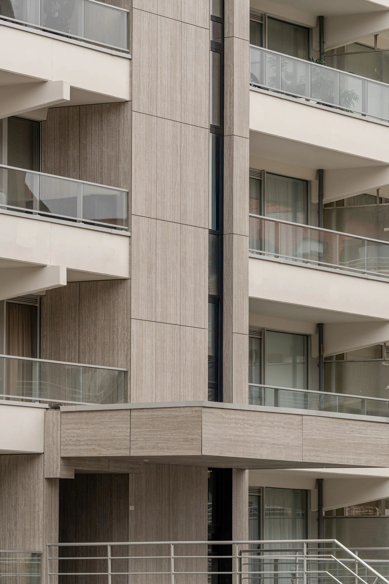 This is a building with many residences, glazed terraces, and a constant aim to blend in with the surrounding constructions, making a finish in harmony with the environment essential. Dekton Nebu was chosen for this purpose. For the interplay the architect required on the façade, a combination of 8 mm and 12 mm thicknesses was used, allowing for subtle articulation while reinforcing details at key points of architectural transition.