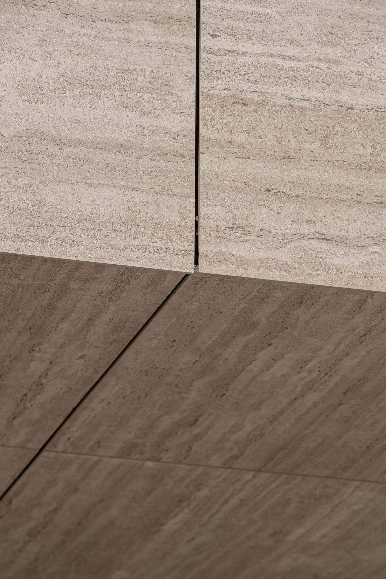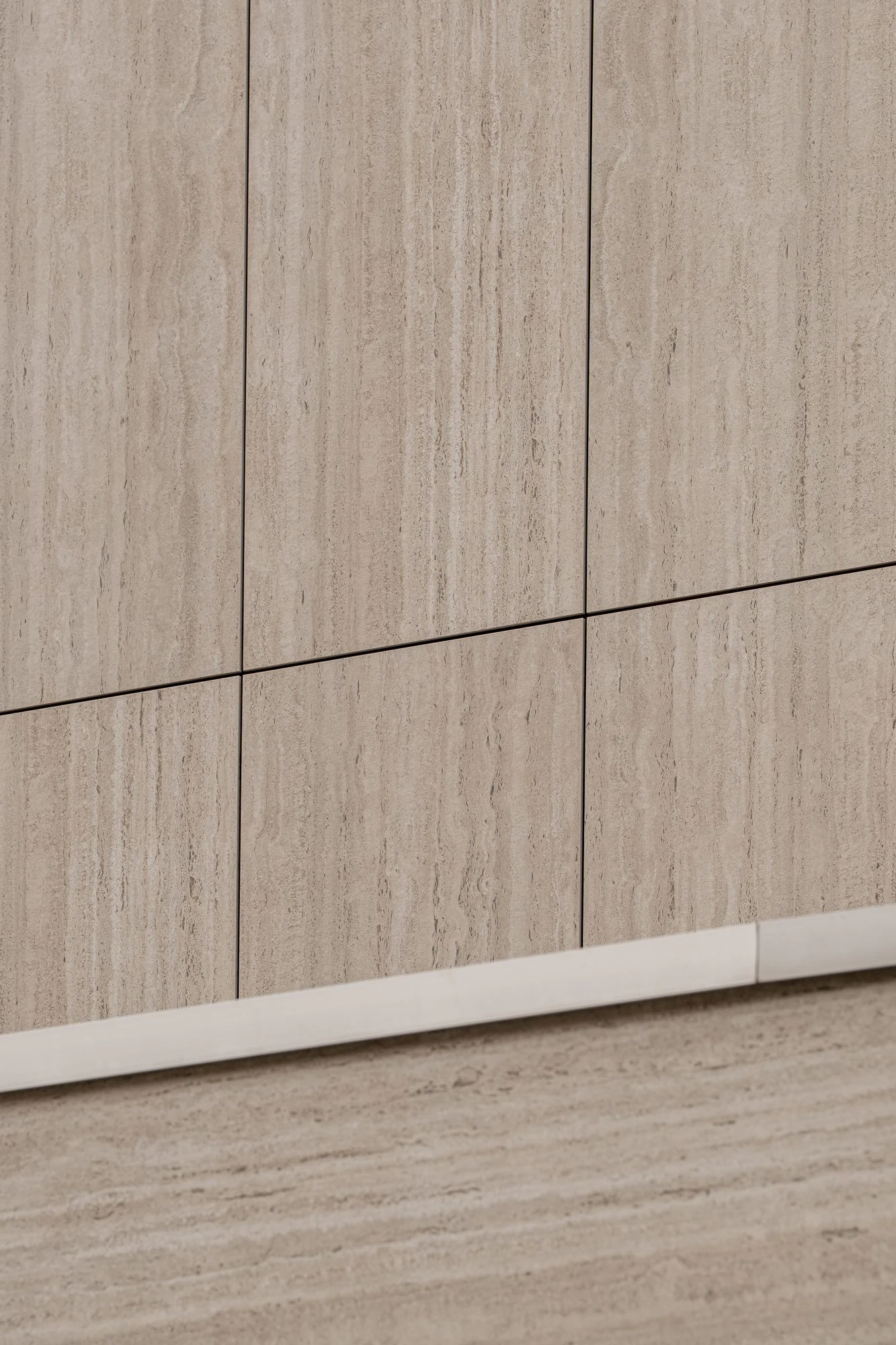 “Approximately 150 m2 of Dekton Nebu, a soft grey-beige shade with delicate linear veining inspired by natural sedimentary stone, were used. Its discreet texture adds depth and refinement without overpowering the overall façade. The colour responds particularly sensitively to coastal light, displaying cooler tones under cloudy skies and warmer hues in direct sunlight, making it a particularly suitable choice for the changing atmosphere of Nieuwpoort’s coastline,” explains the architect.