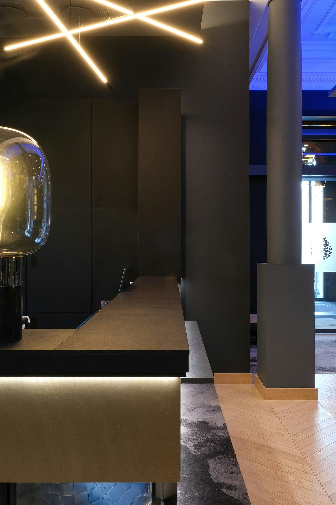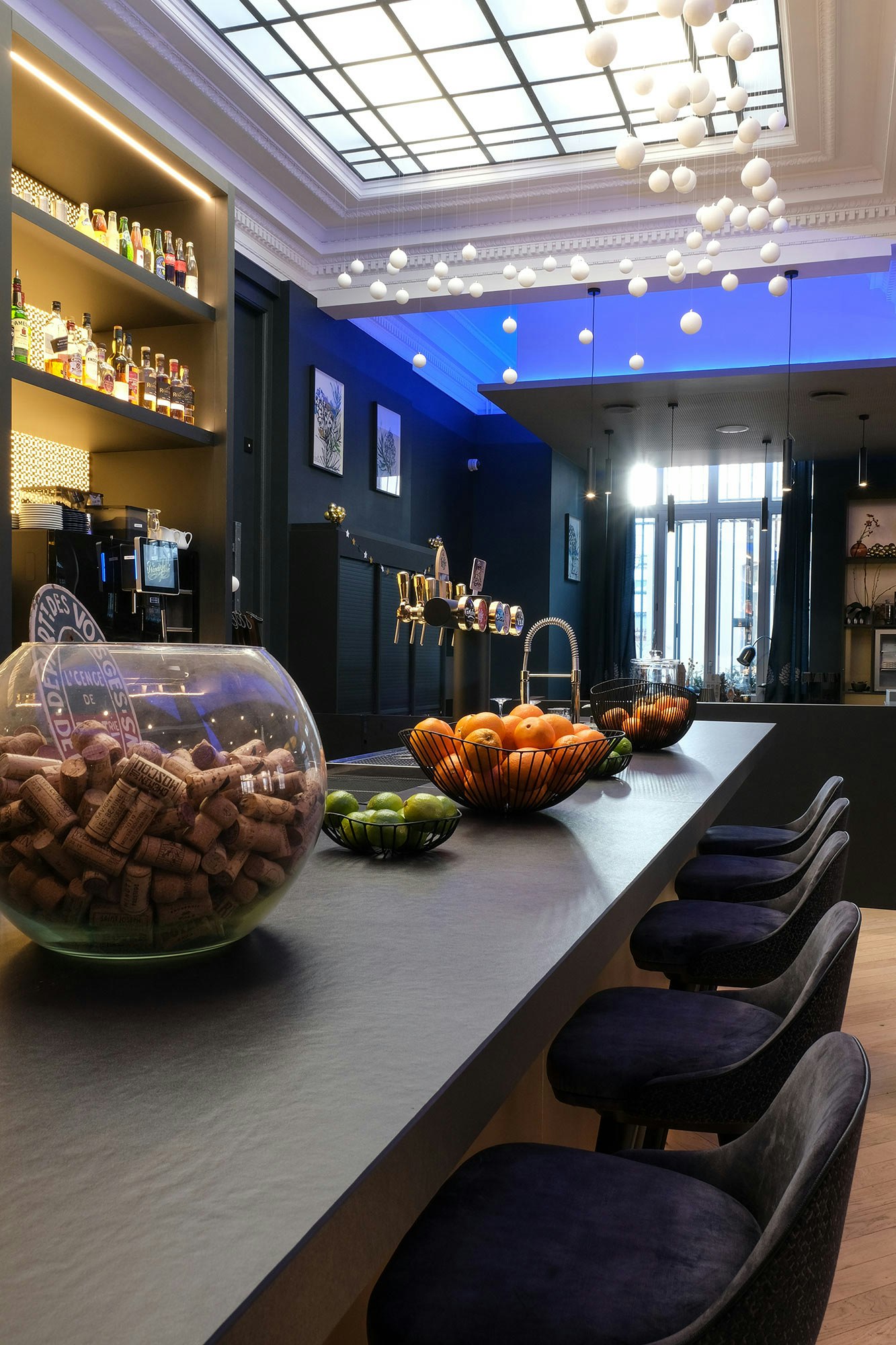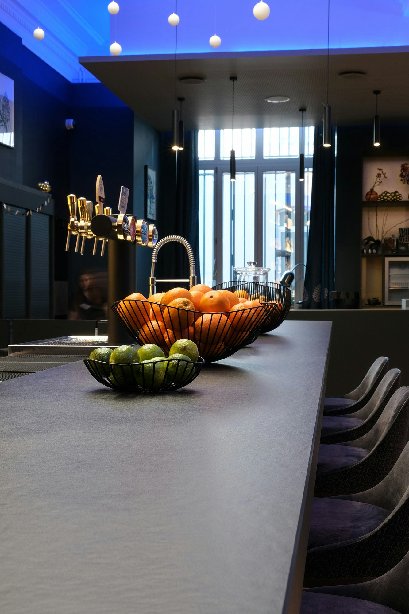 However, it is in the warm and intimate lobby where one encounters our ultra-compact material, Dekton, in the Sirius color, one of our flagship references. It is used as a bar covering, a reception desk, and also as a buffet countertop in the dining area. This color, with its dark matte waxed concrete effect, brings depth and elegance to the space while remaining understated. The black, with its textured visual effect and touches of deep green tones, enriches the environment with realism and power.