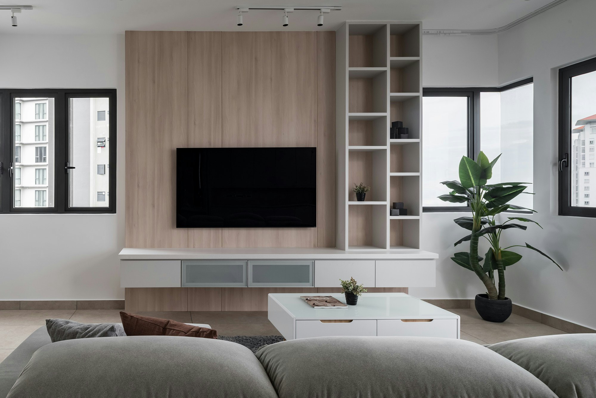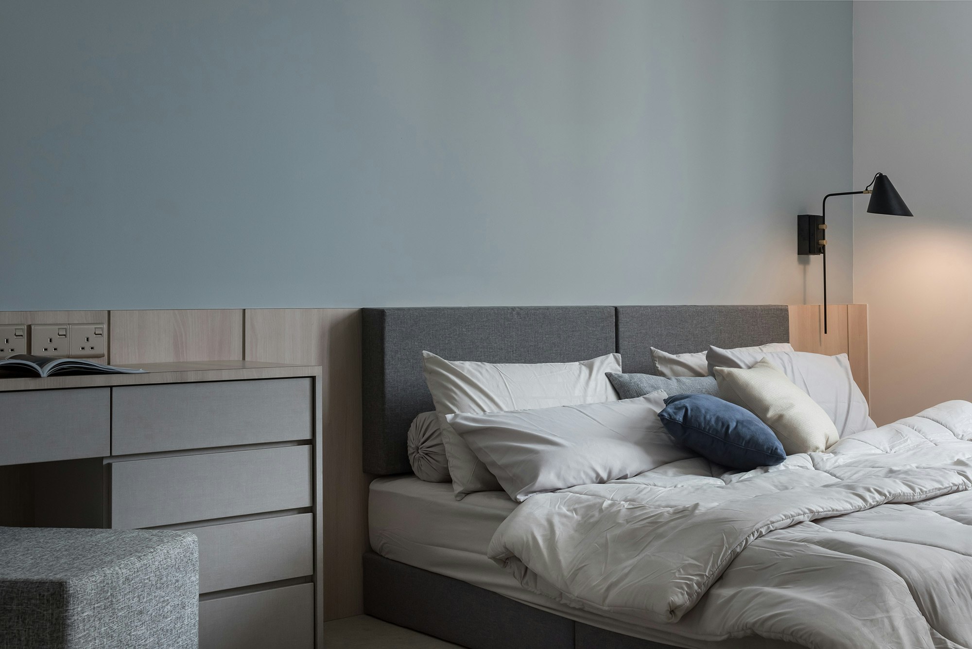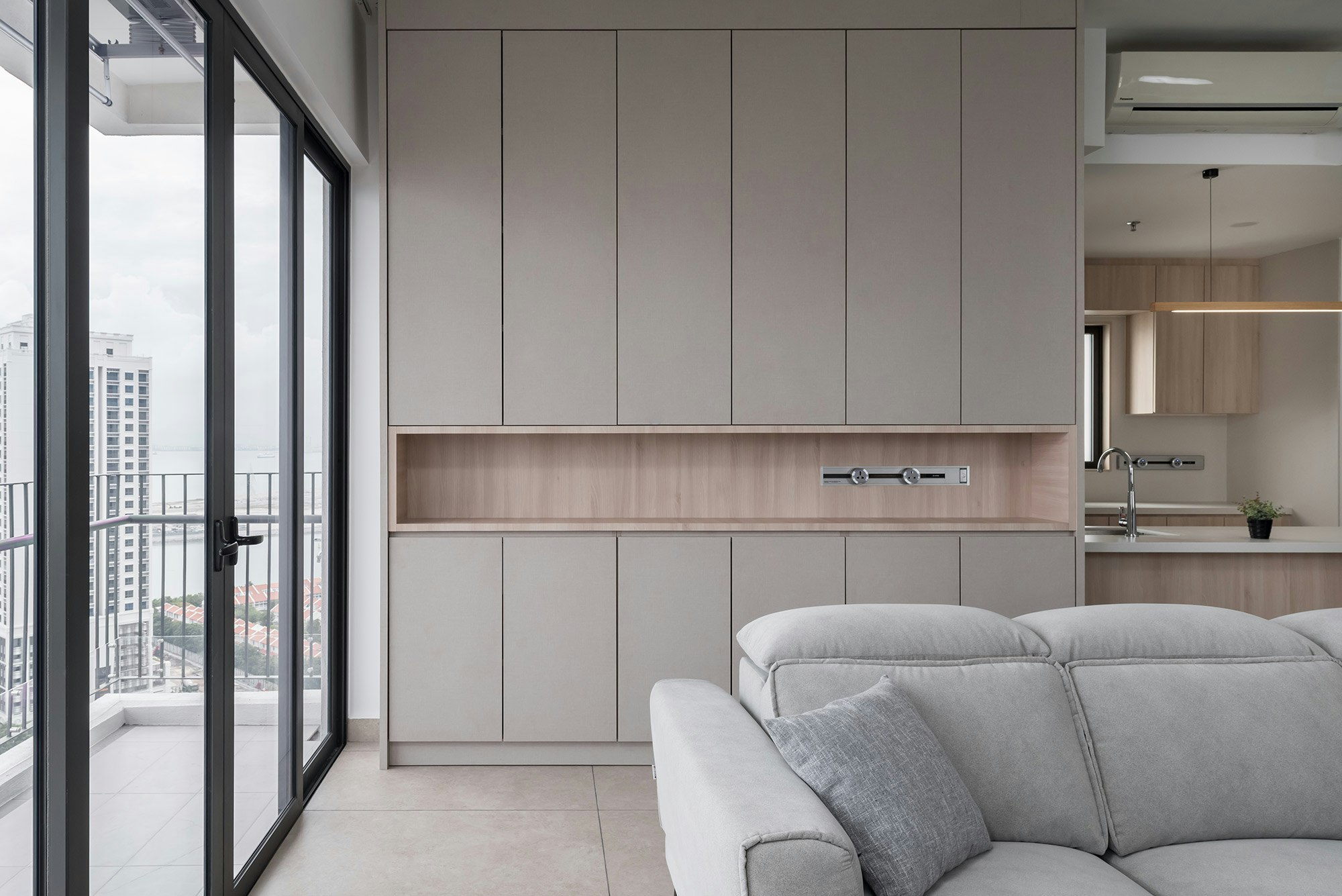 This privileged setting is home to an exclusive flat designed by Grov Design Studio, which has been refurbished with the aim of maximising natural light. ‘Located opposite and with sweeping panoramic views of the Straits Quay promenade, the idea behind this refurbishment was to maximise the brightness of the open plan living and dining room. Overall, we were looking to create a calm and relaxed atmosphere: airy, light, minimalist and subtly elegant, without overpowering the blue tones of the sea,’ explains the studio.