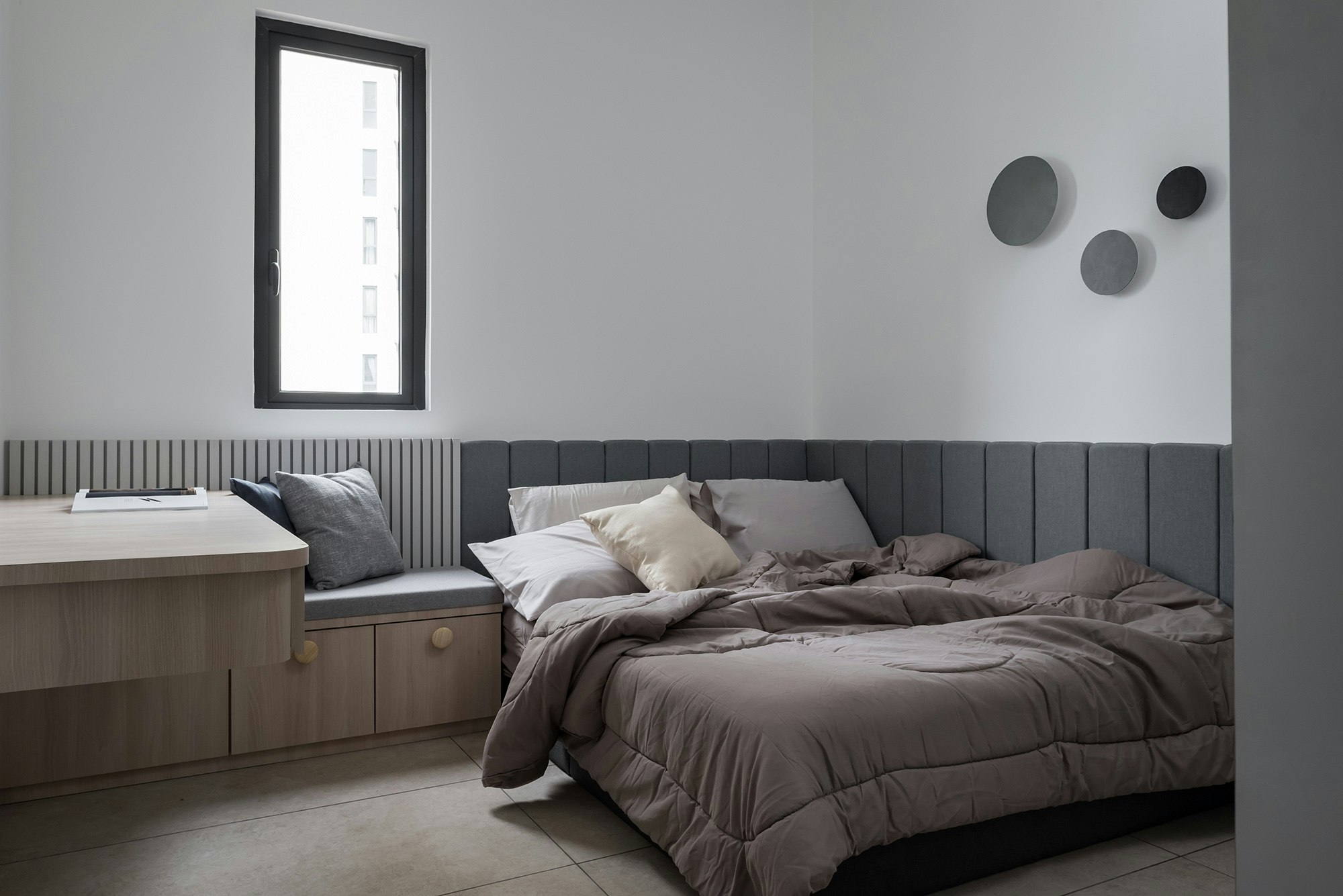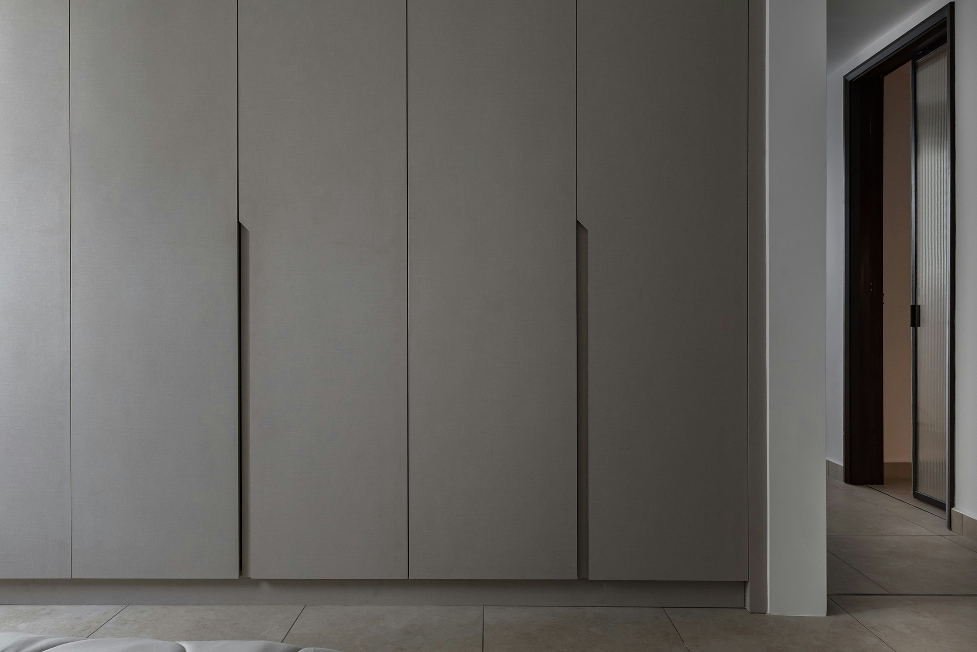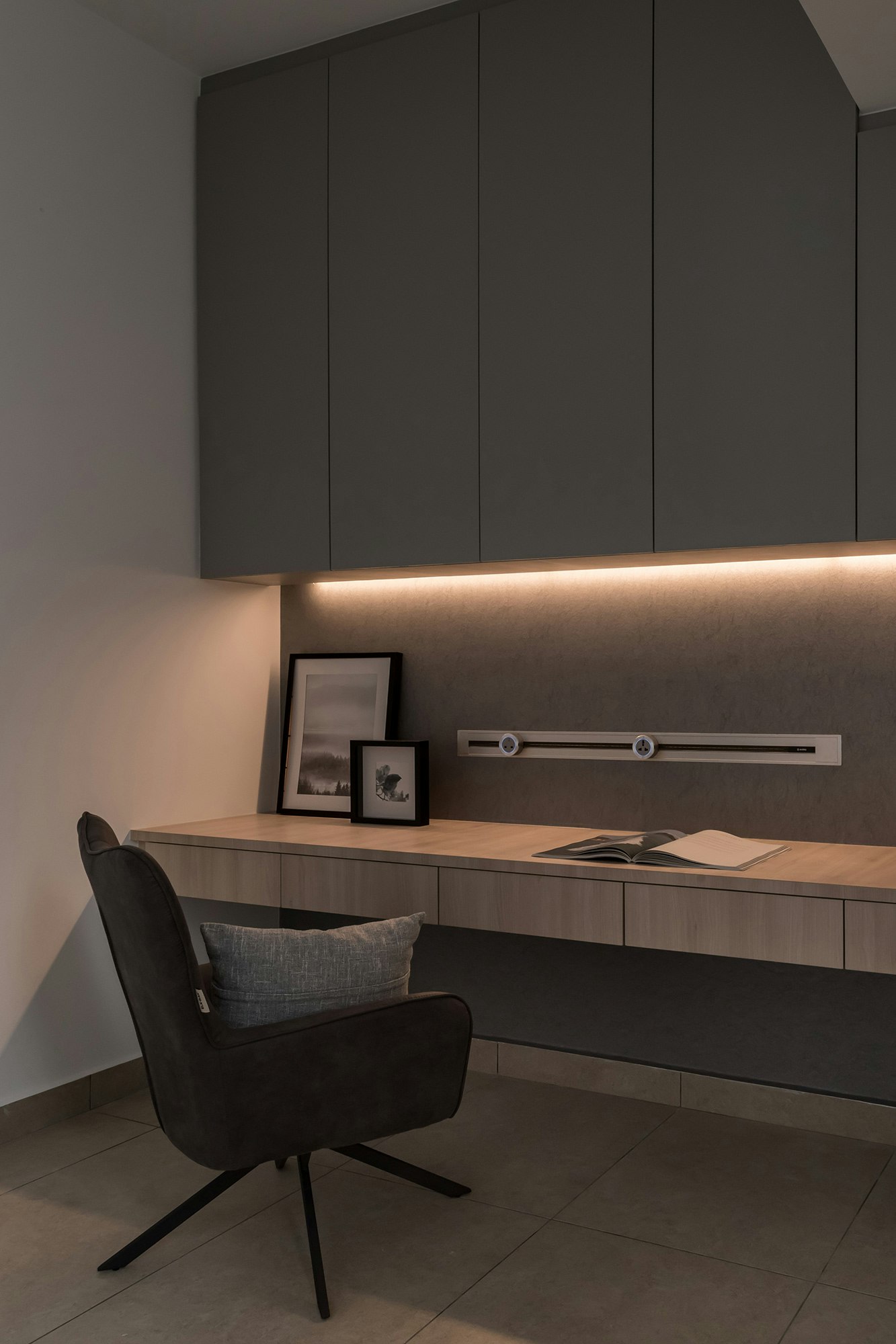 This privileged setting is home to an exclusive flat designed by Grov Design Studio, which has been refurbished with the aim of maximising natural light. ‘Located opposite and with sweeping panoramic views of the Straits Quay promenade, the idea behind this refurbishment was to maximise the brightness of the open plan living and dining room. Overall, we were looking to create a calm and relaxed atmosphere: airy, light, minimalist and subtly elegant, without overpowering the blue tones of the sea,’ explains the studio.