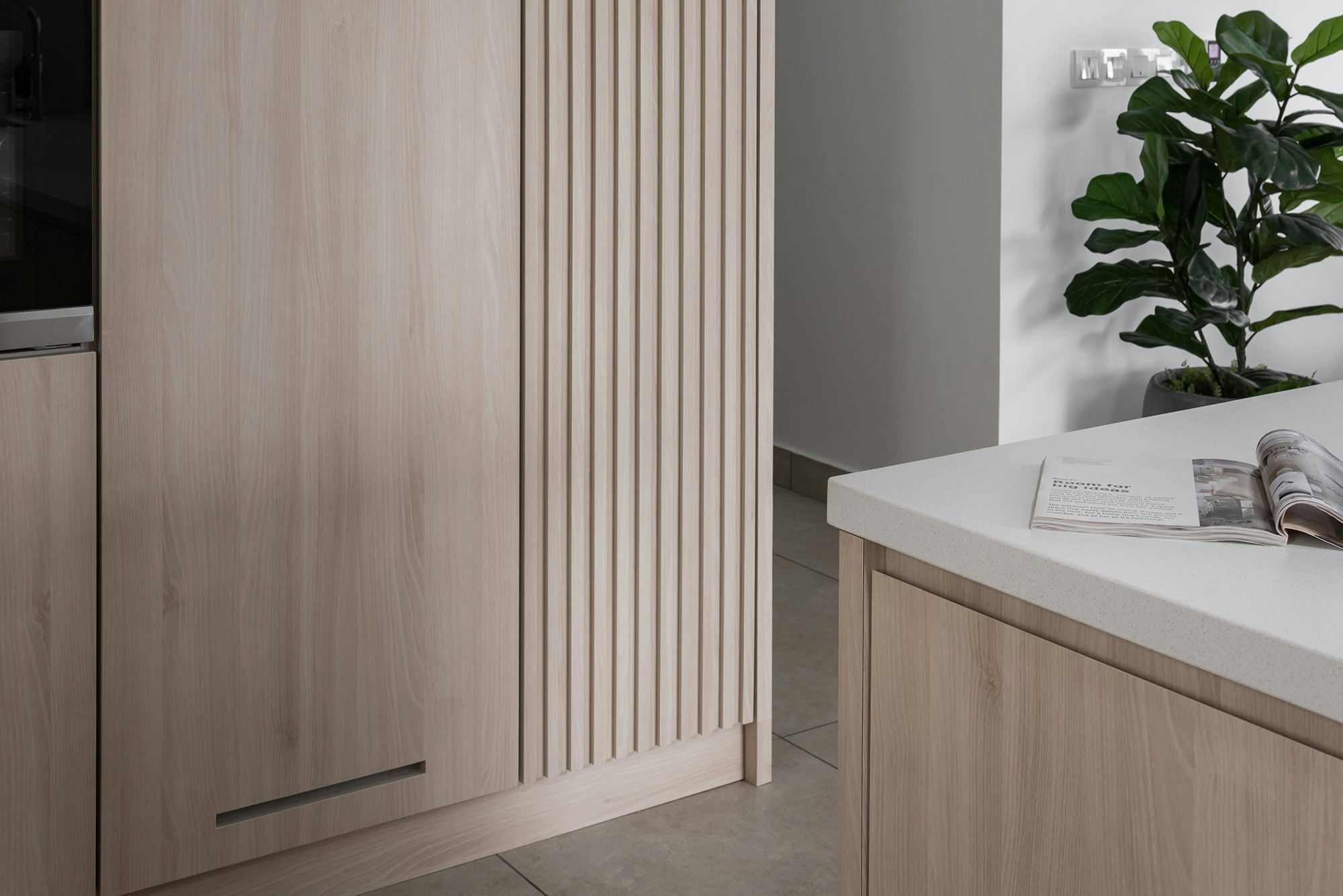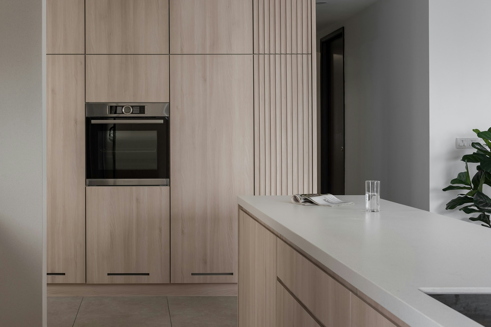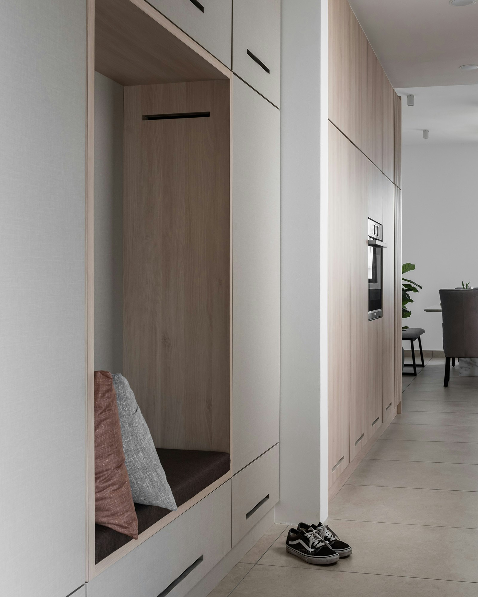 They liked this Dekton colour so much that they also used it for the worktop of the TV cabinet, a bespoke design that matches the kitchen units perfectly. In the laundry room, a Dekton Nayla slab has also been added just above the washing machine.