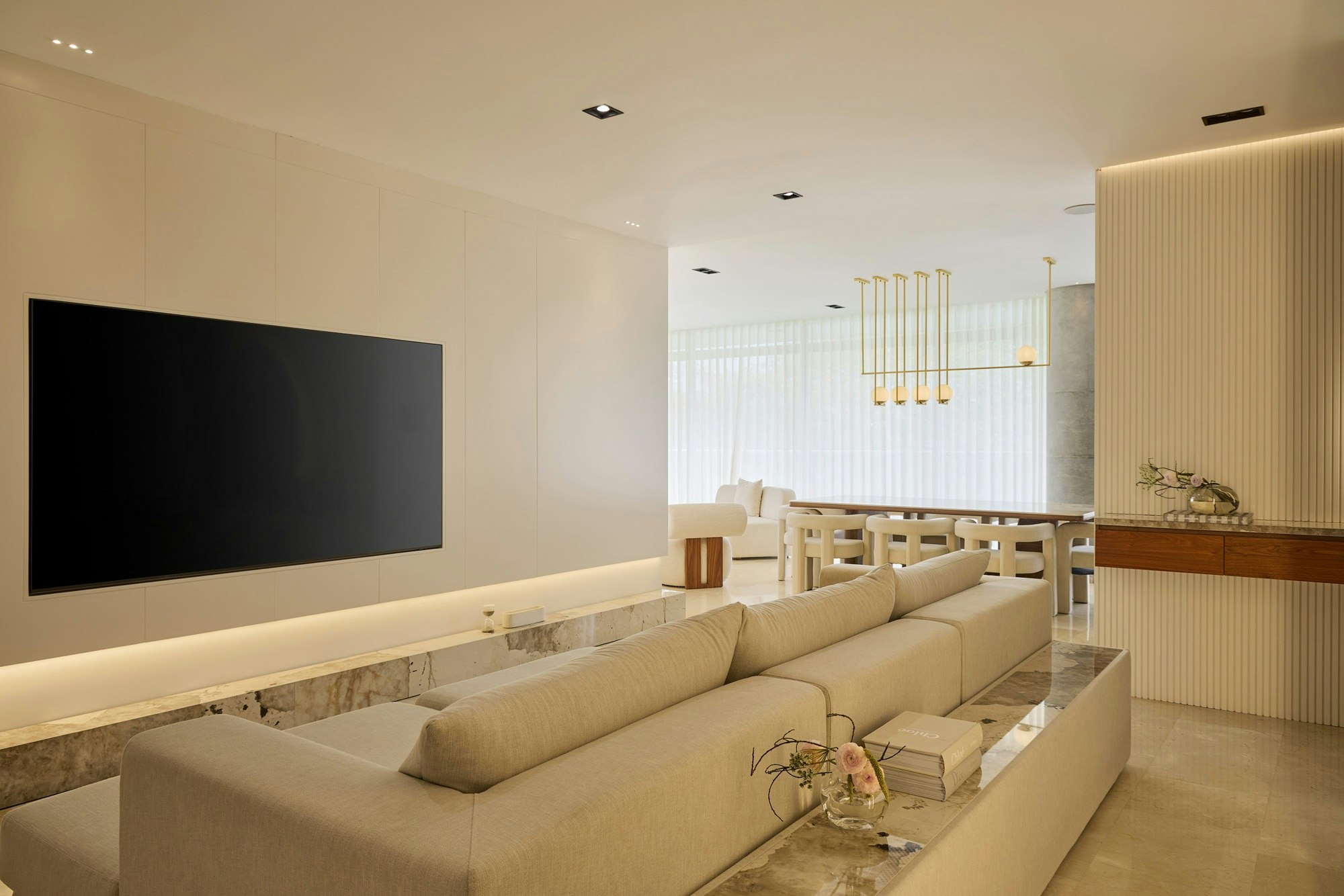 The TV unit and the support unit behind the sofa, also made of Dekton Khalo, reinforce material continuity and contribute to a clean and organised reading of the ensemble.