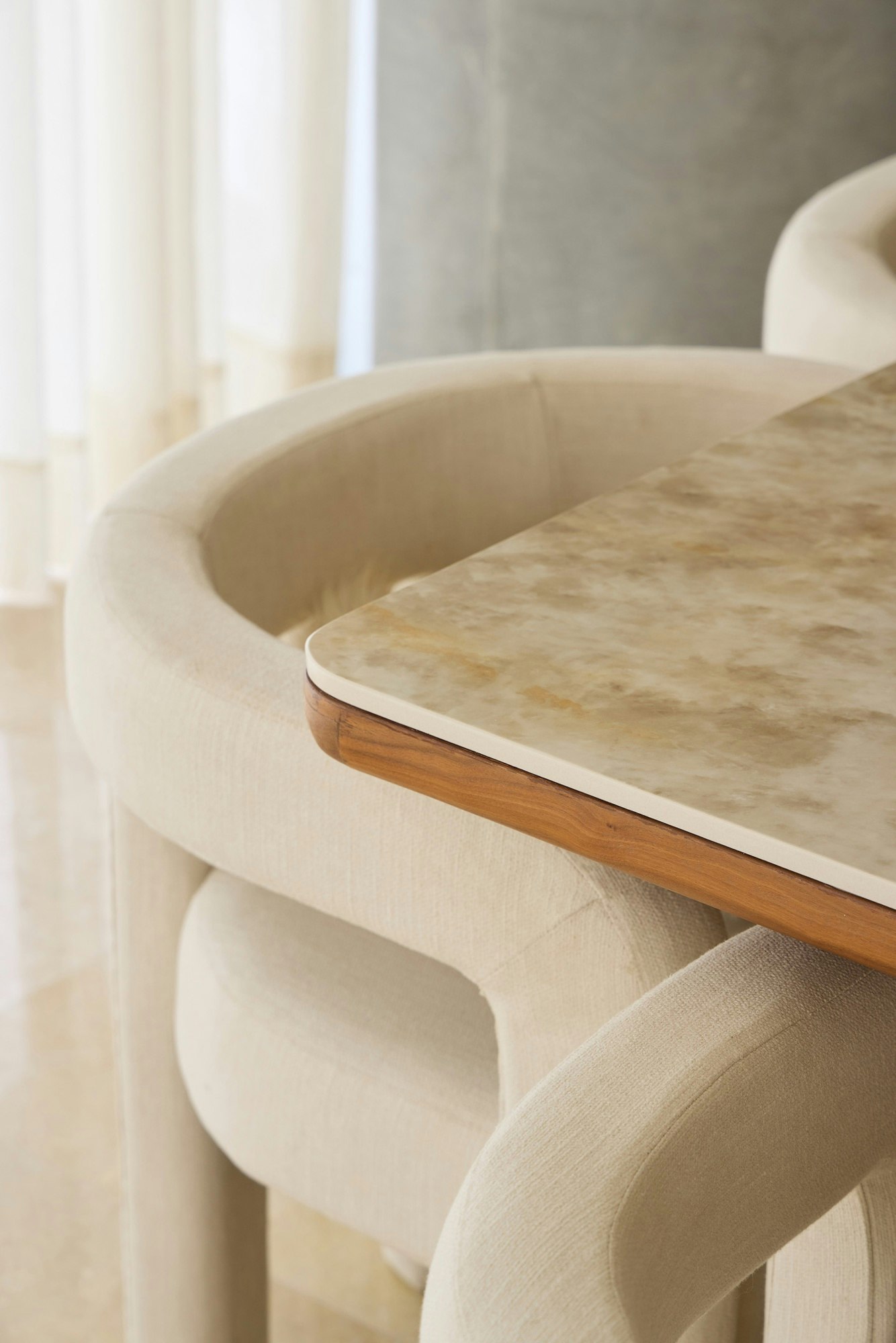 In the living room, the curved-line furniture interacts with the two coffee tables made of Dekton Danae. Its light tone and texture provide visual lightness and contrast with the warmth of the wood, creating a cosy and serene atmosphere. The choice of this material responds to both aesthetic and functional criteria, reinforcing the idea of surfaces designed for everyday use without compromising a “sophisticated” presence.