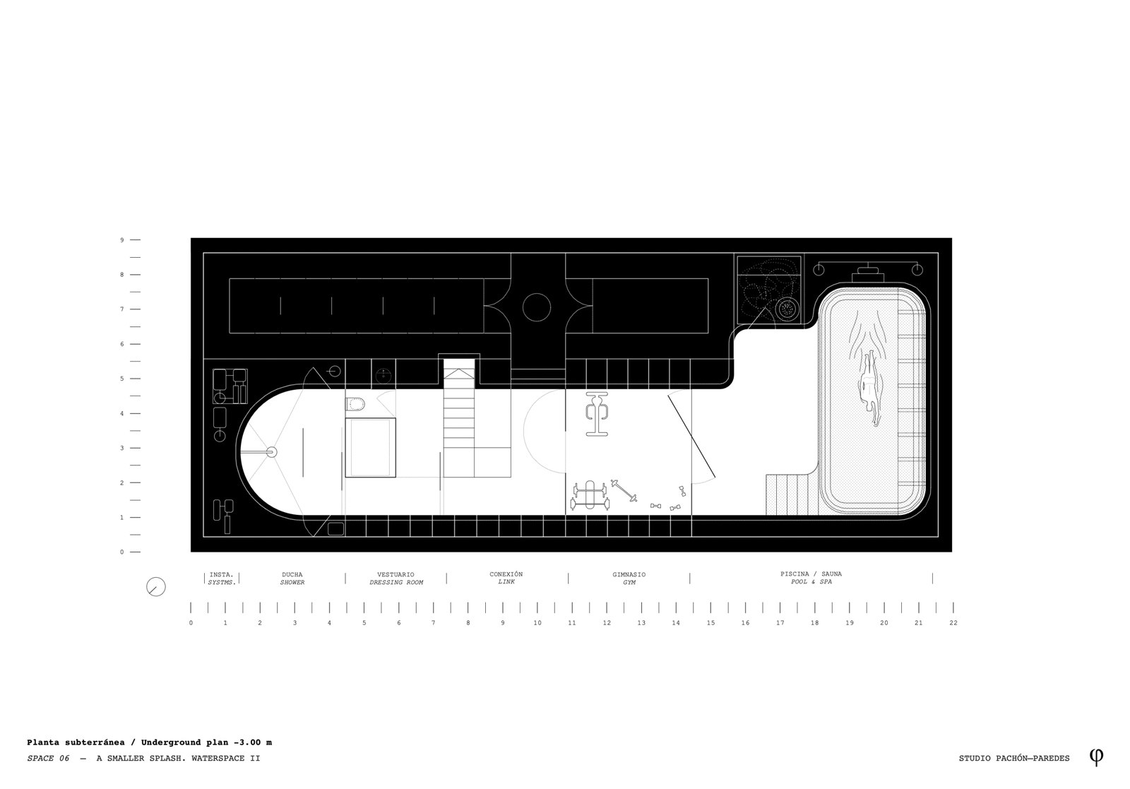 The new layout gives rise to a series of adjacent rooms that are conceived as different environments in which to exercise or meditate, and which promote physical wellbeing. Complementing this, an inhabited perimeter of facilities and services supports the synergies and energy systems of the space and the building above.