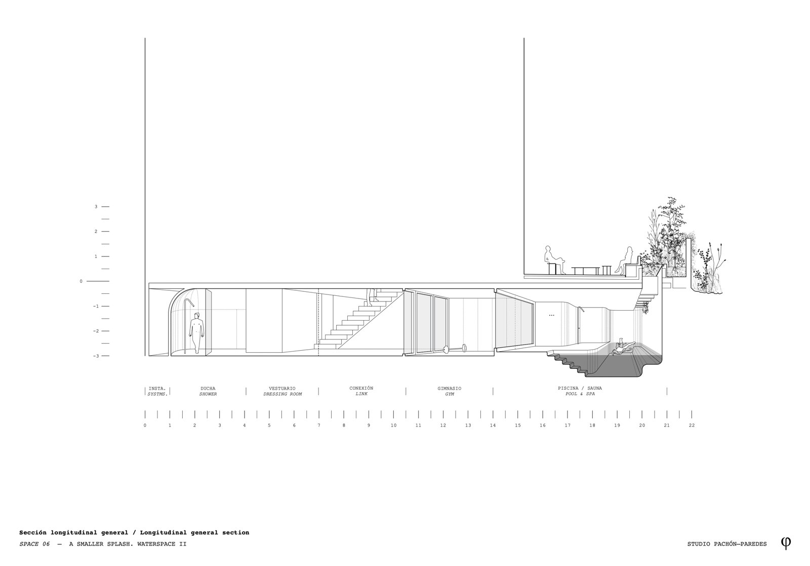 The project is summarised in a series of sporting areas, culminating in a swimming pool, designed to care for the body and mind