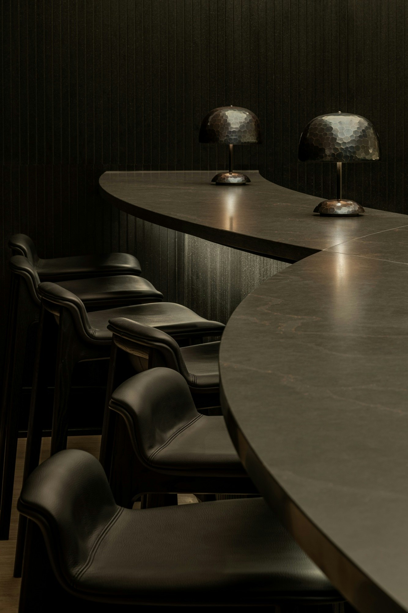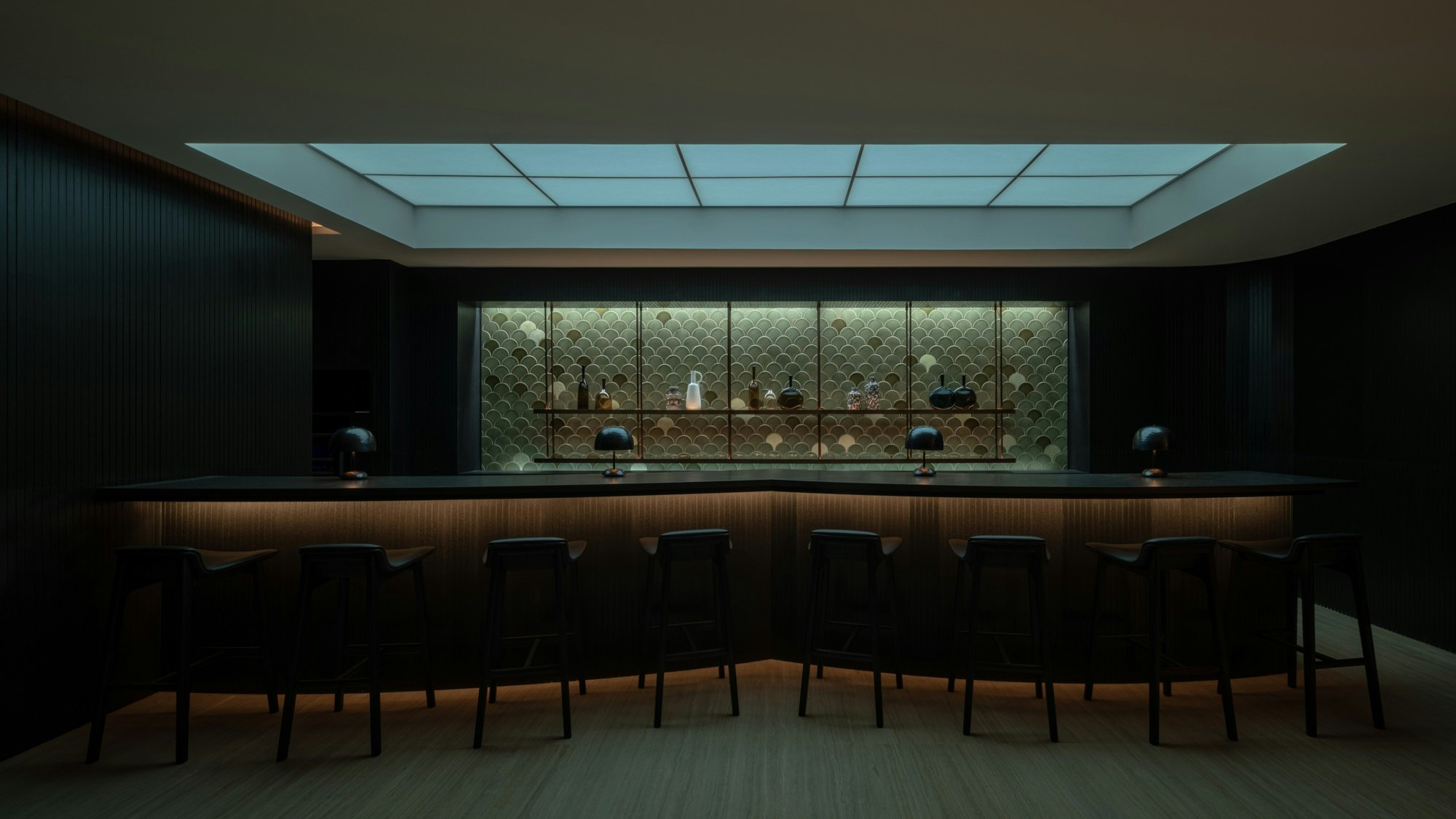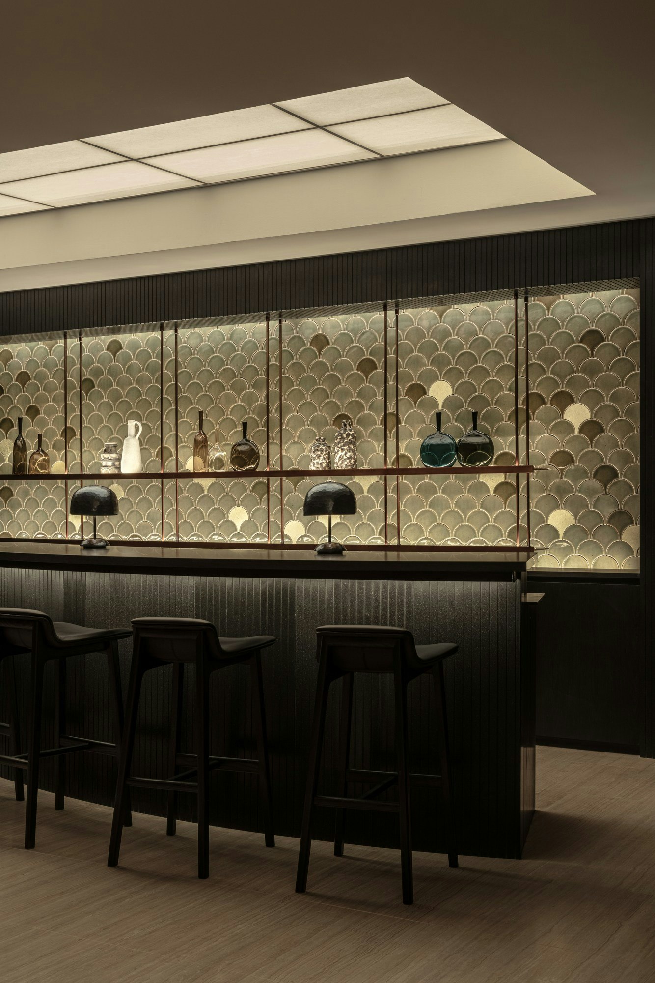 The bar, with its immersive shape and seamless design, rests on a vertical cladding of black slats that contrasts with the glow of the backlit background. The latter is composed of ceramic pieces shaped like scales, manually arranged to create a three-dimensional and almost aquatic effect. Diffuse lighting from the ceiling, with a large lightbox replacing the windows, floods the space with a soft glow, while bronze, charcoal, and amber tones reflect on the surfaces, enhancing the sense of calm and sophistication.