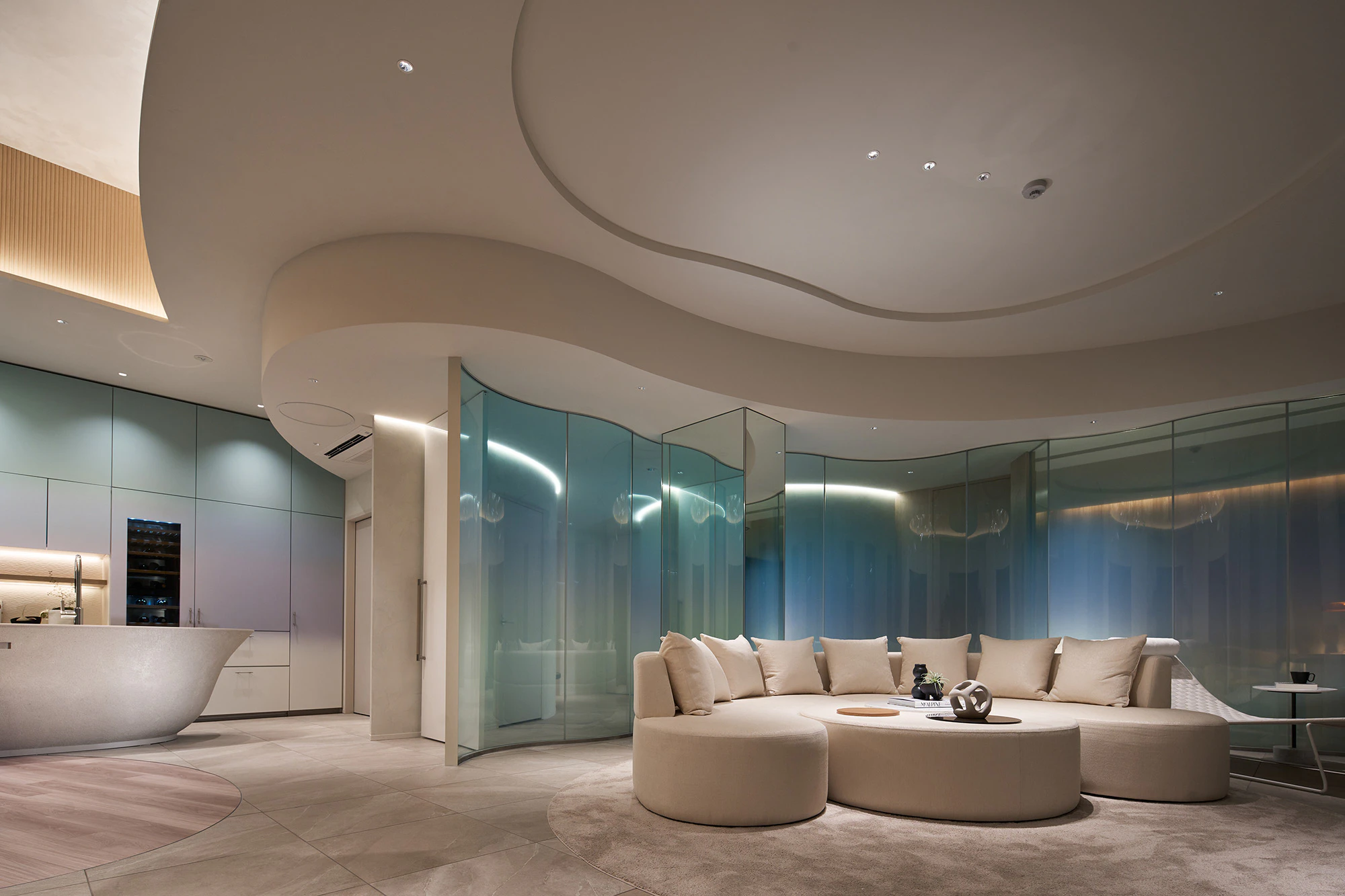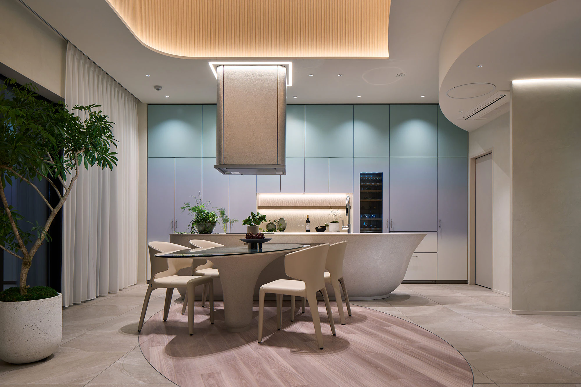 In the penthouse of an exclusive skyscraper in Jūsō, an Osaka district undergoing a transformation, Nozomi Zama has created a high-design haven. Organic shapes and sophistication are key to this project, with unique details such as the gradient in the kitchen furniture, the artwork that dominates the ceiling of the living room, the upholstered corner overlooking the breathtaking view, or the sculptural island. All of this makes the project highly imaginative in itself, but its workmanship is even more atypical when one considers the country in which it is set, Japan.