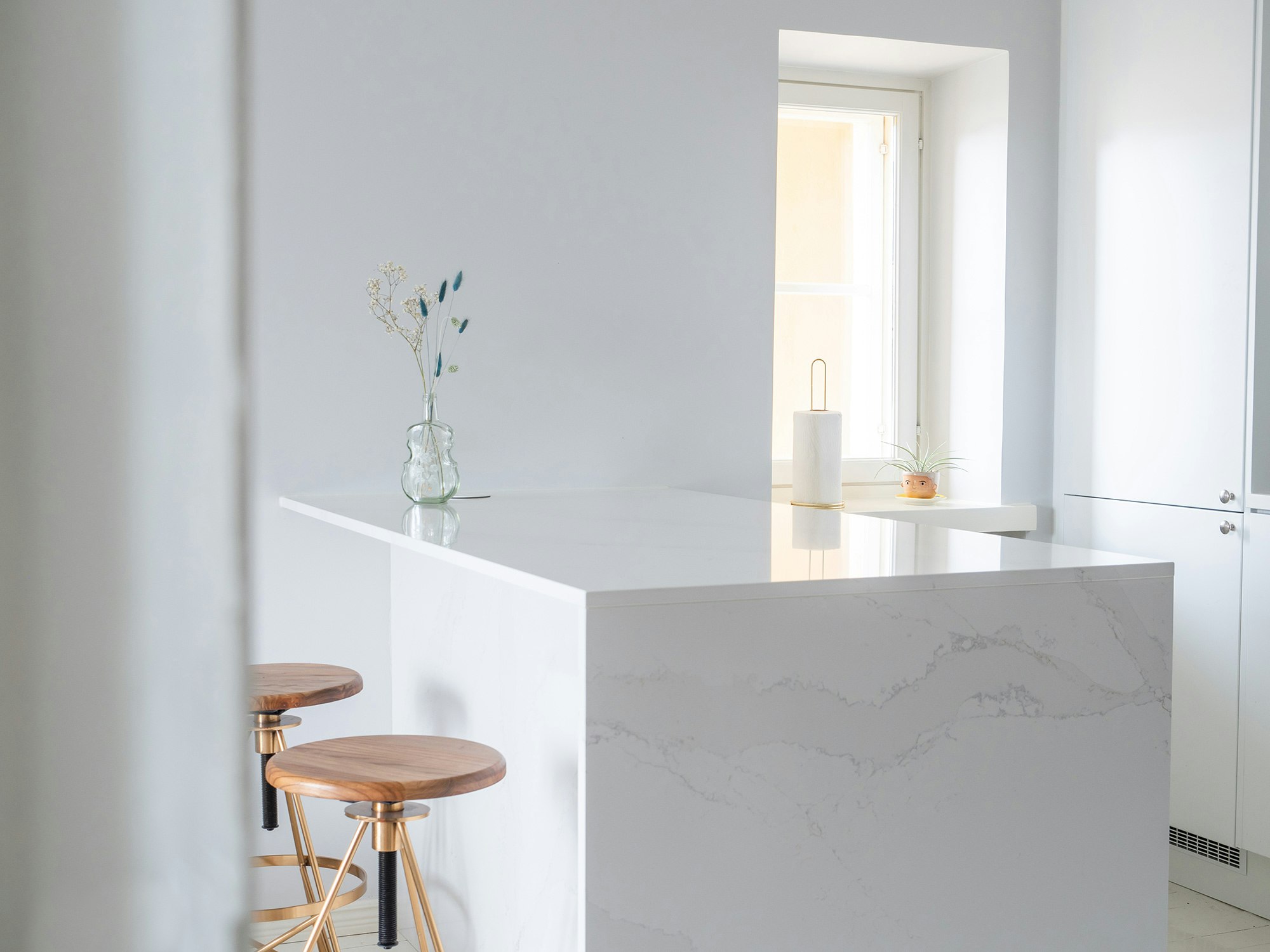 ‘The end result is stunning,’ says the actress. The renovated island now has a calm and serene appearance thanks to the colour Et. Calacatta Gold, whose grey veins and gold details against a white background create a timeless and very elegant atmosphere. ‘The worktop requires very little maintenance while remaining luxurious and inviting,’ says Tomnikov.