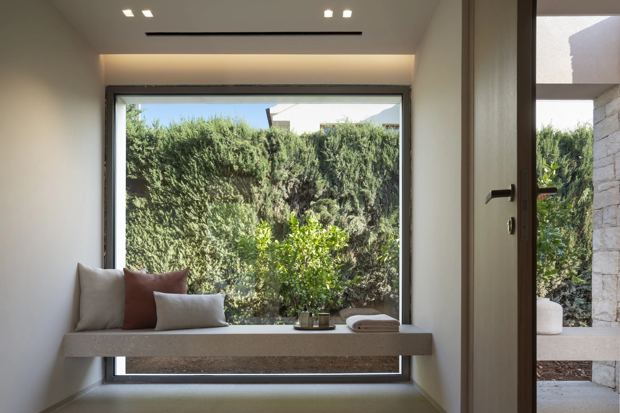 Outdoors, the same material extends to the terraces and the pool area. The pool basin and the perimeter of the water surface are made of Dekton Avorio, allowing a direct transition between interior and exterior without material changes.