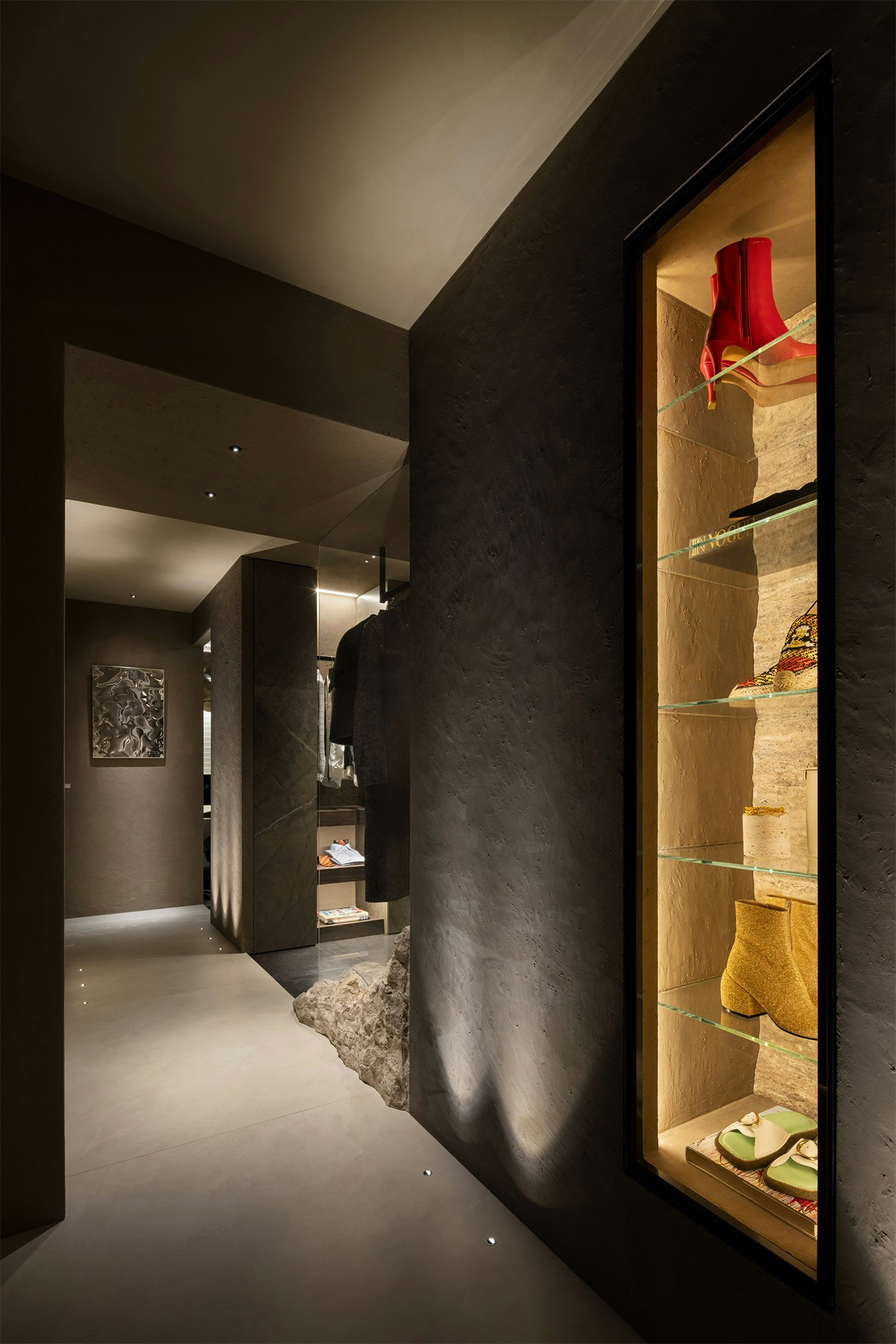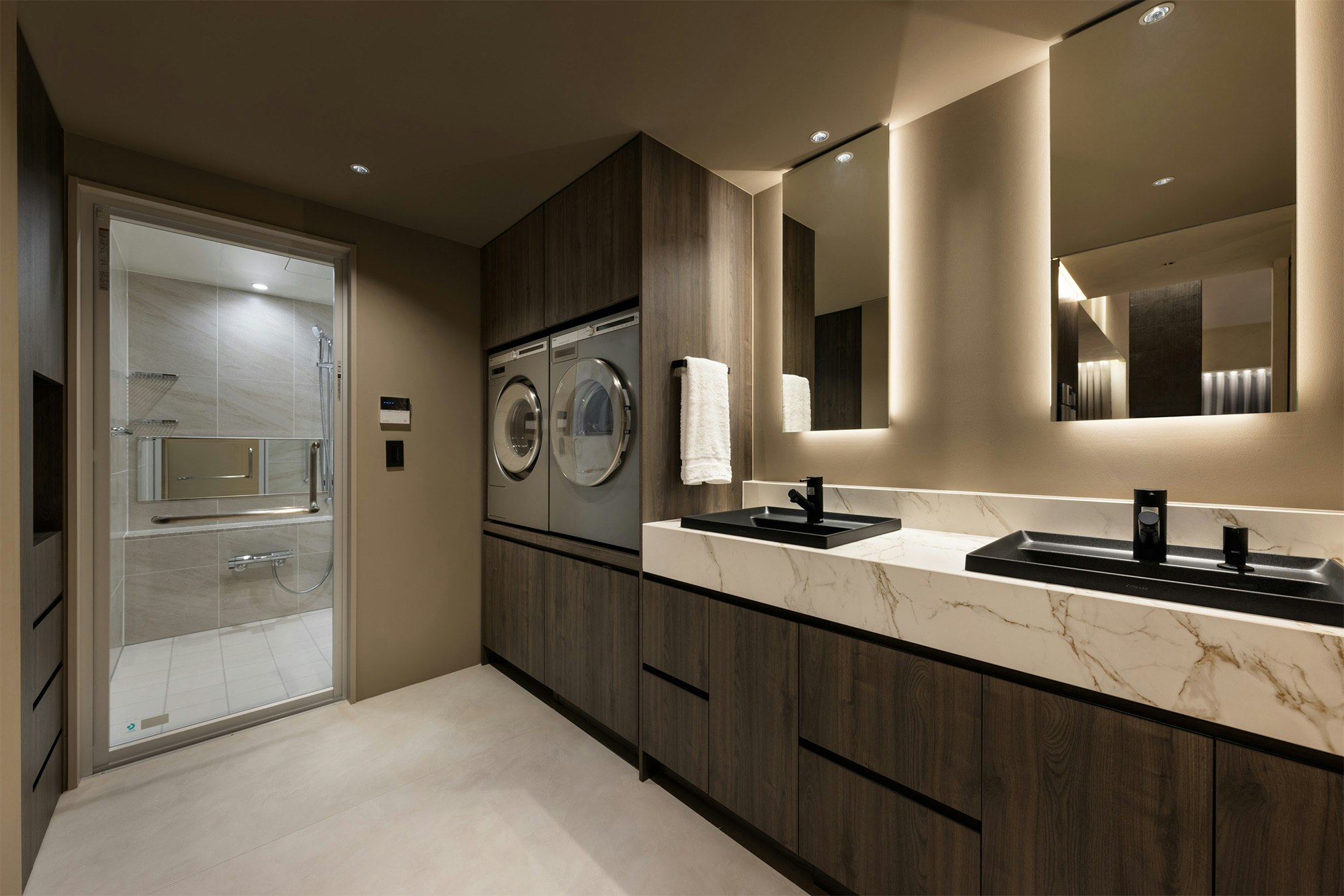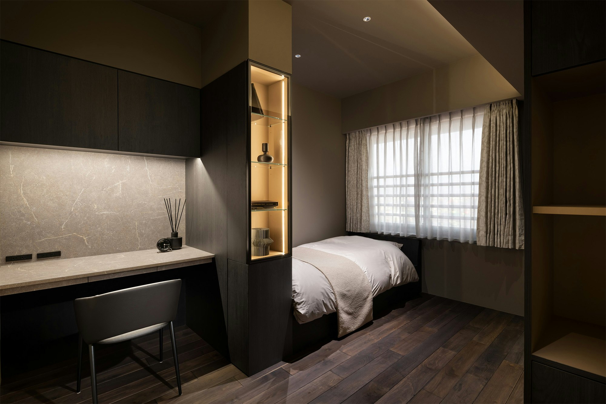 In an exclusive apartment in Osaka, operated by LOUCA and the Infinity Group / IXS studio, Japanese designer Yosuke Muramatsu has transformed a conventional space into a sophisticated and contemporary grotto overlooking the city from above. Through the strategic use of dark tones, ambient lighting, and carefully selected surfaces, the interior design of the project evokes an intimate and refined atmosphere that makes the most of the material properties.