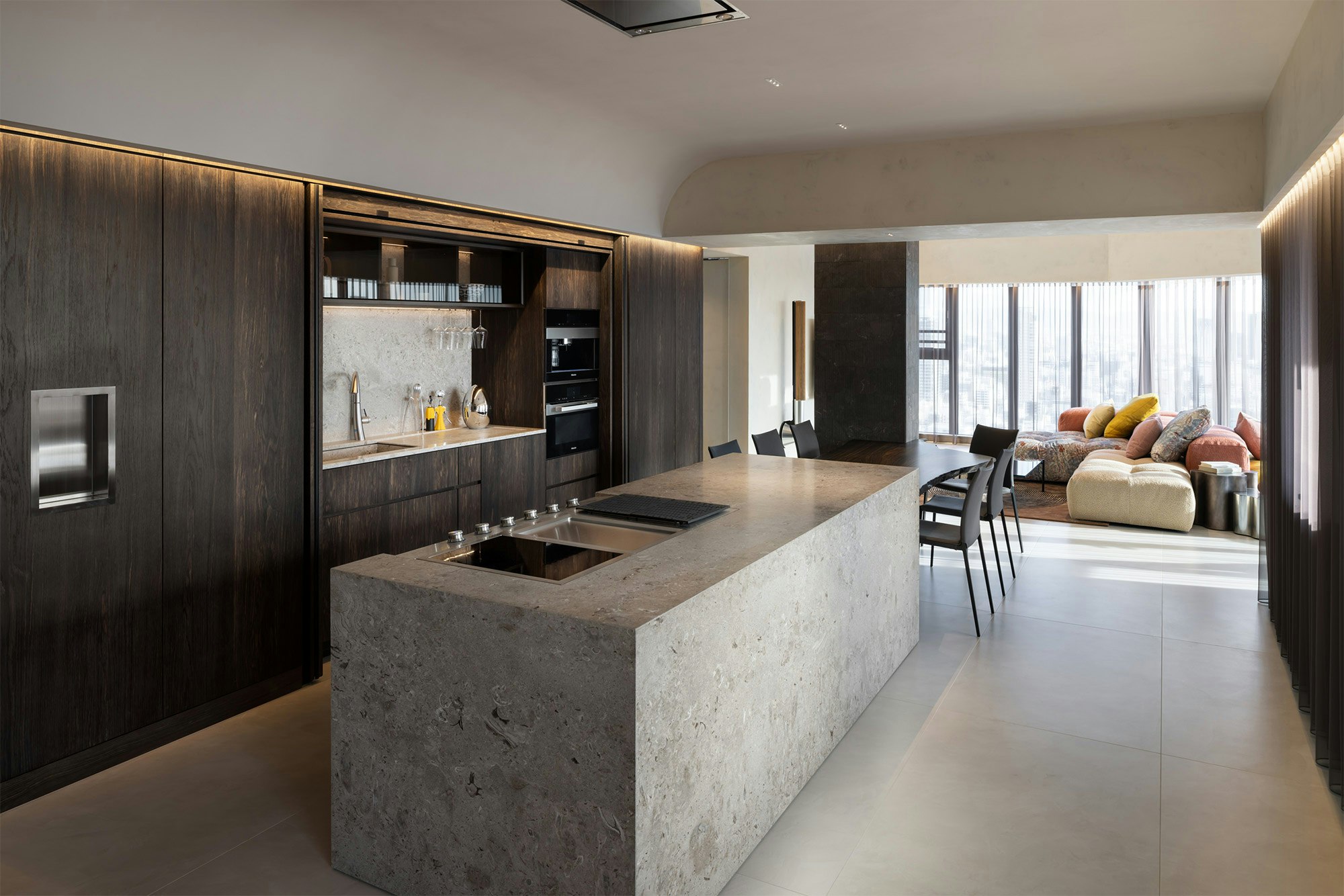 Each area of the apartment features a specific Dekton solution, designed for both practical use and aesthetic appeal. Muramatsu notes that “the selection of different Dekton surfaces for each space ensures functional and aesthetic coherence, contributing to the overall luxury of the project and its visual harmony.”