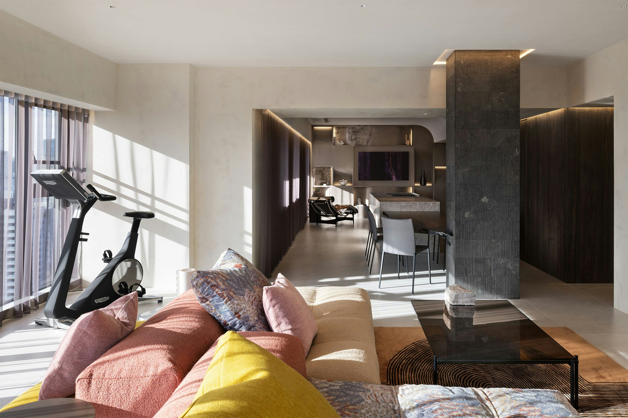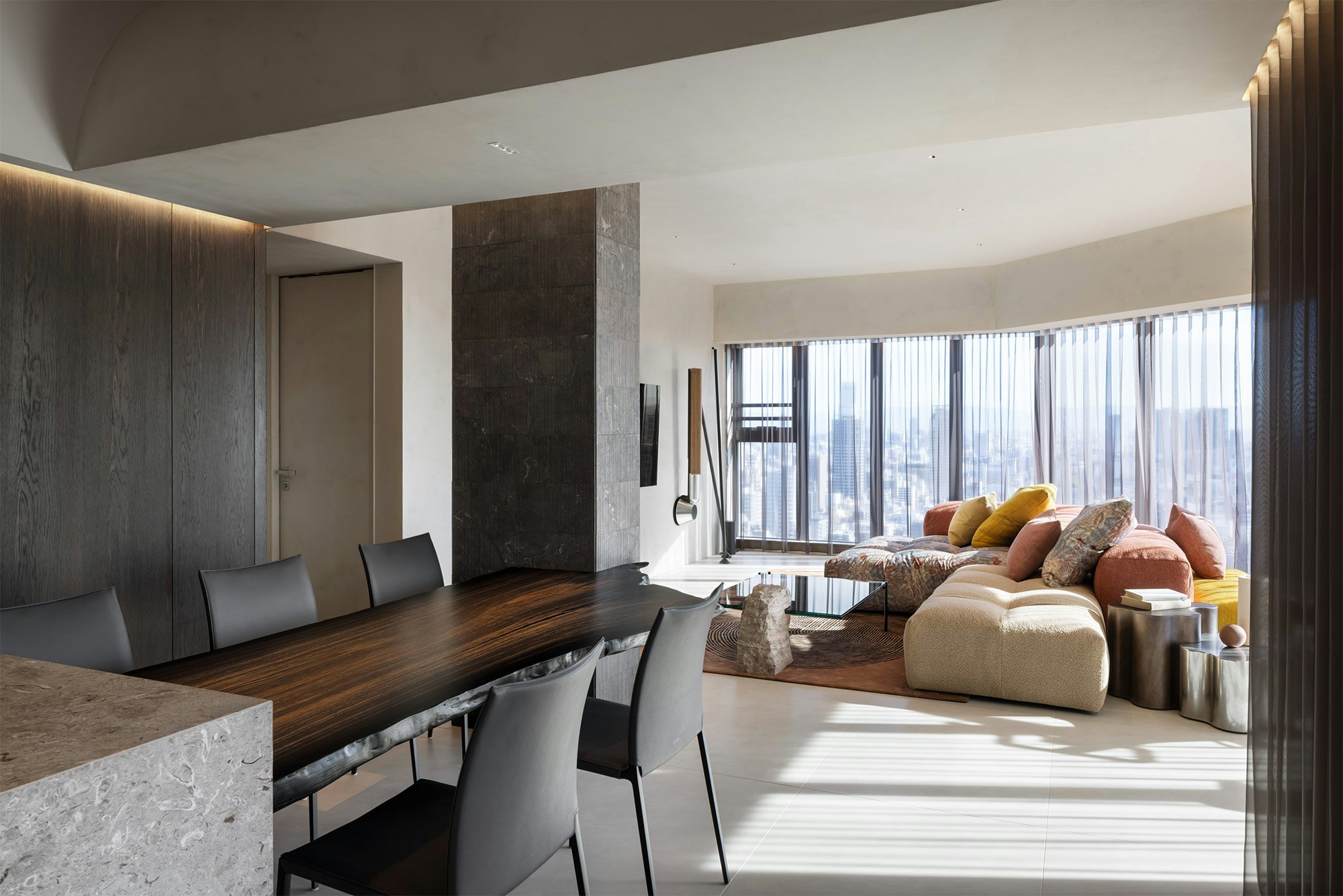 “The careful selection of materials enhances spatial qualities while maintaining a fluid and sophisticated design. The use of large-format Dekton slabs enhances spaciousness in common areas, while darker tones in key areas create a refined contrast,” explains Muramatsu about the main architectural and decorative feature of the apartment.