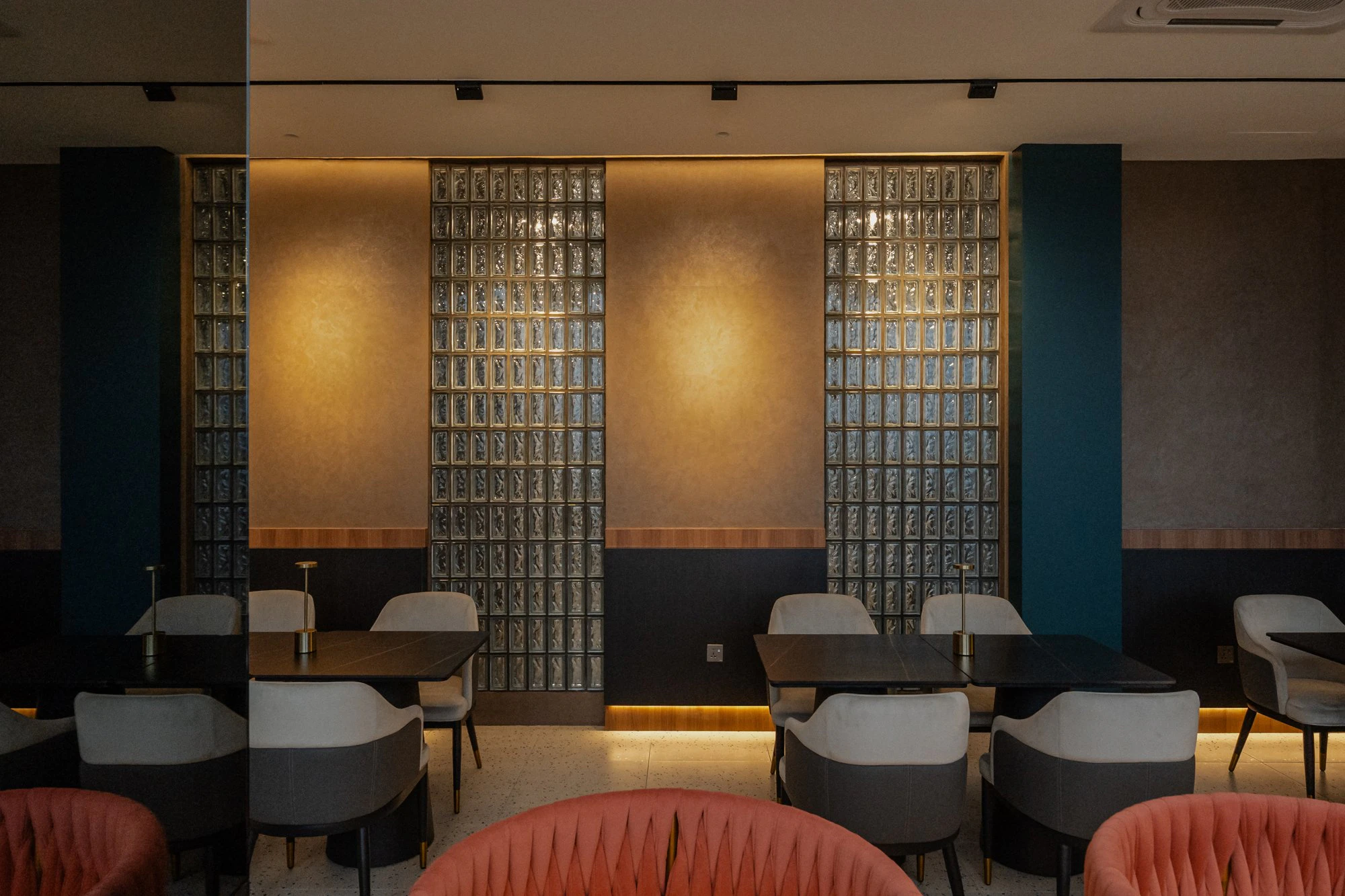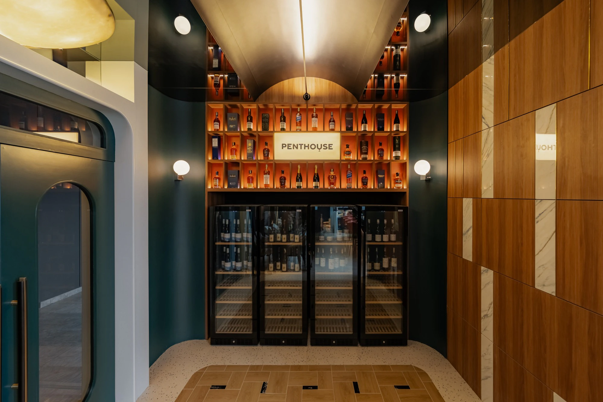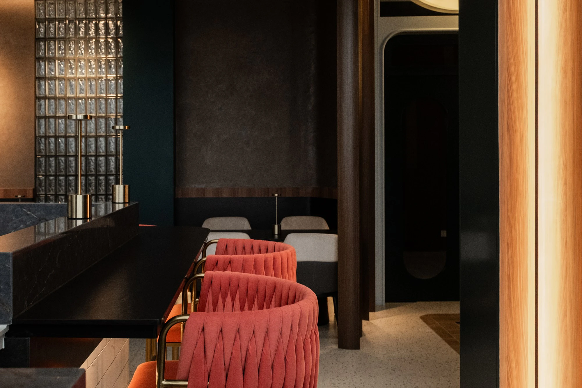 The entrance, clad with alternating wood and marble panels, leads to a wine cellar illuminated by warm light. In the main area, cream-toned upholstered chairs and coral-coloured woven stools face a robust bar, surrounded by soft textures and continuous surfaces. Glass block walls filter light subtly, while brass details and metallic reflections enhance the sense of understated luxury.
