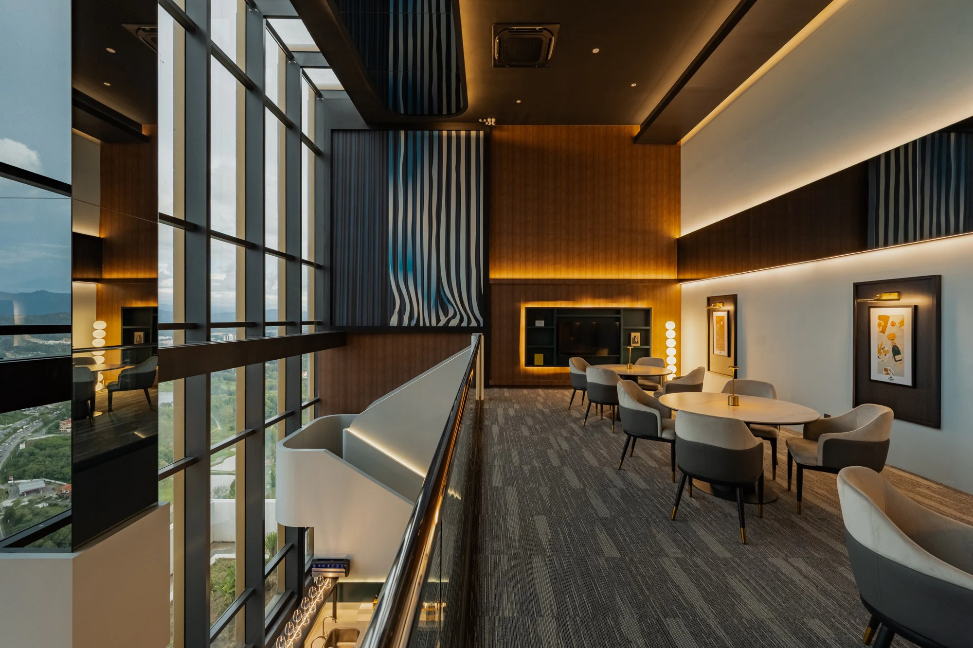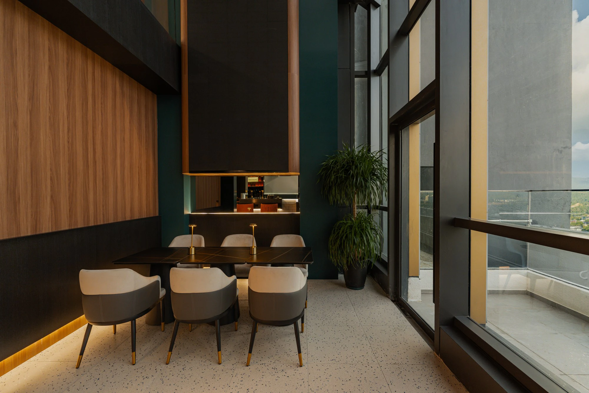 Located atop a building in Sabah, Malaysia, Penthouse Sky Cafe & Lounge represents a step forward in the sky lounge concept, offering a sensory experience that combines architecture, interior design, and landscape. Through its large windows, the space opens up to spectacular views of the city and mountains, becoming a setting that changes with the daylight. The project, designed by MOM Designer House for the client Penthouse, is a tribute to height, “to the feeling of being suspended in the air, between the clarity of dawn and the nocturnal glow of the city,” as they explain.