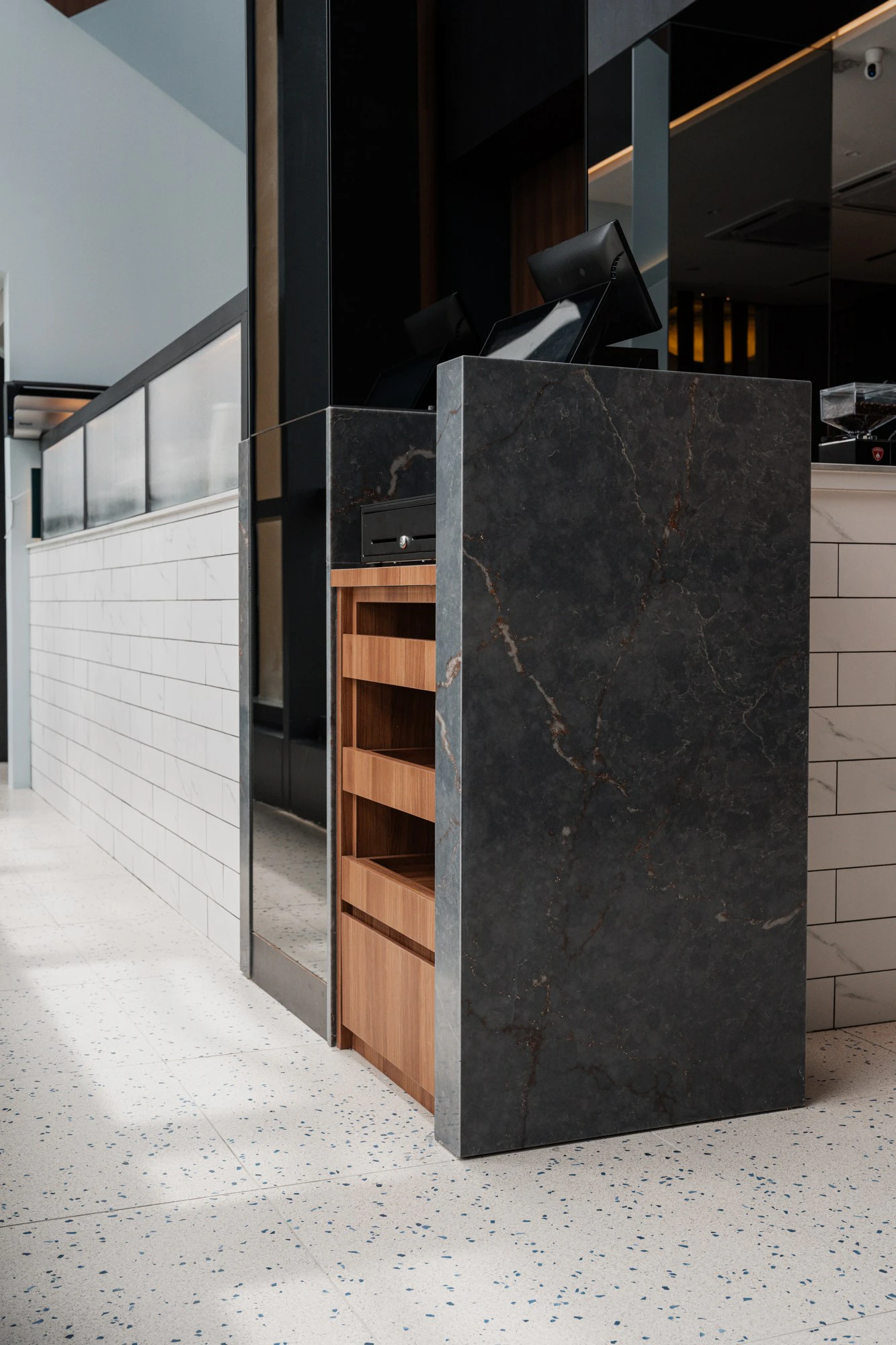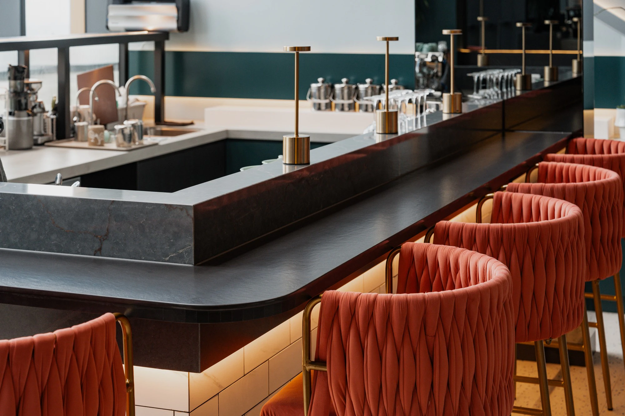 Other materials from the brand complete the composition. In the lobby, Dekton Trance adds warmth and texture by cladding part of the wall, while Silestone Bohemian Flame creates golden nuances and visual depth, extending the amber glow of the displayed bottles into the interior.