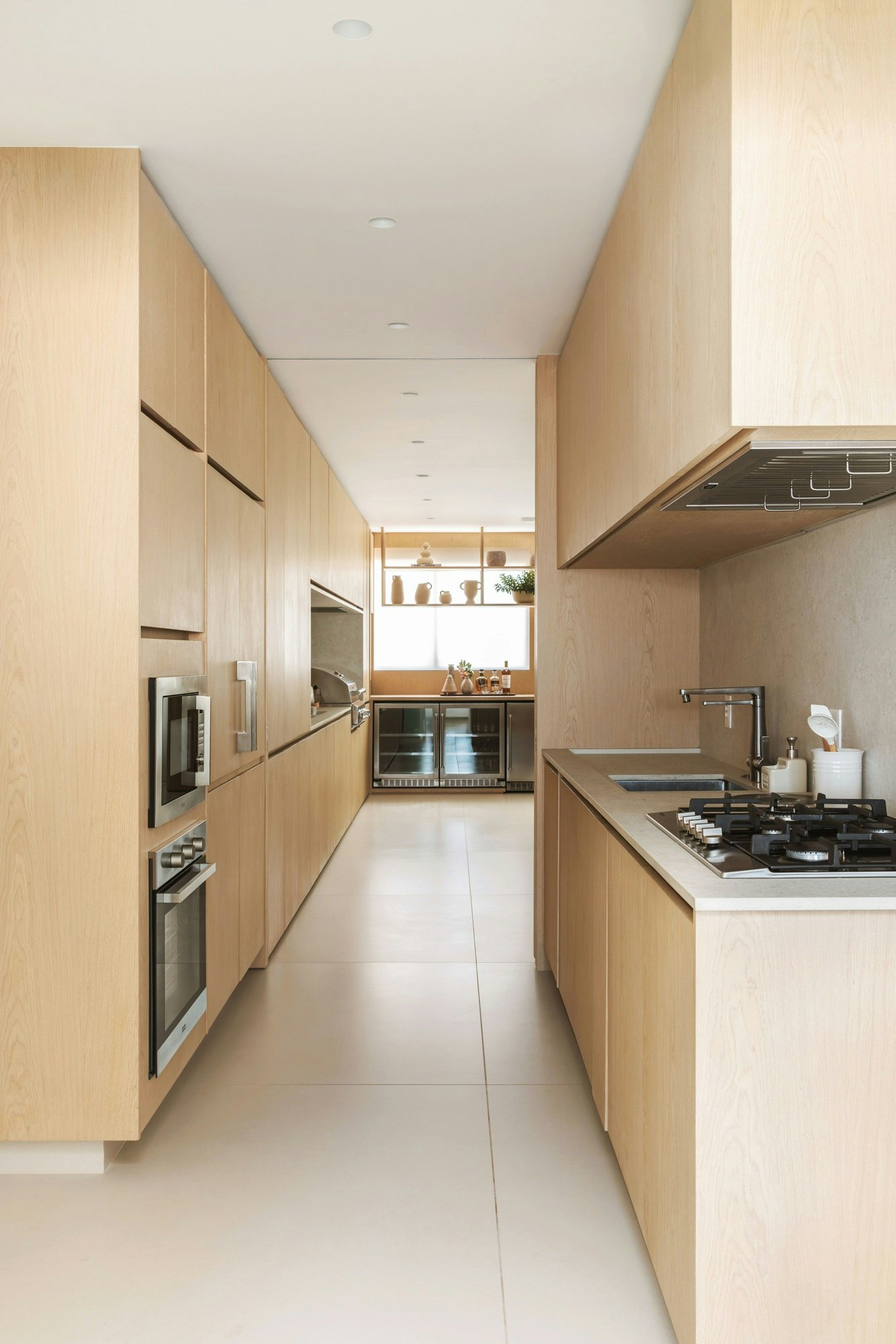 For the flooring of the living room, hall, kitchen and service area, the architect opted for Dekton Aeris, applied in 8 mm thick slabs. Inspired by the natural stone White Limestone, Dekton Aeris features light tones with subtle cream nuances, providing luminosity and a sense of spaciousness to environments.