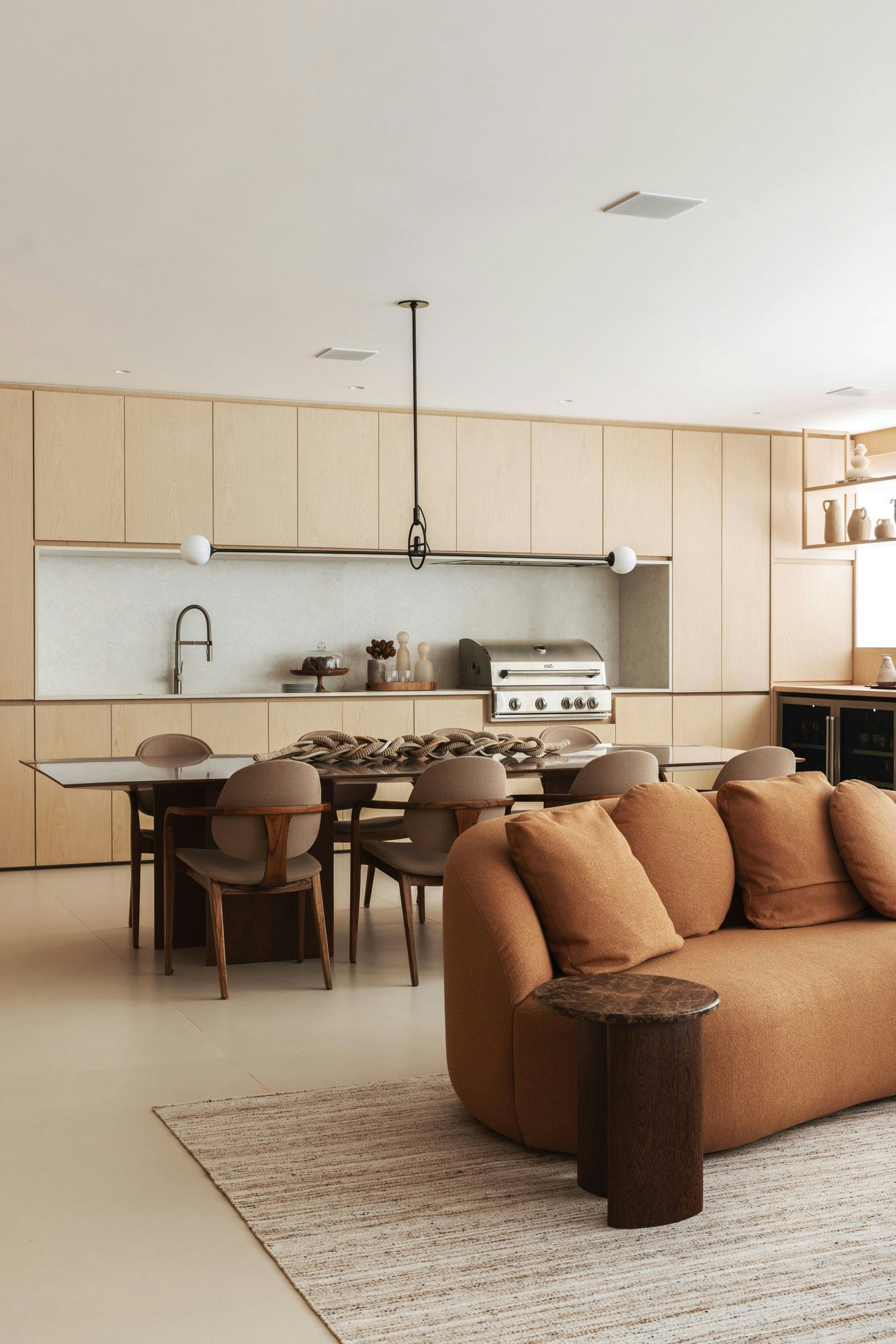 In addition to its smooth aesthetic, the large-format slabs (3200 x 1440 mm) provide visual continuity and a reduced number of joints, a choice that reinforces the concept of integration and fluidity between spaces, without sacrificing the material's characteristic resistance.