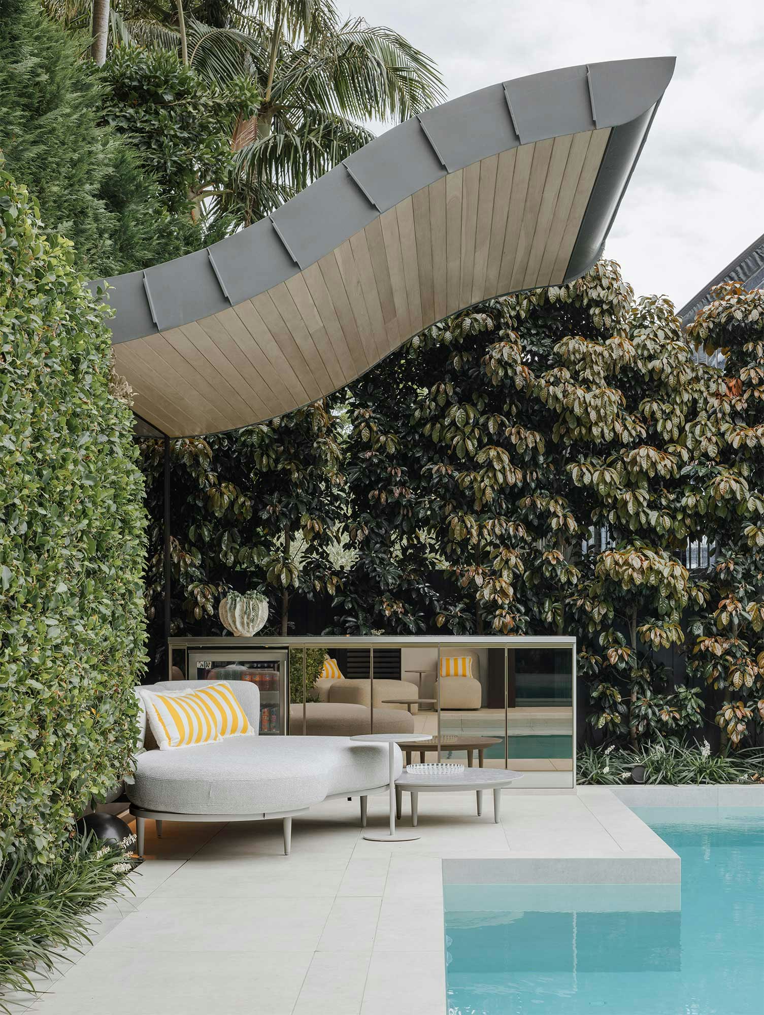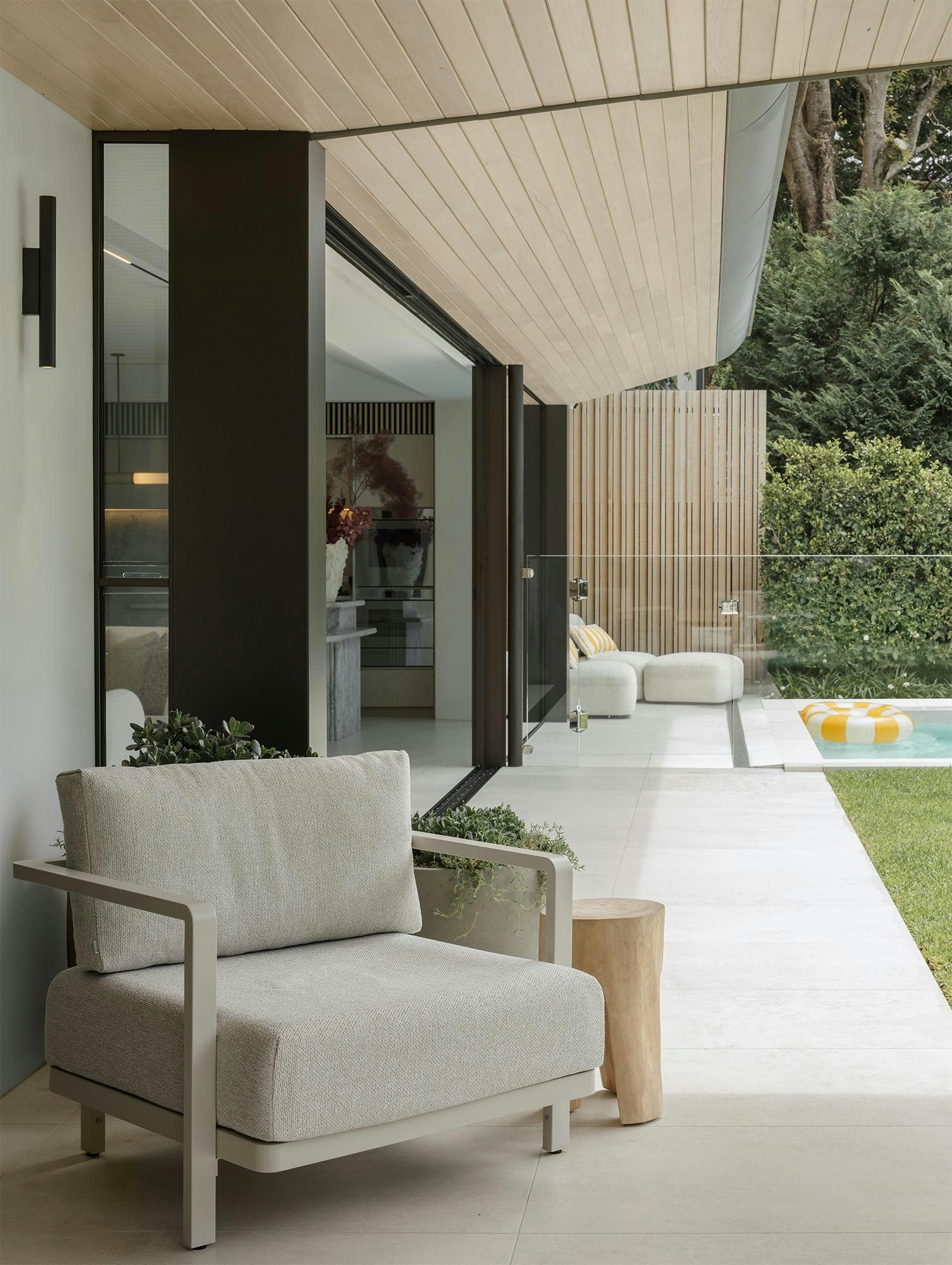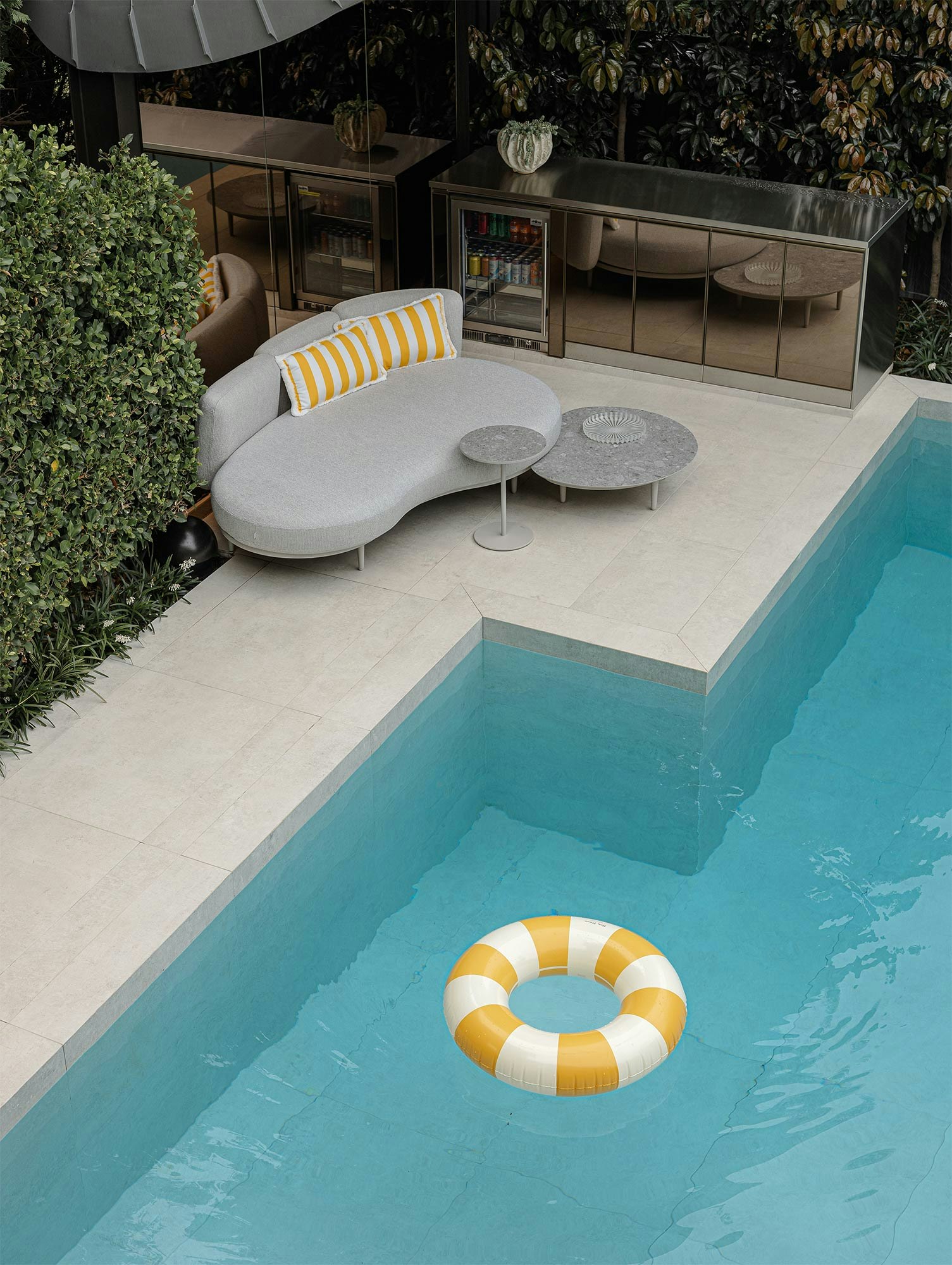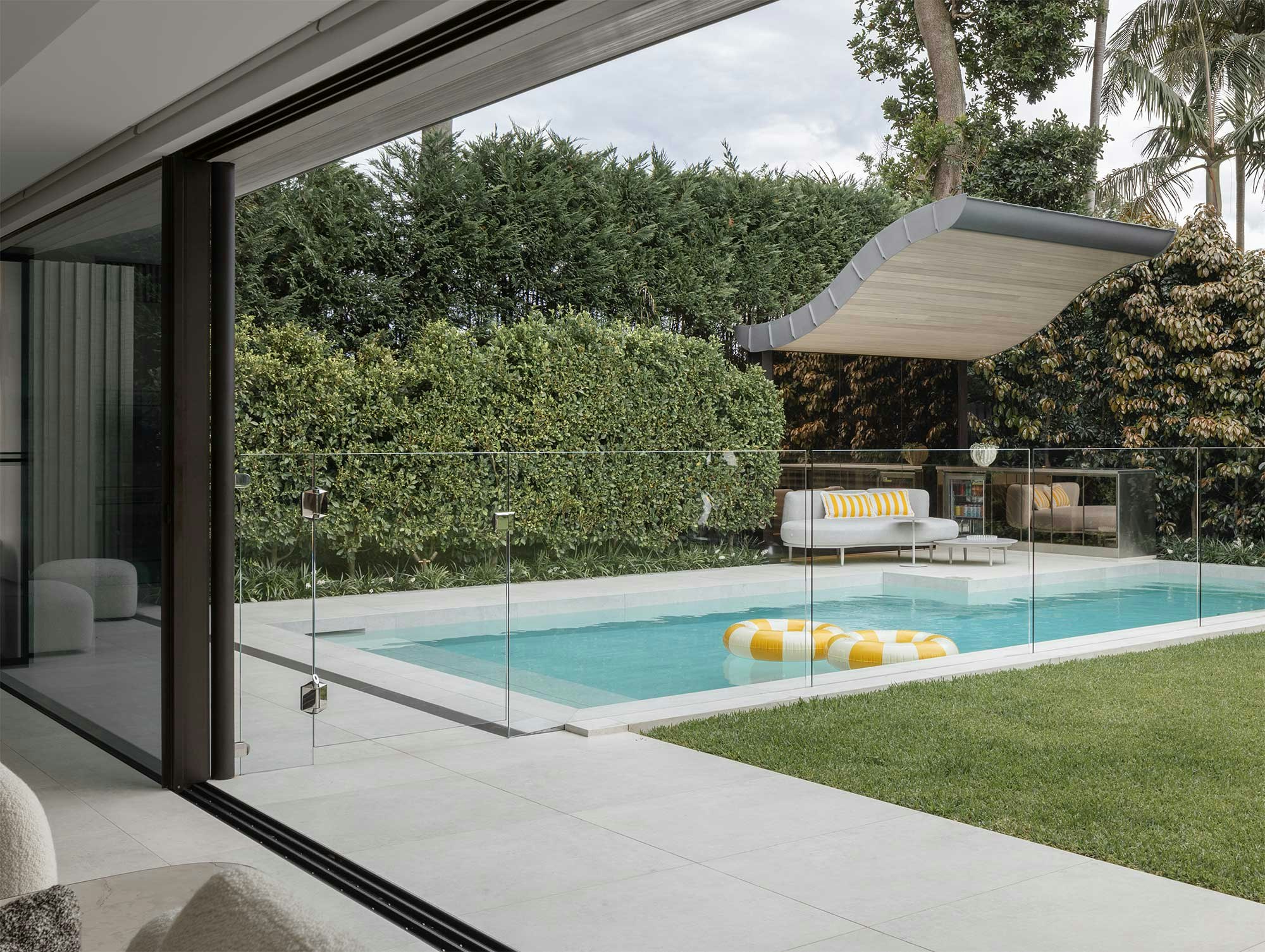 For interior designer Kirsten Stanwix-Bookallil, this material continuity was key to enhancing the sense of spaciousness: “The client wanted as much garden as possible, so it was important that the interiors flowed effortlessly to create a sense of space. The use of the same tile throughout the house and pool area provides a smooth transition that is not consciously noticed, but is undeniably felt”.