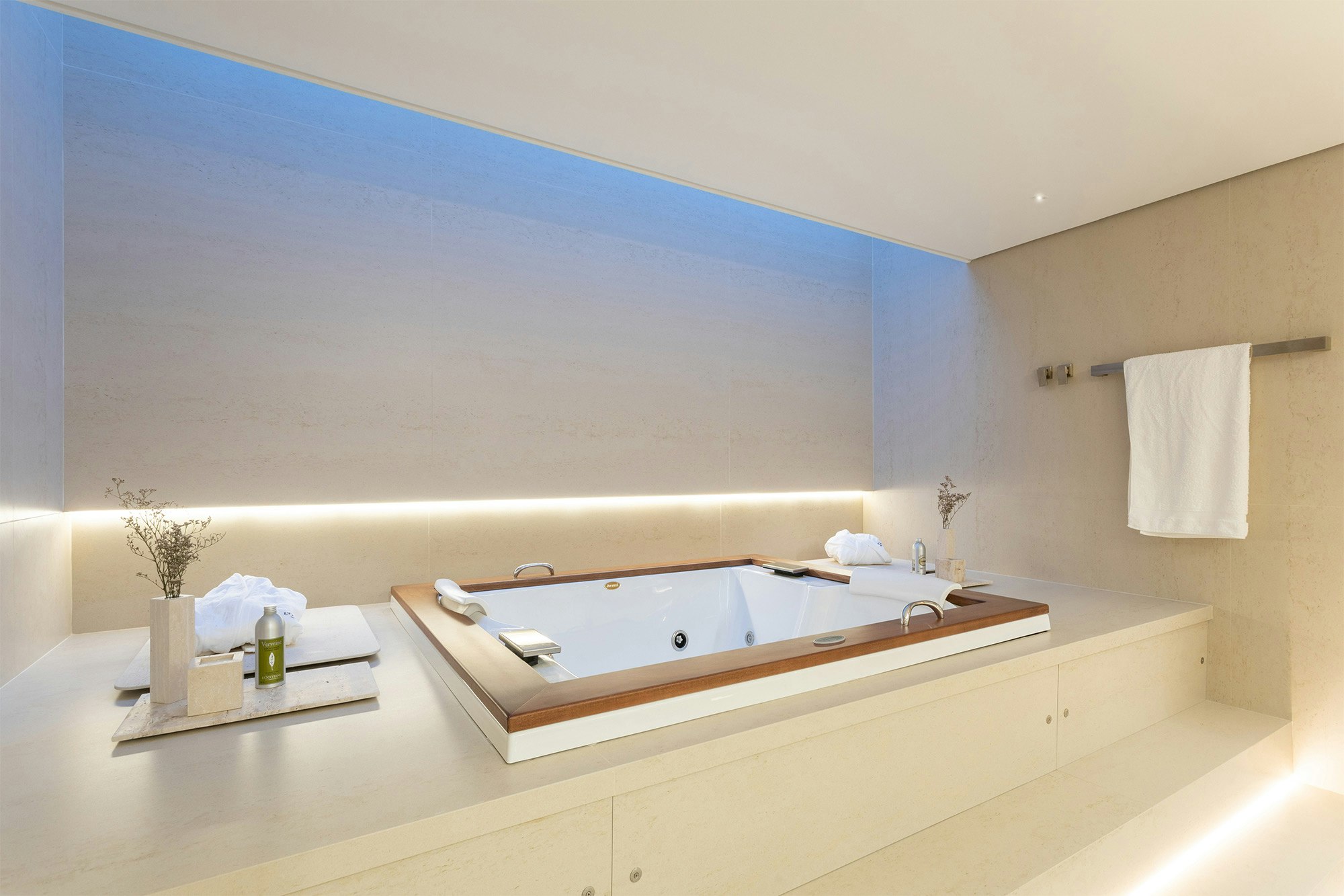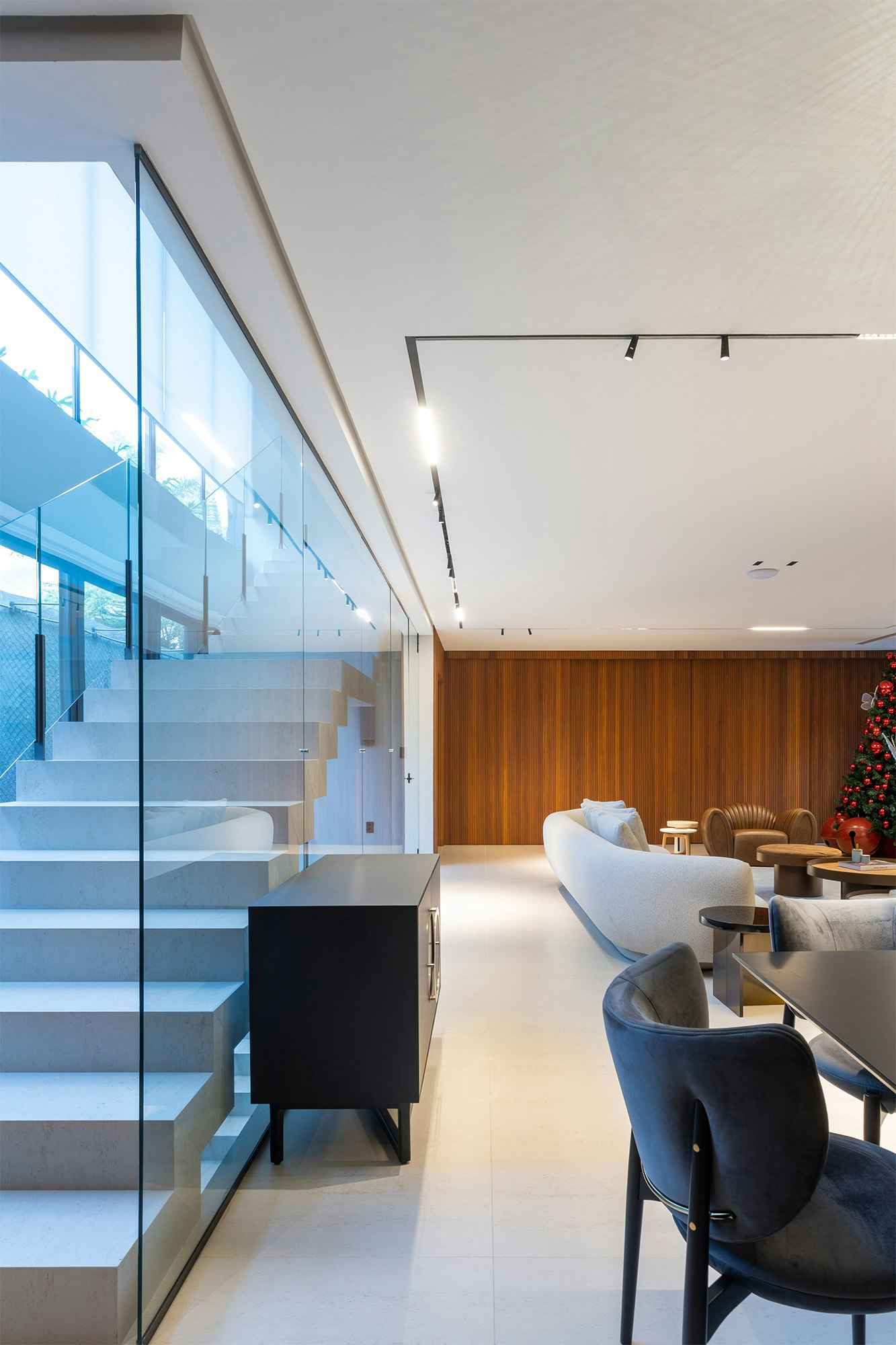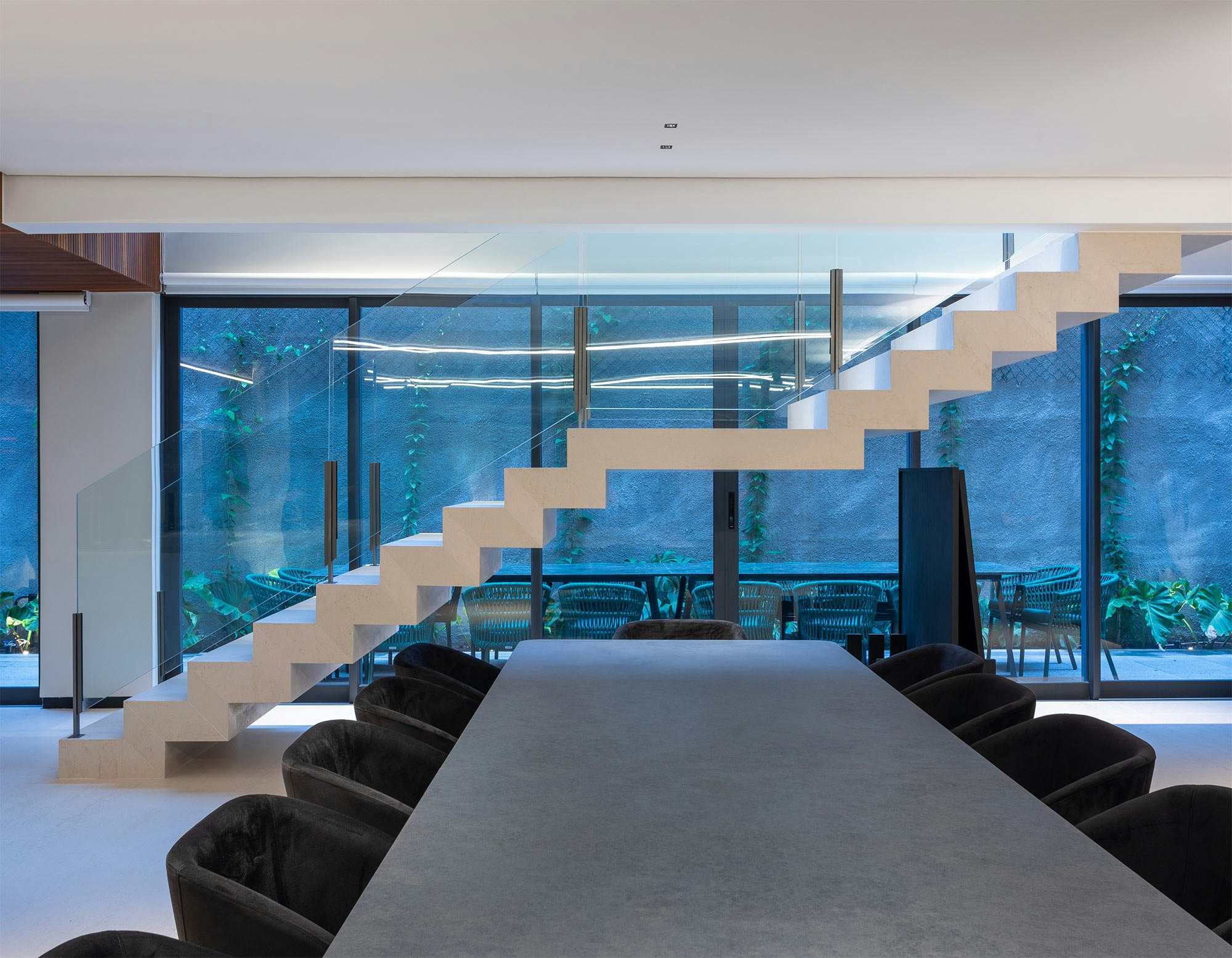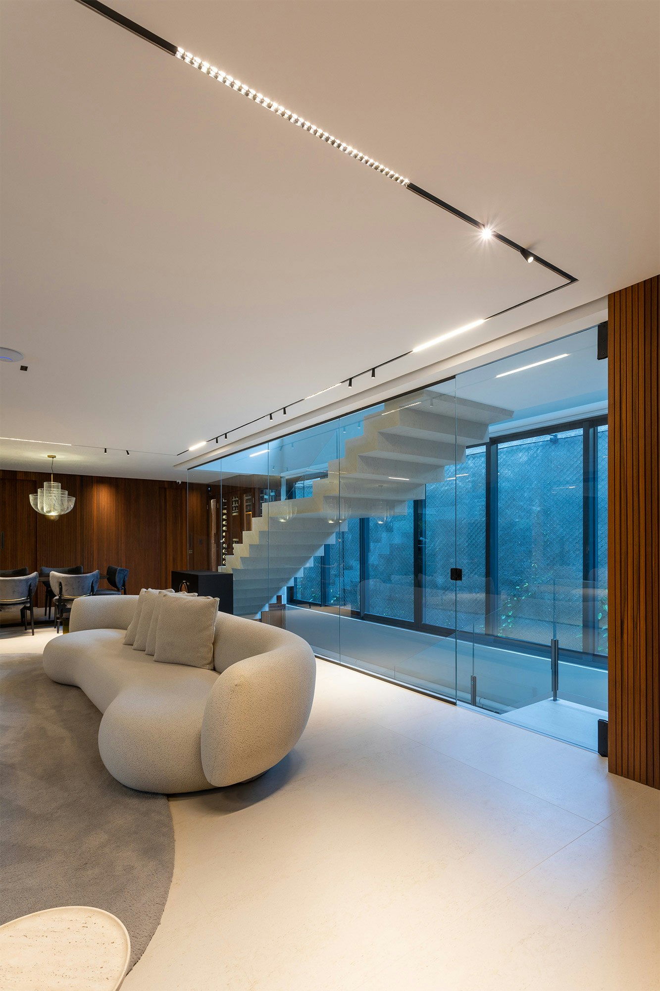 The choice of colors also plays an essential role in the composition of the spaces, and is enhanced by indirect lighting, which highlights the beautiful lines of the project.
