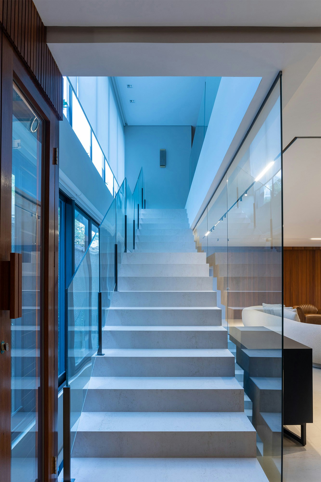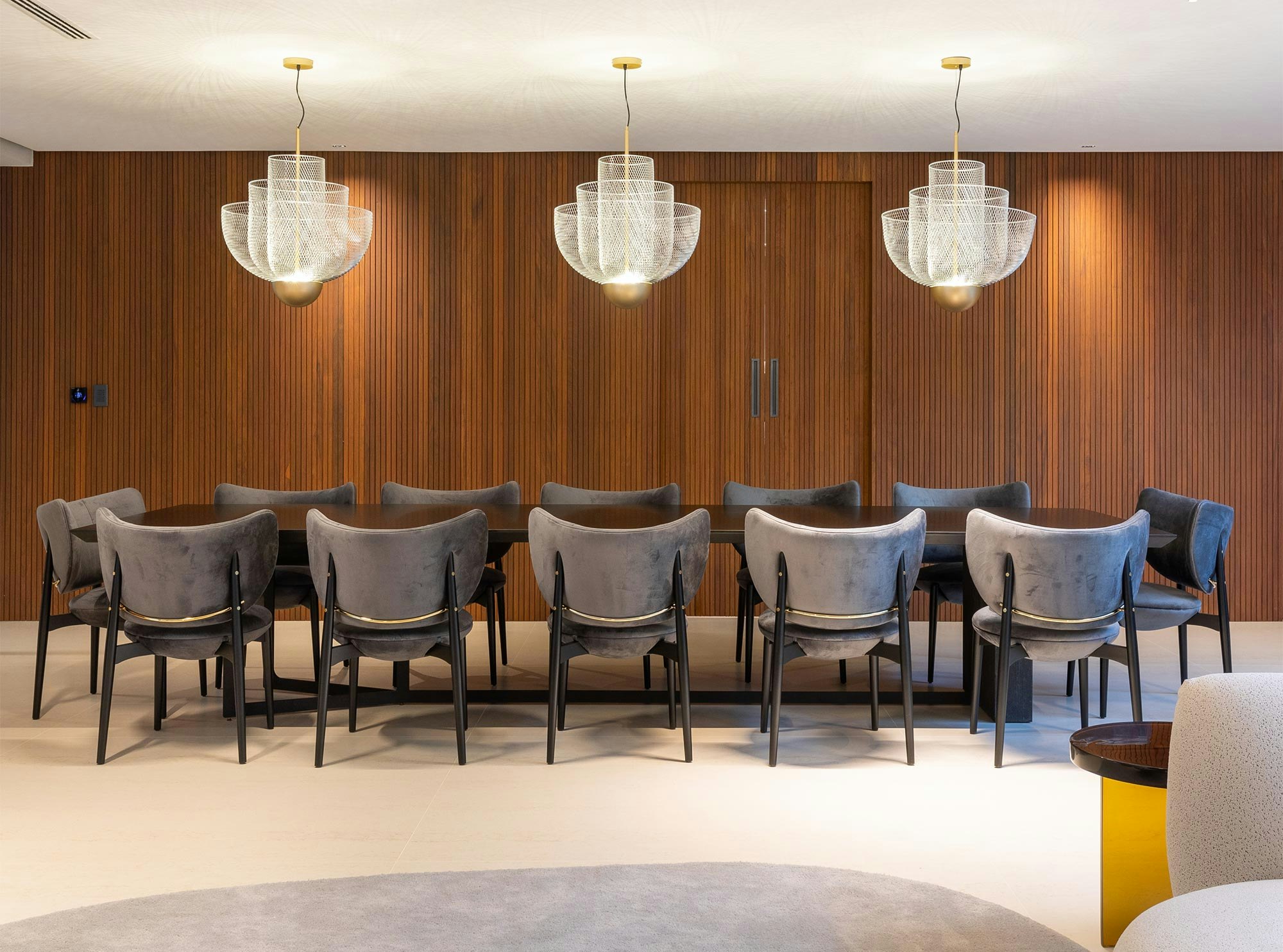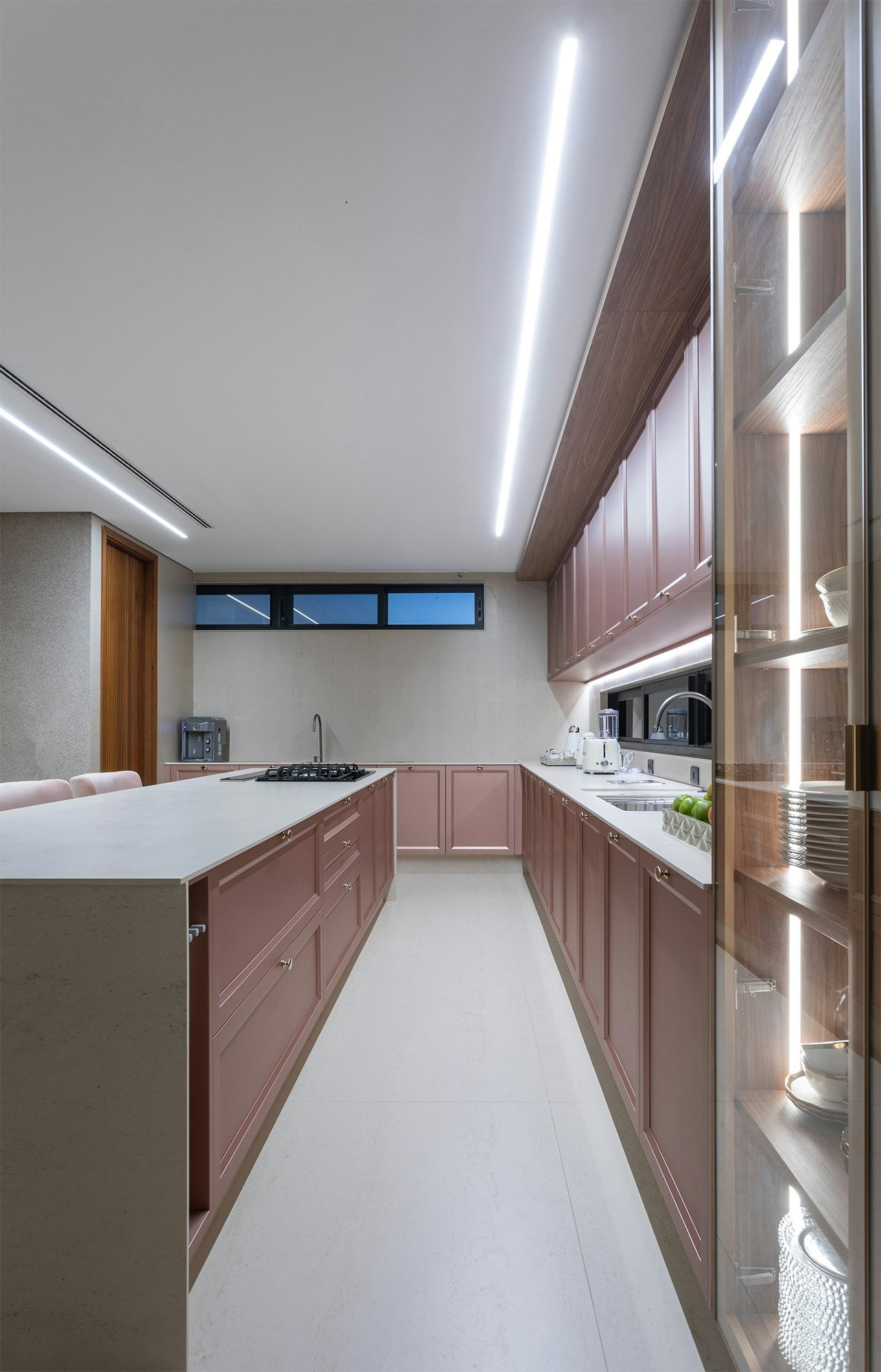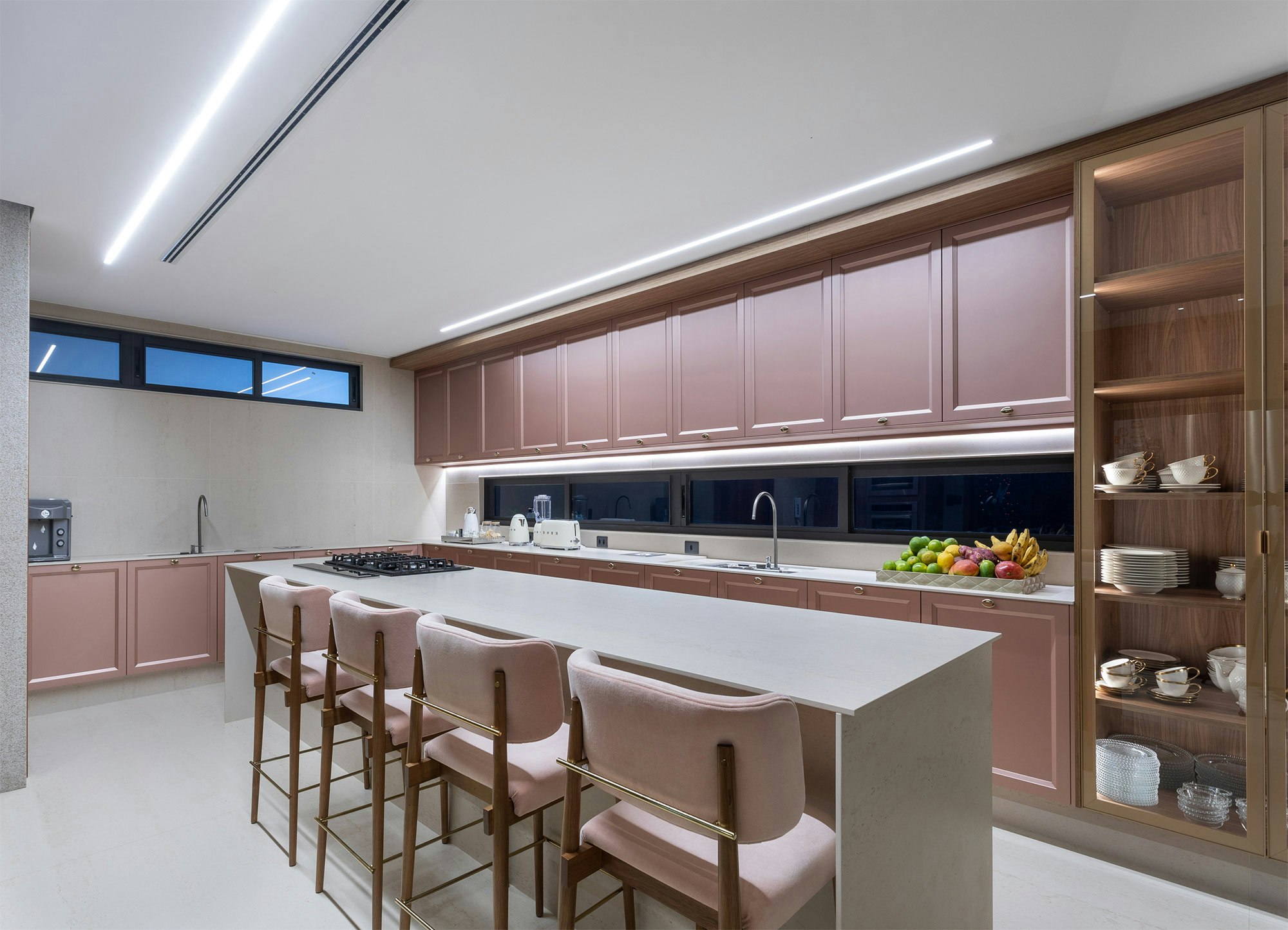 The choice of colors also plays an essential role in the composition of the spaces, and is enhanced by indirect lighting, which highlights the beautiful lines of the project.