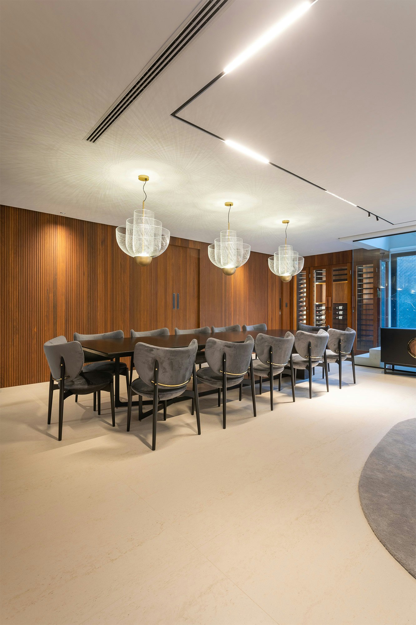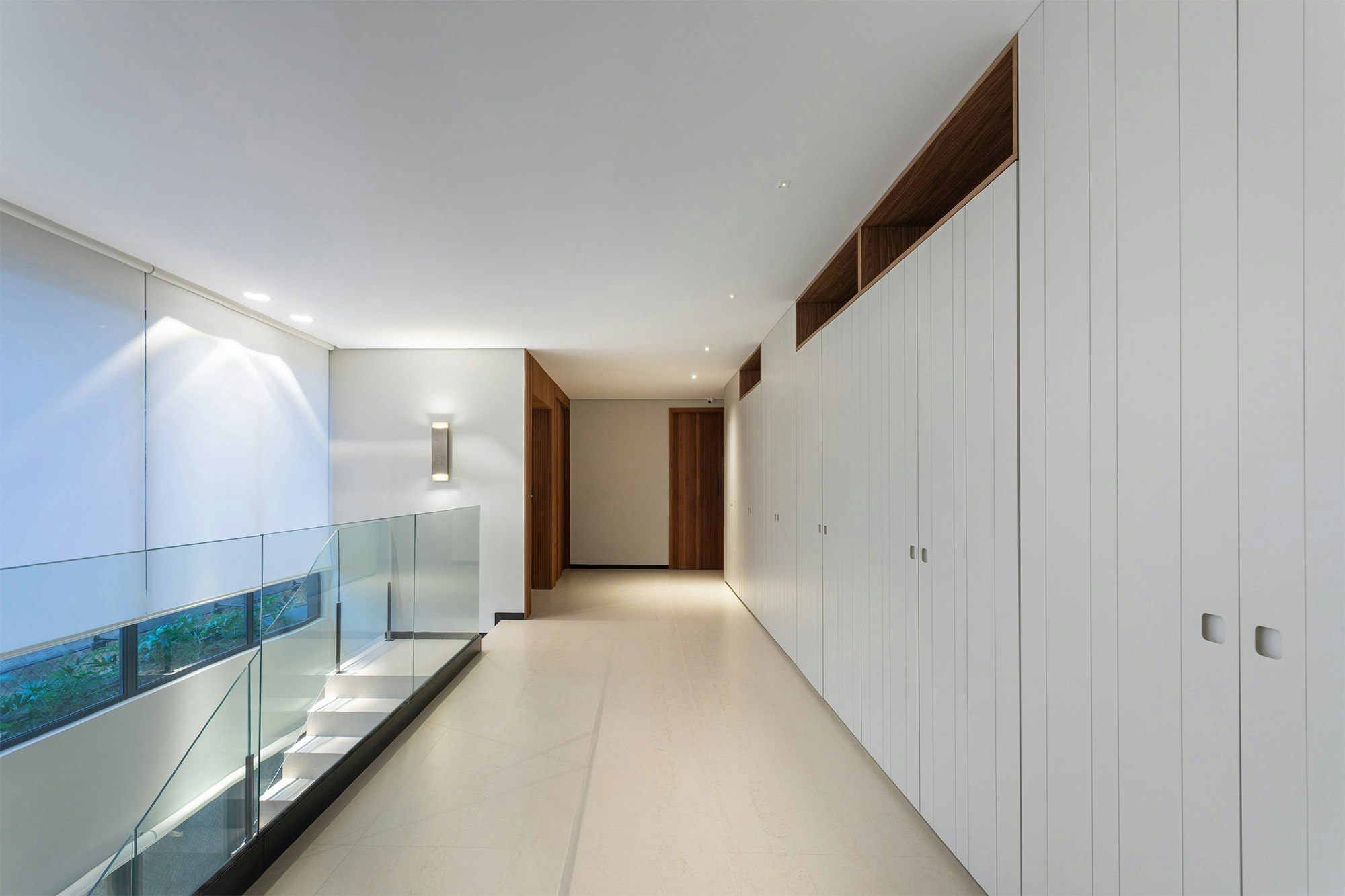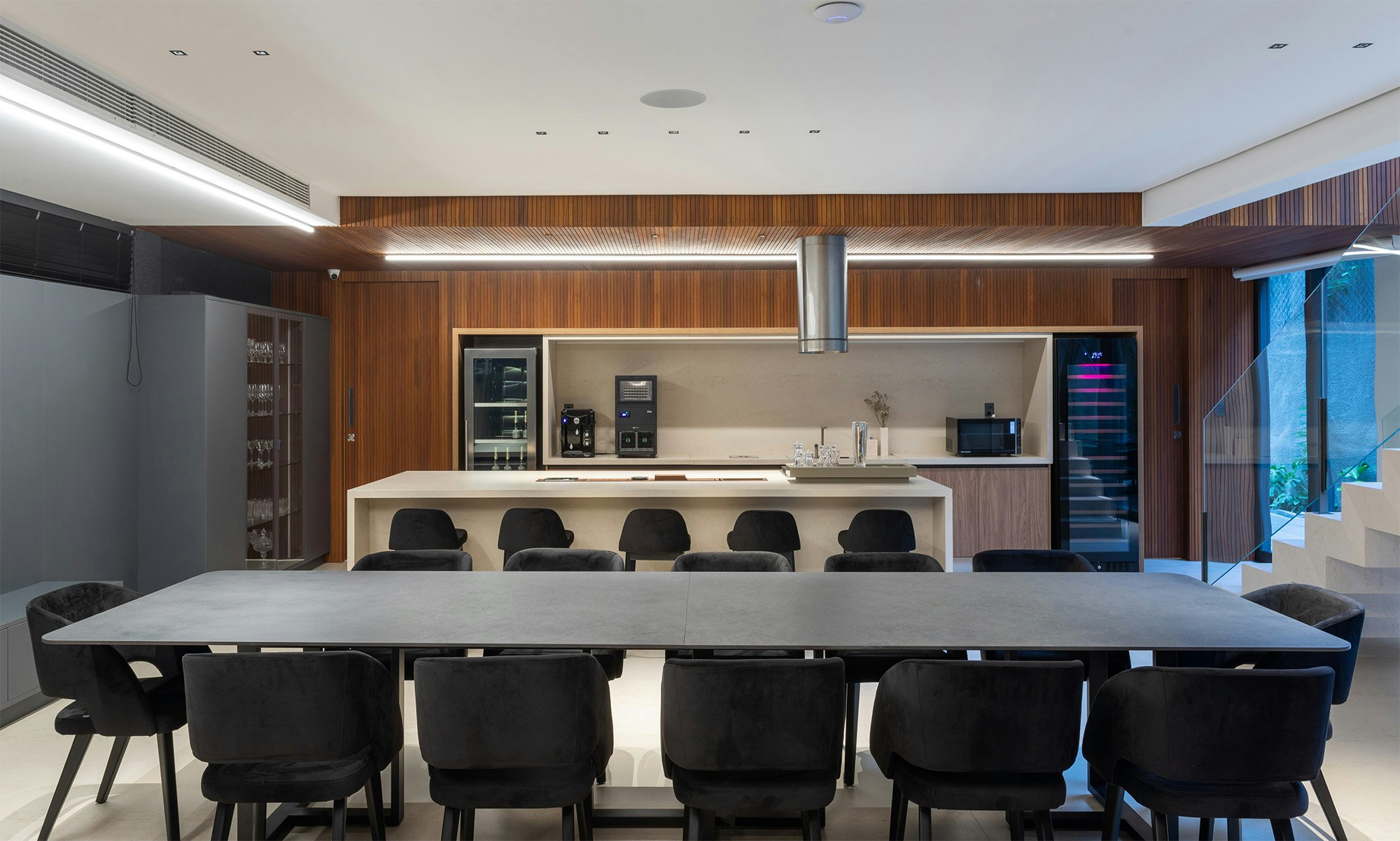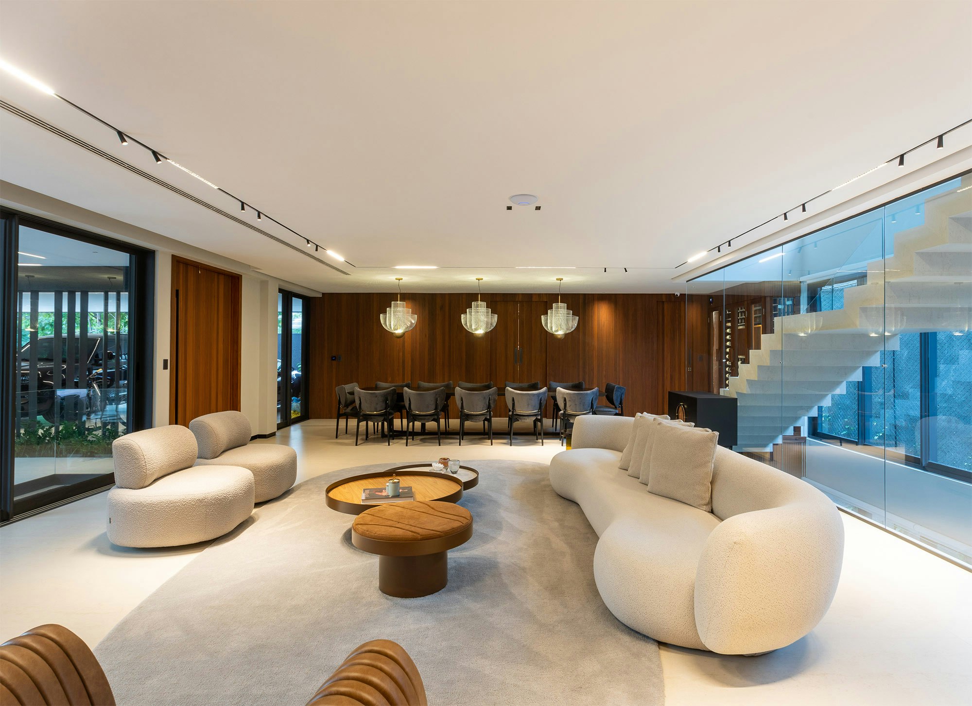 The choice of colors also plays an essential role in the composition of the spaces, and is enhanced by indirect lighting, which highlights the beautiful lines of the project.