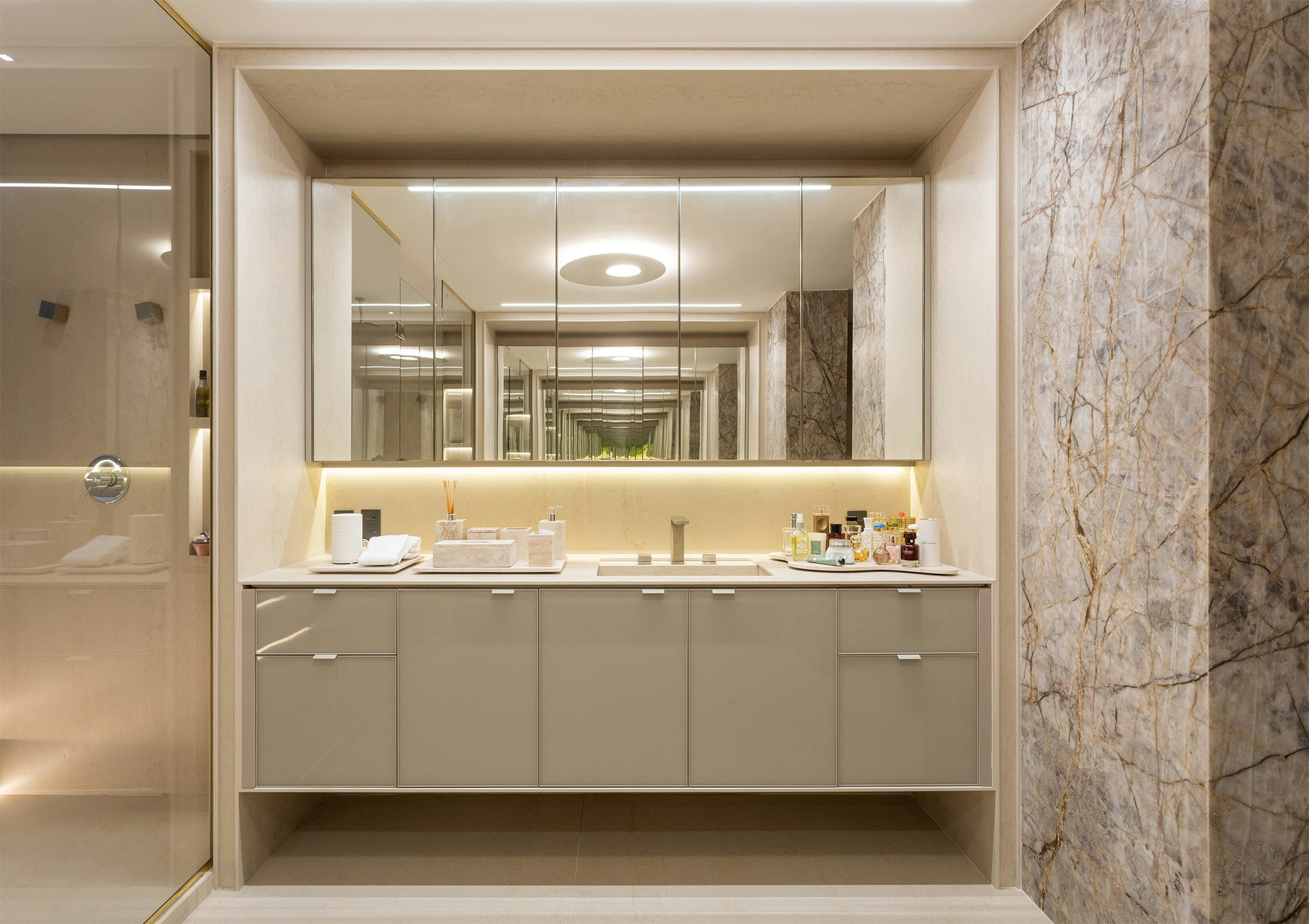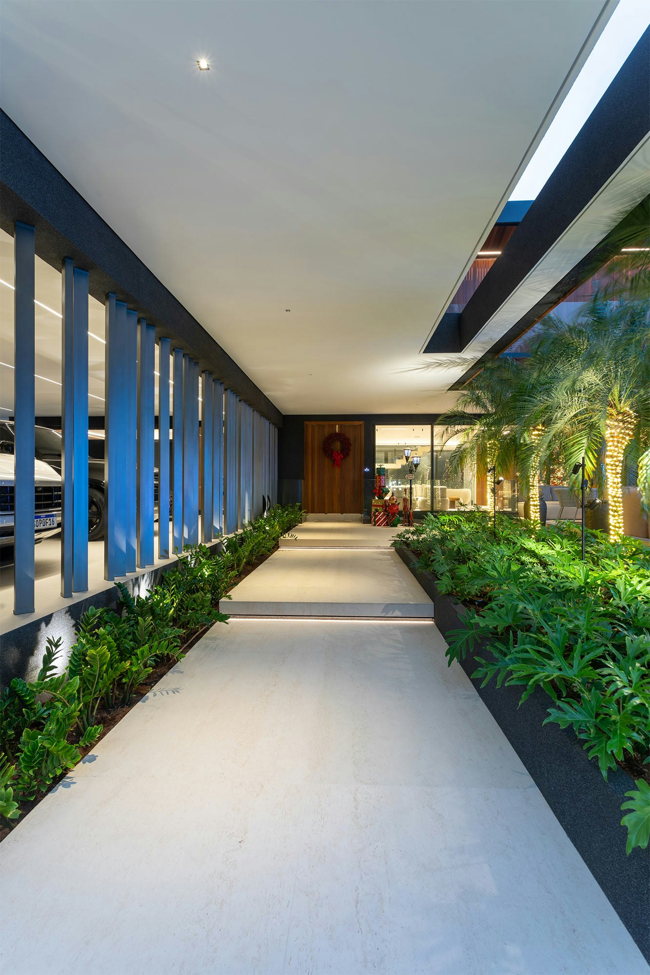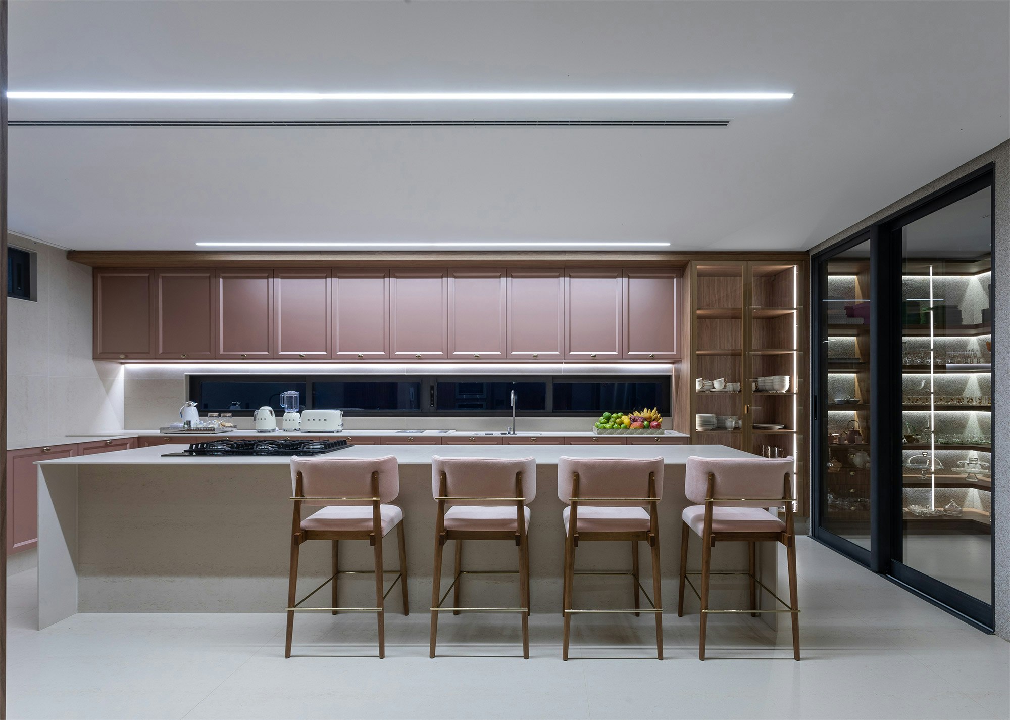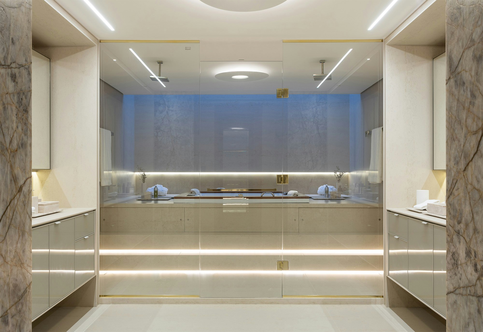 The choice of colors also plays an essential role in the composition of the spaces, and is enhanced by indirect lighting, which highlights the beautiful lines of the project.
