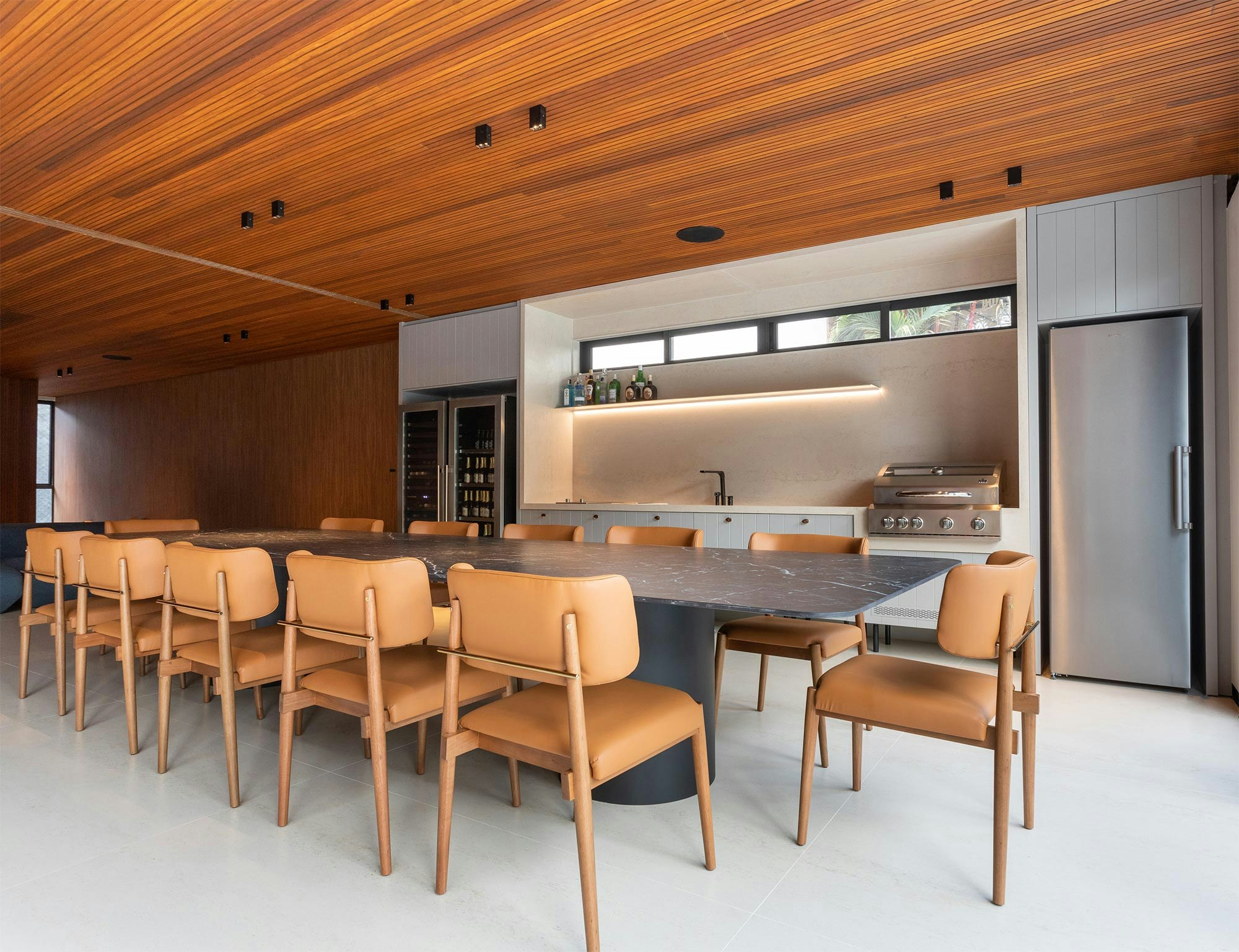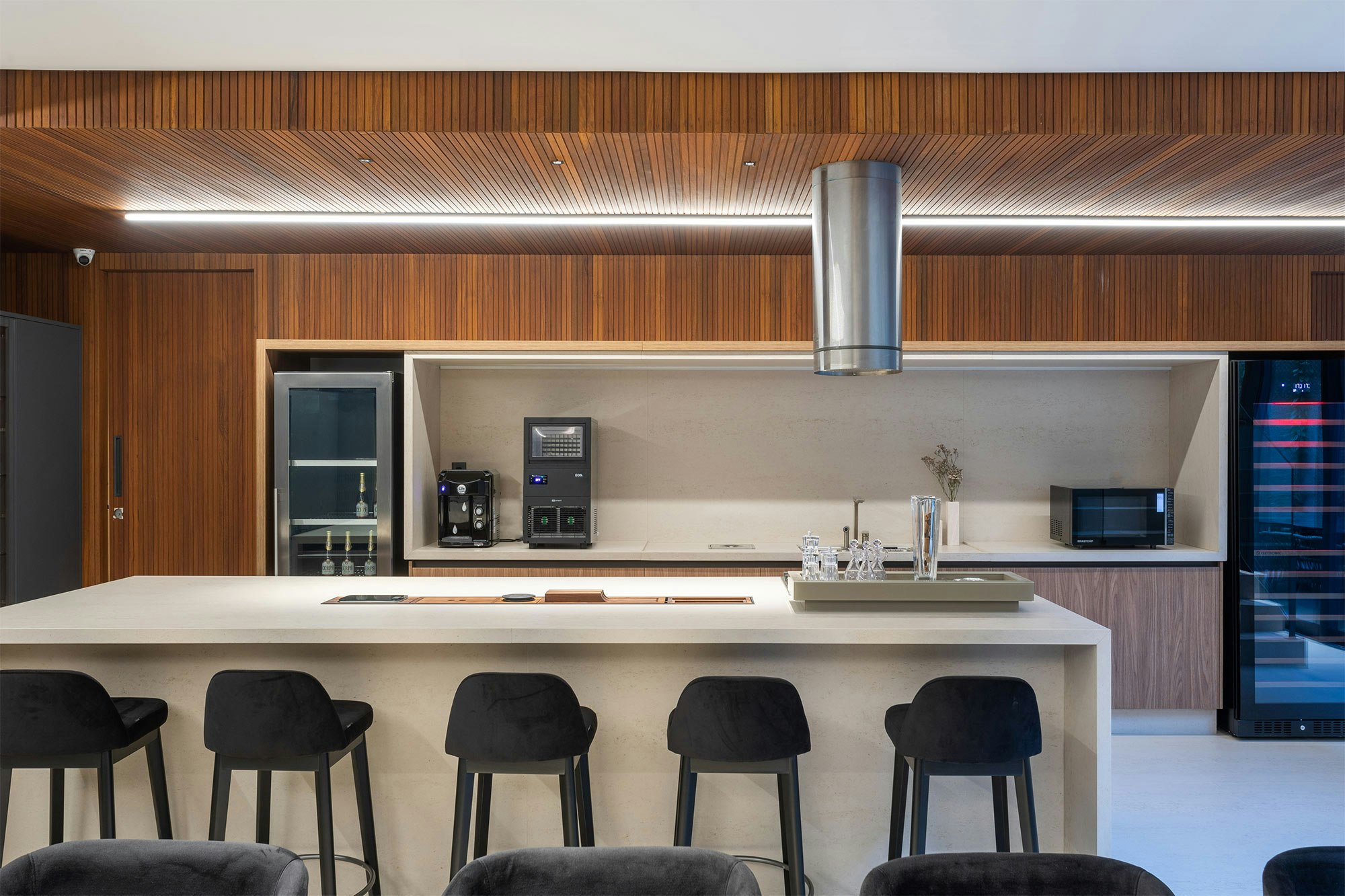 "Dekton was chosen for its wide variety of finishes and colors, adding sophistication and versatility to the project," says Bruna Sá. In addition to its aesthetic appeal, the ultra-compact material offers high resistance to impacts, heat and stains, as well as durability and ease of maintenance. Its non-porous surface prevents the accumulation of bacteria, making it ideal for areas with heavy traffic.