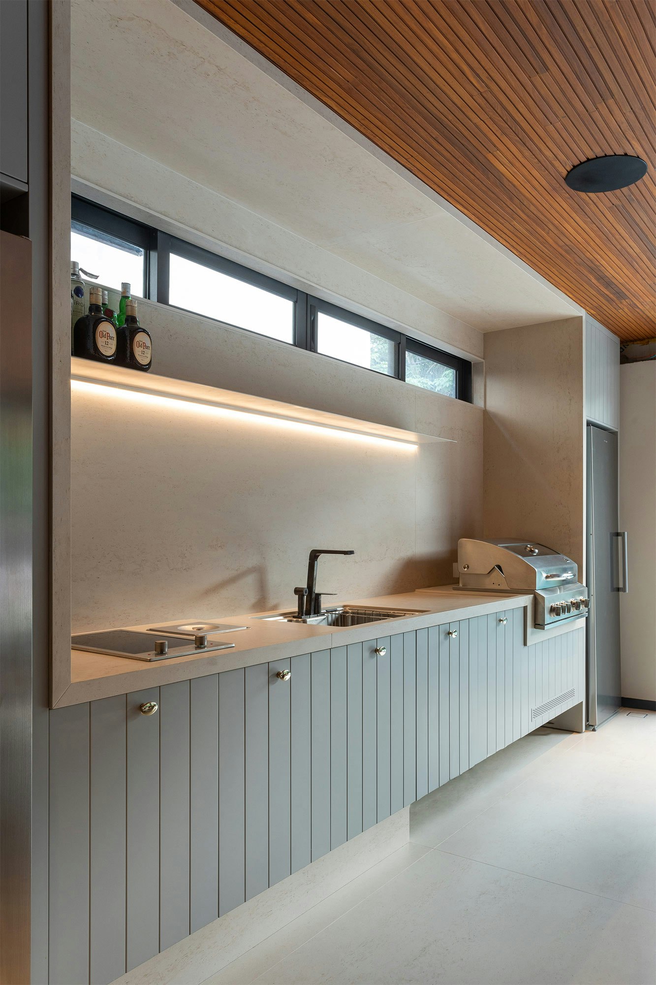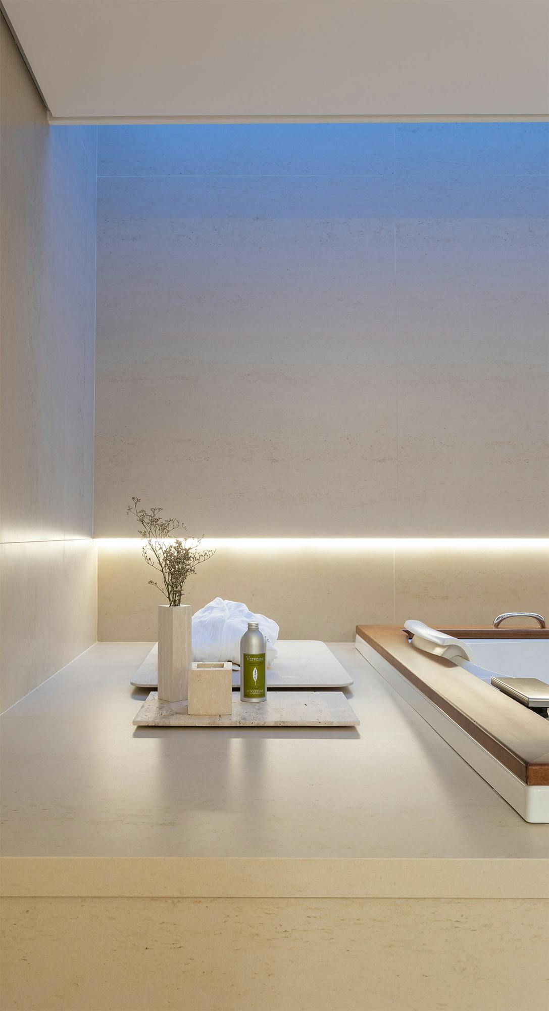 The project stands out for the use of Dekton Danae, an elegant off-white tone, applied to various surfaces, such as countertops, walls, floors, stairs and pool coverings. This choice gives visual unity and elegance to the space.