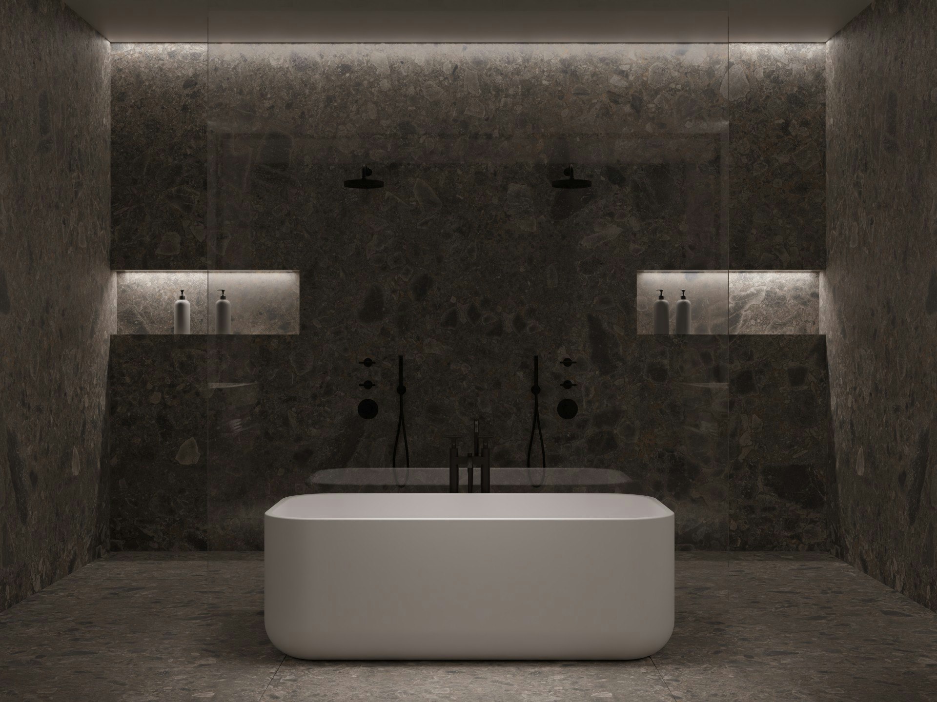 In this project, Germani develops two separate vanity areas to adapt to the different needs of the users of the space. At the same time, it creates a more pleasant and playful feeling in the shower and bath area. The space maintains a balanced effect of personal sanctuary, where small daily rituals of self-care are explored as a way of enhancing well-being.