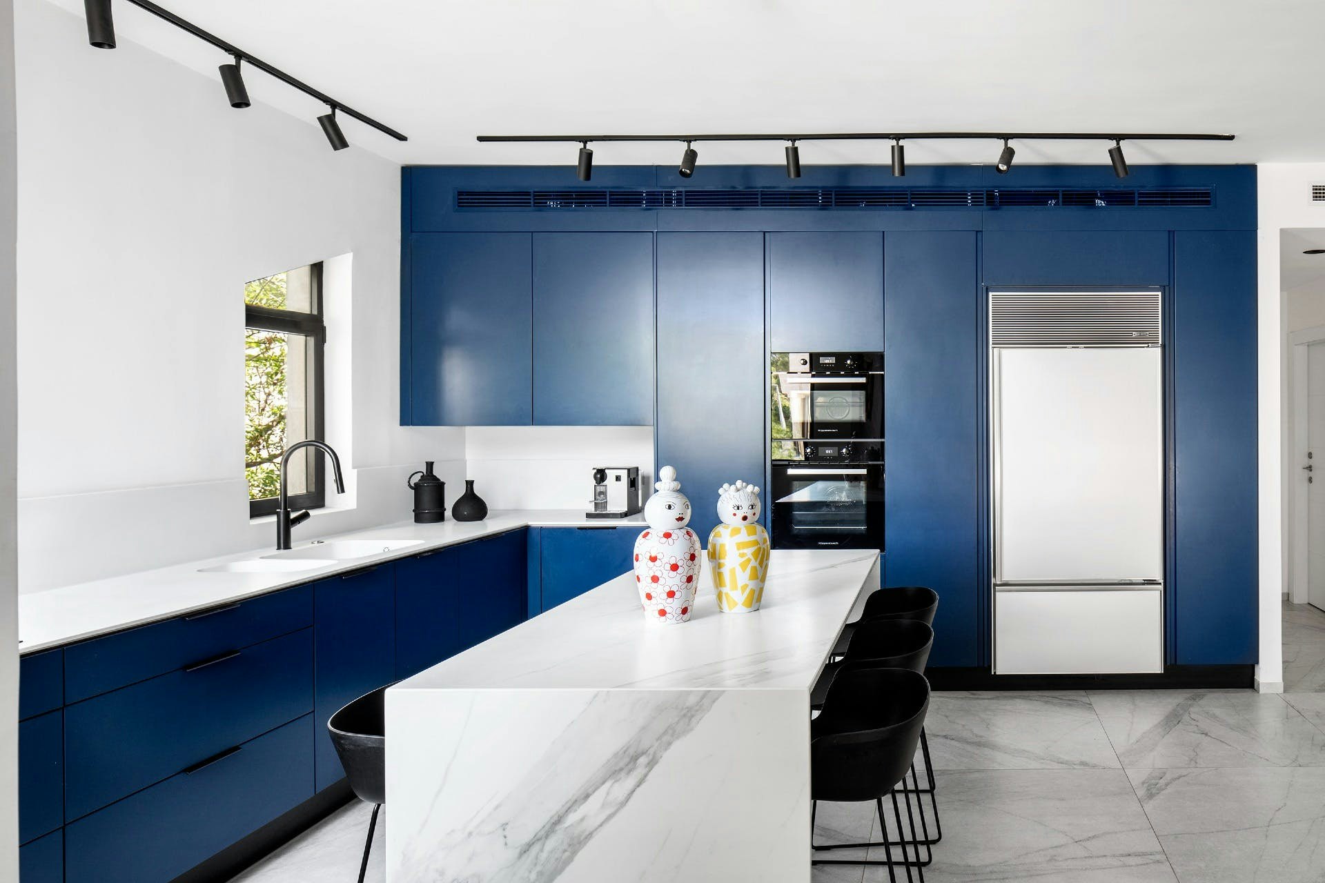 Another big trend in recent years is the use of bright colours in the kitchen. In this case, we recommend combining white worktops with green or blue furniture.