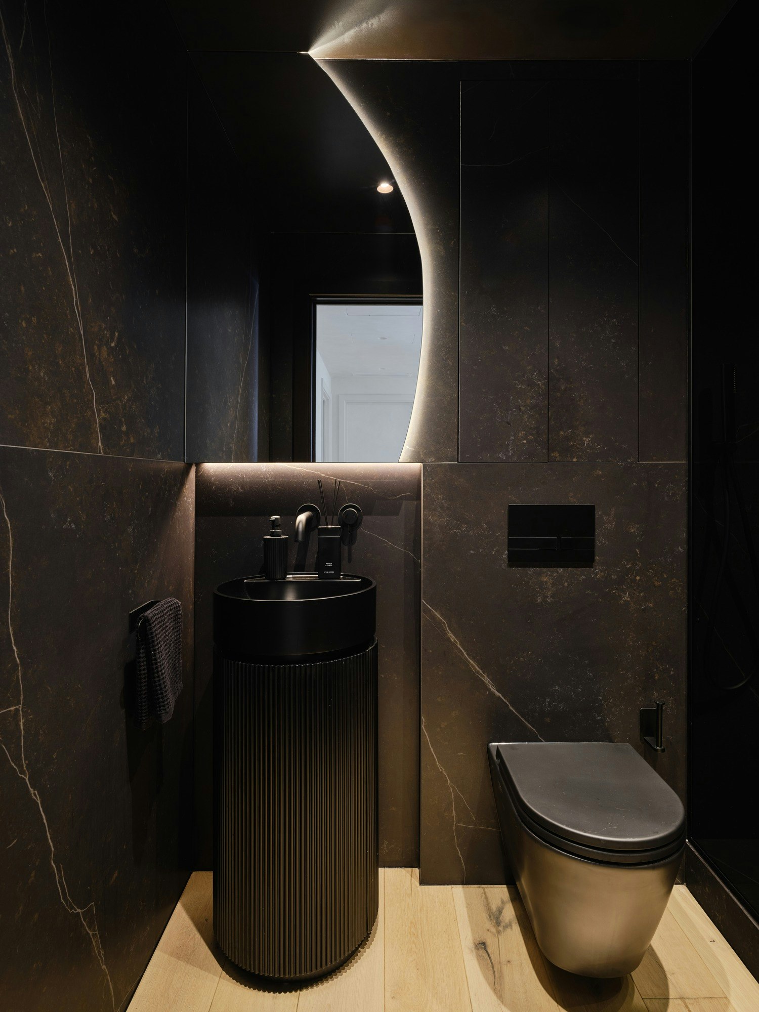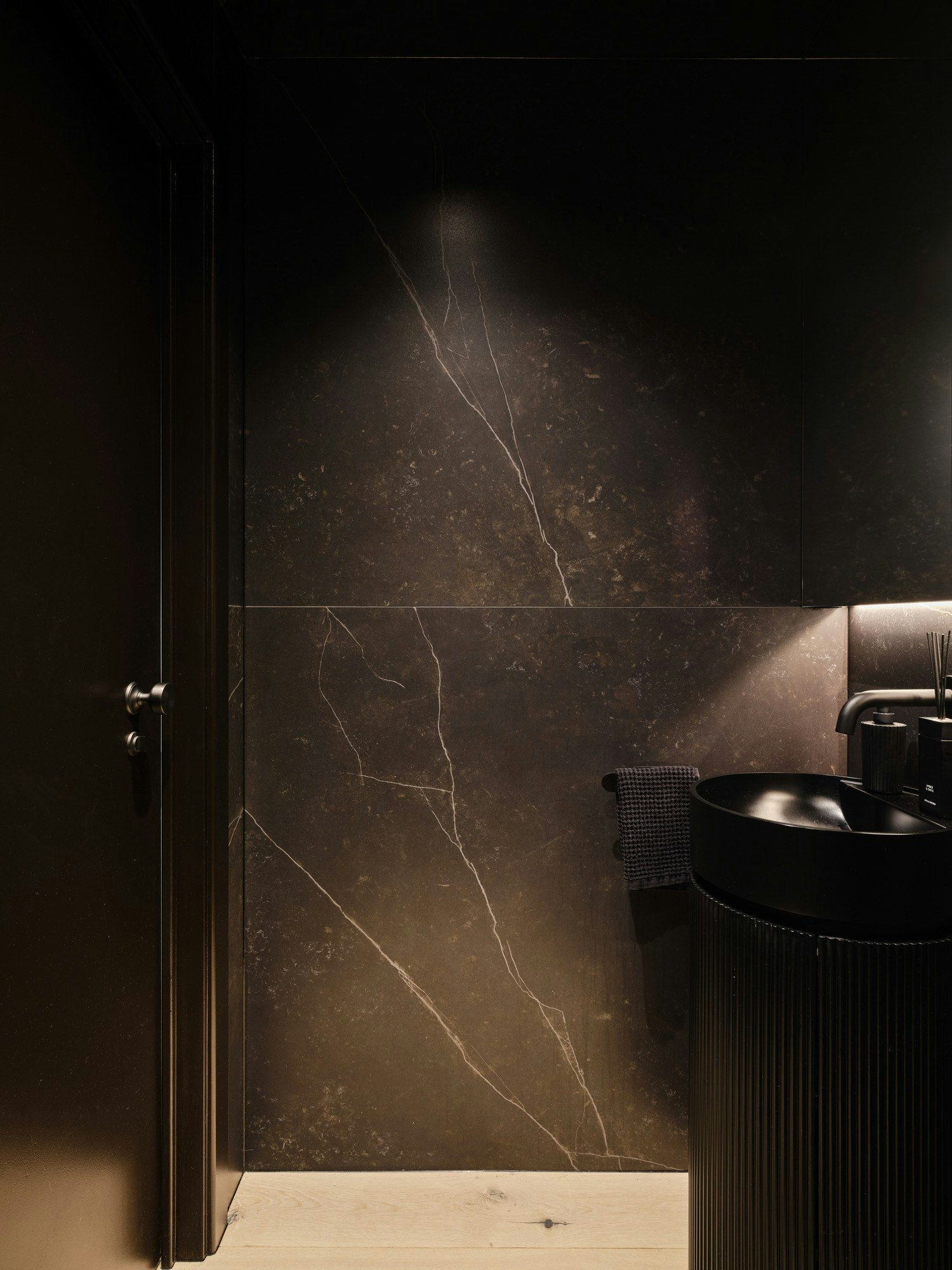 In the kitchen, Dekton Marmorio becomes the main feature, used on worktops and surfaces. Its marble-like appearance with soft veining and warm look introduces a lighter feel to the overall design, visually balancing the finishes used in the bathrooms.