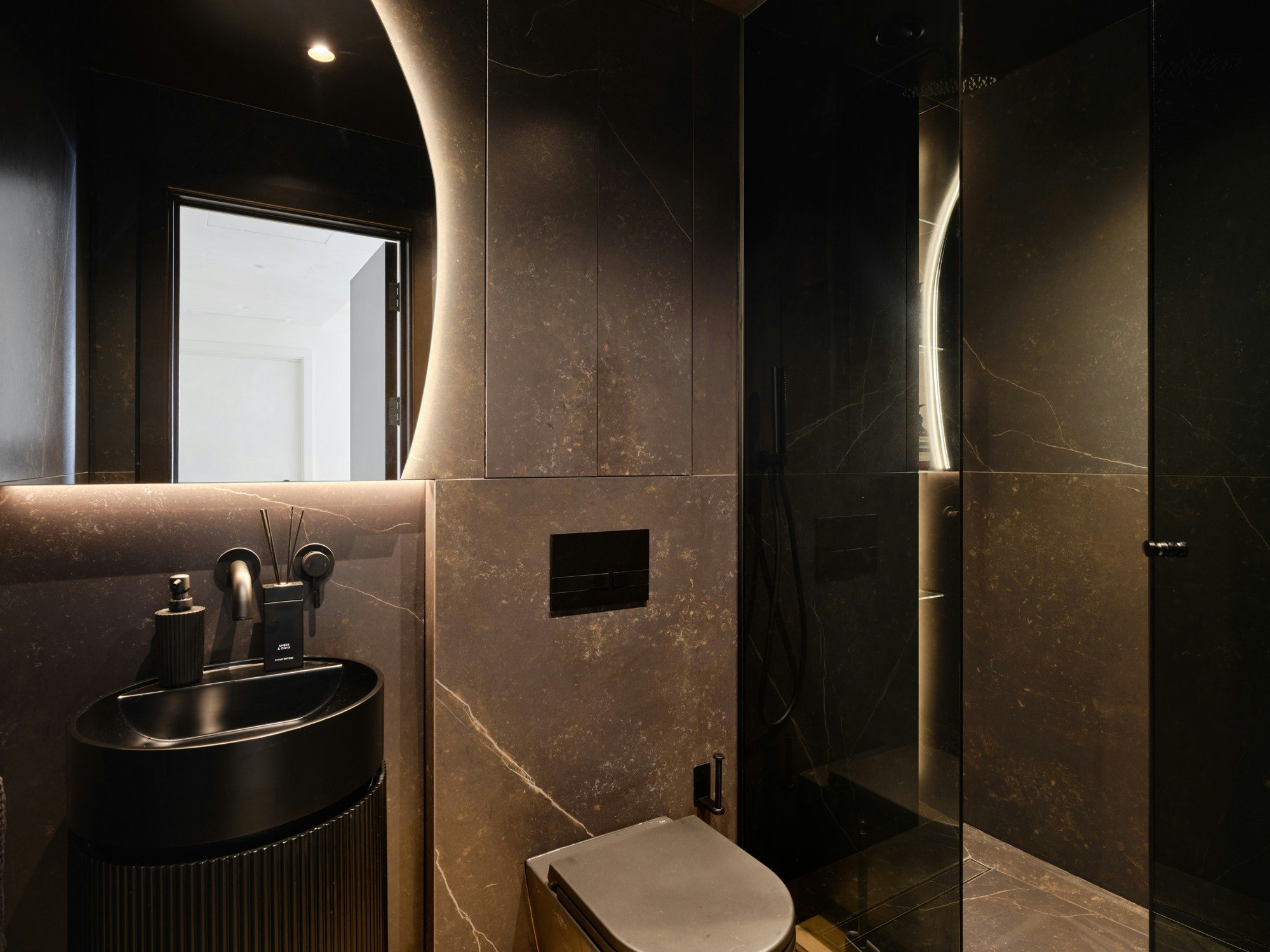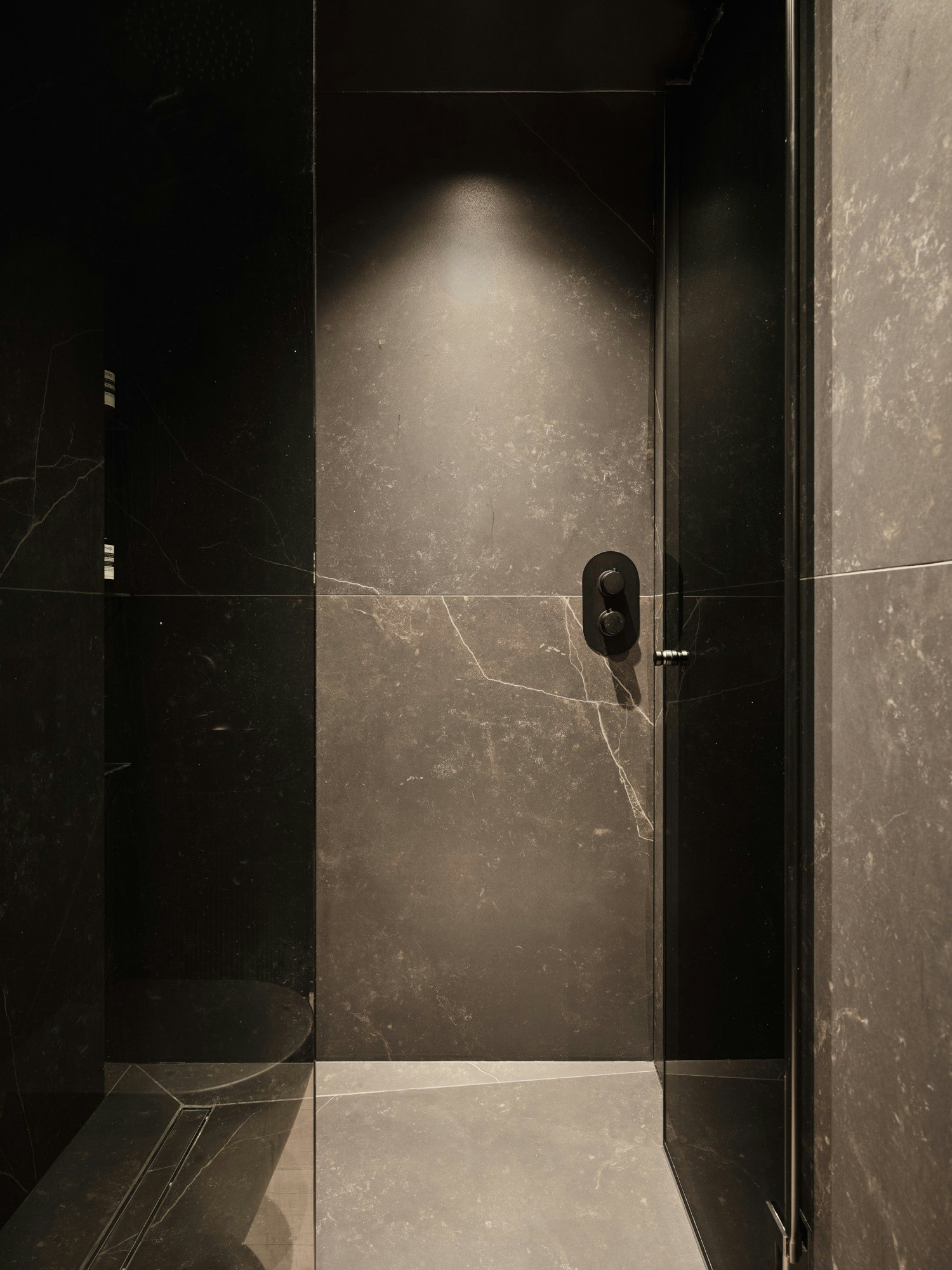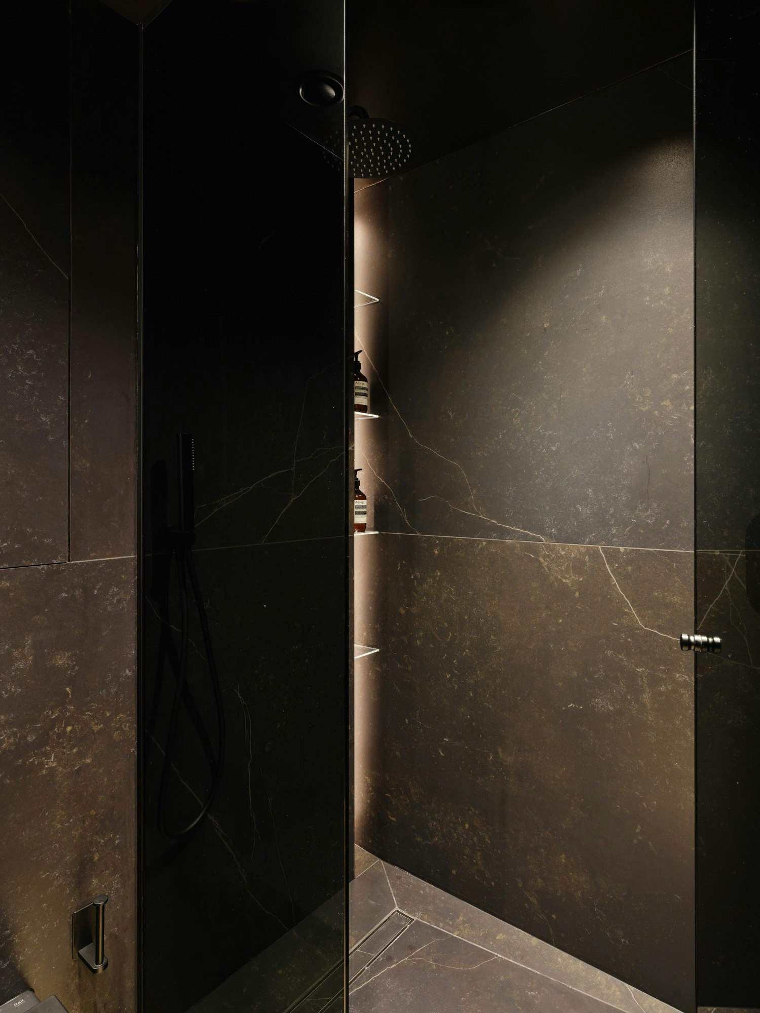 The second bathroom, meanwhile, introduces Dekton Kelya, used as wall cladding and complete enclosure for the shower area. Its dark tone and stony character provide a more architectural feel, maintaining the same logic of integral application. The surface extends seamlessly across the walls, reinforcing the material presence of the space and emphasising its functional role within the apartment. “Used in wall cladding and the shower enclosure, Dekton Kelya creates a strong architectural presence while maintaining an elegant and refined atmosphere.”