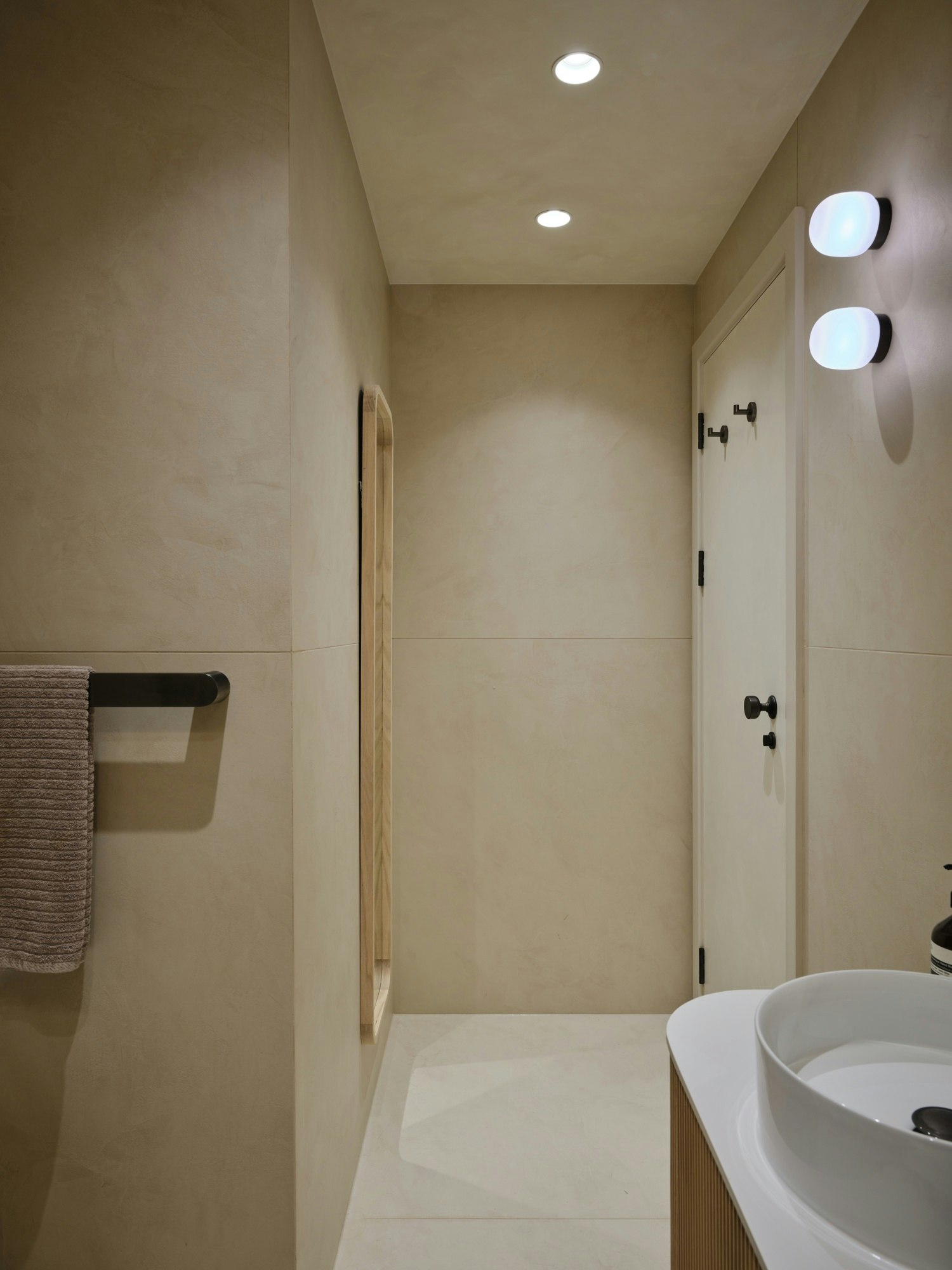 In this way, in the main bathroom, Dekton Nacre is applied as continuous cladding for walls and flooring, creating a homogeneous envelope. Its cement-inspired finish and warm tones are used to minimise visible joints and enhance a uniform perception of the space.