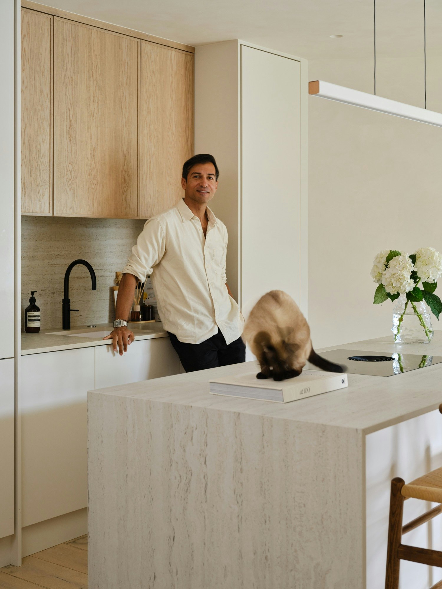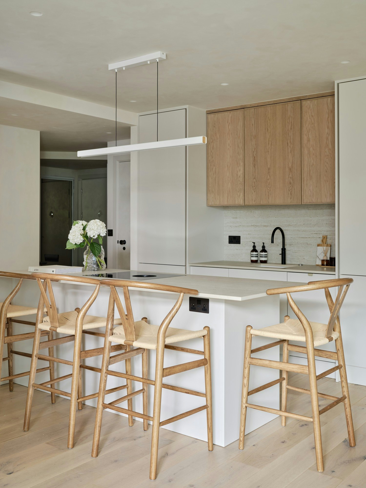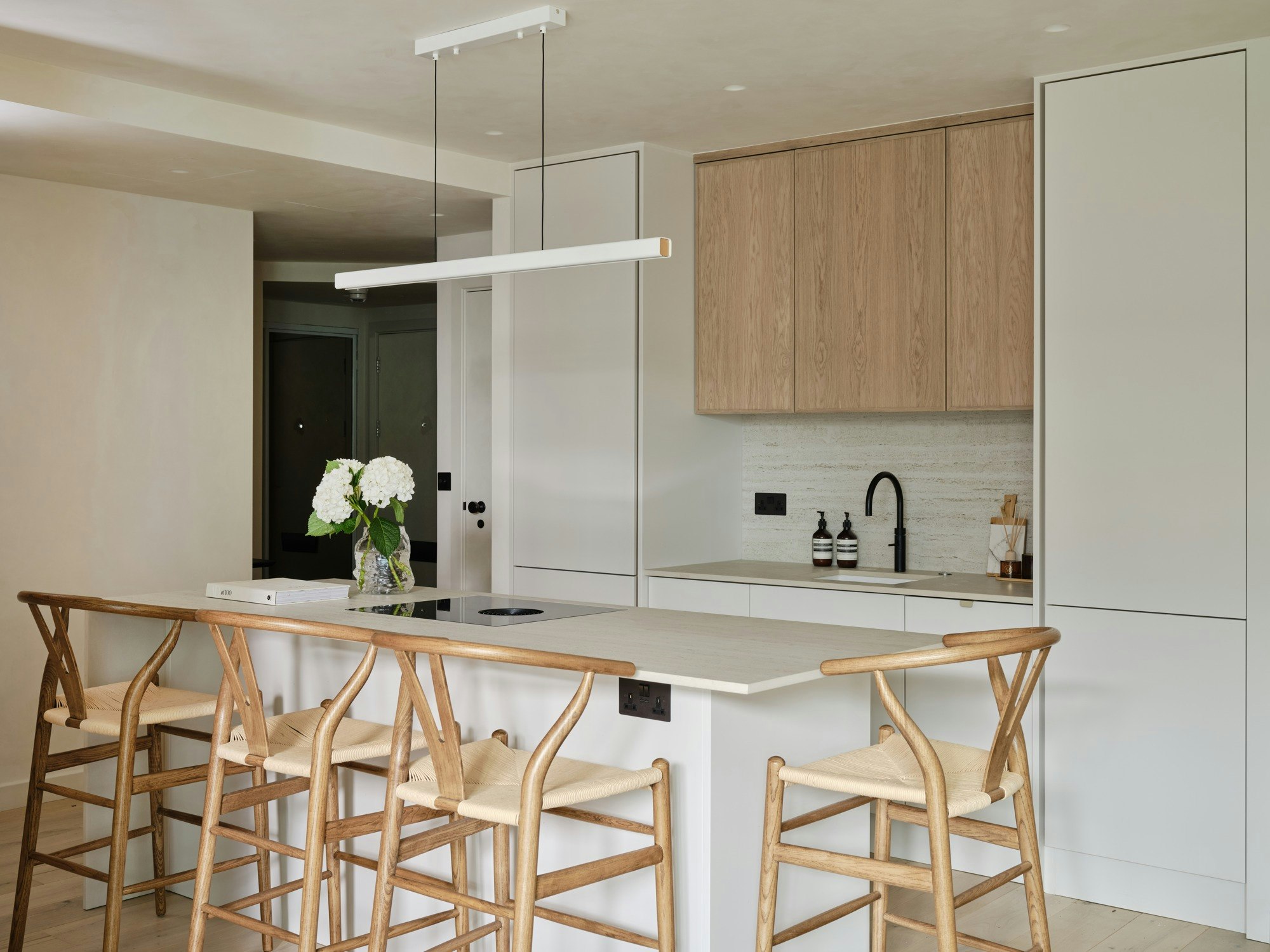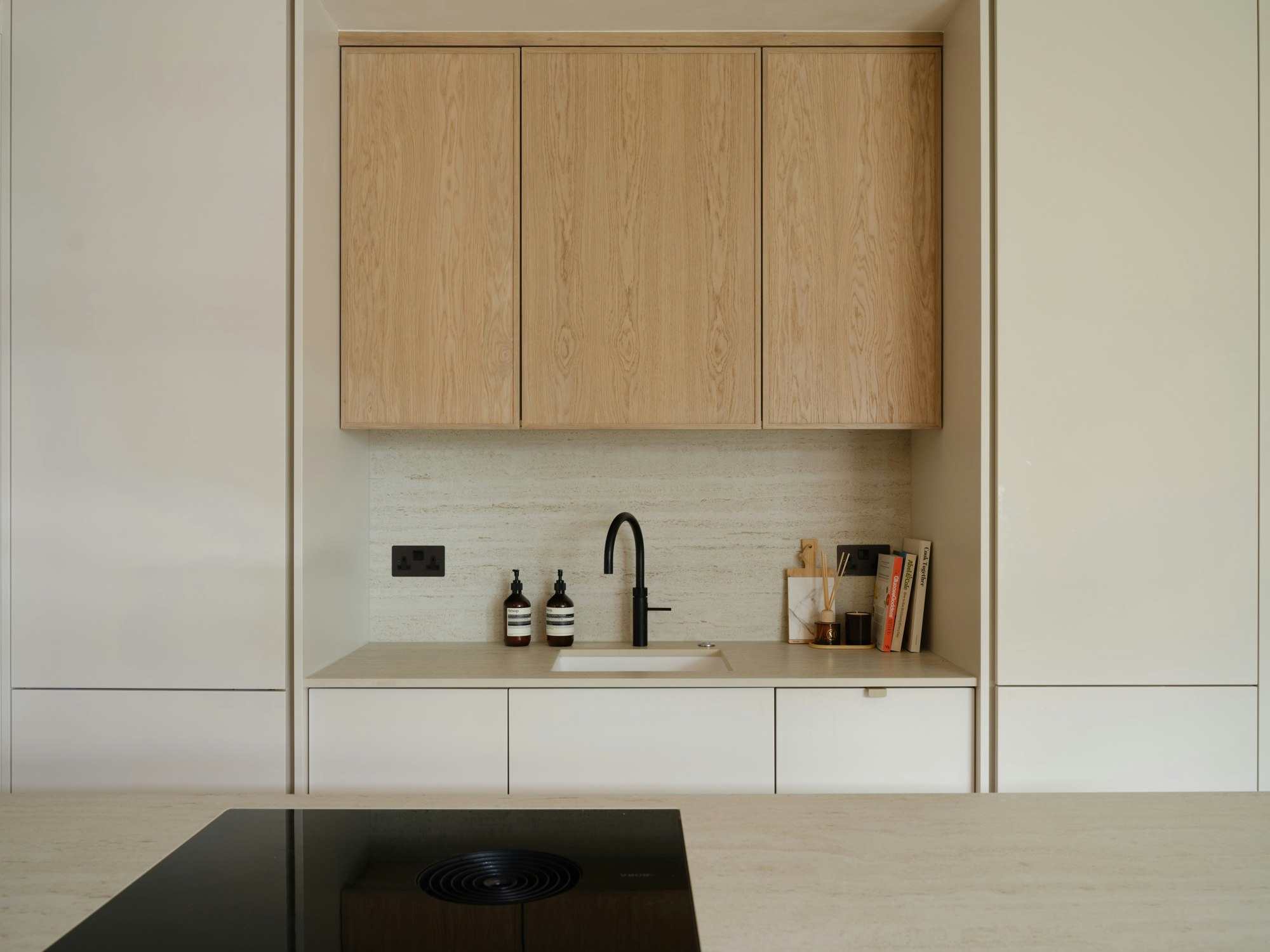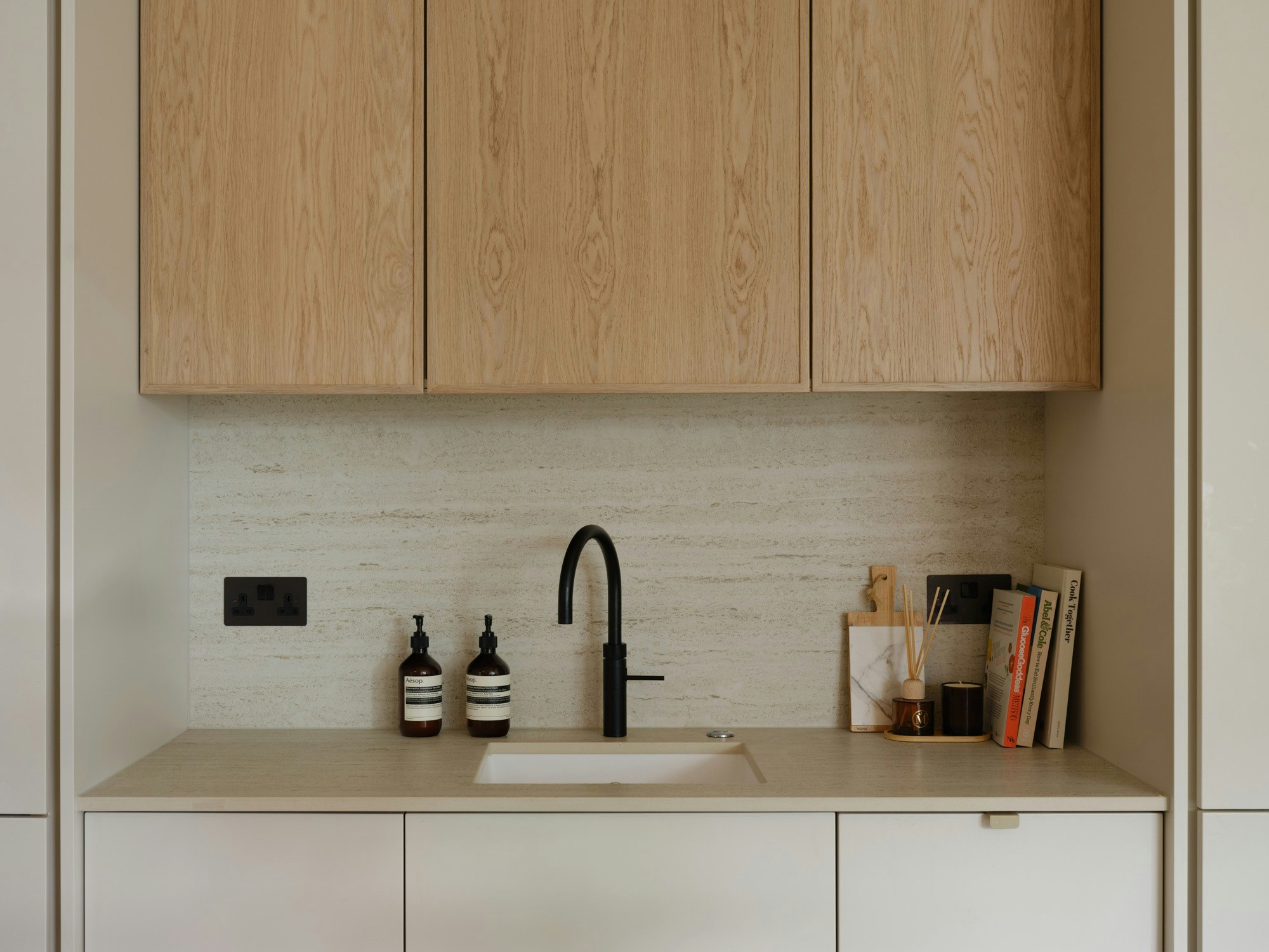 The renovation takes place in a residential apartment in Battersea, London, with the aim of “conveying a refined sense of modern living through cohesive materials and high-performance surfaces. Calmness, continuity, and durability were prioritised, combining soft mineral tones with darker architectural contrasts to define each space without visual excess.”