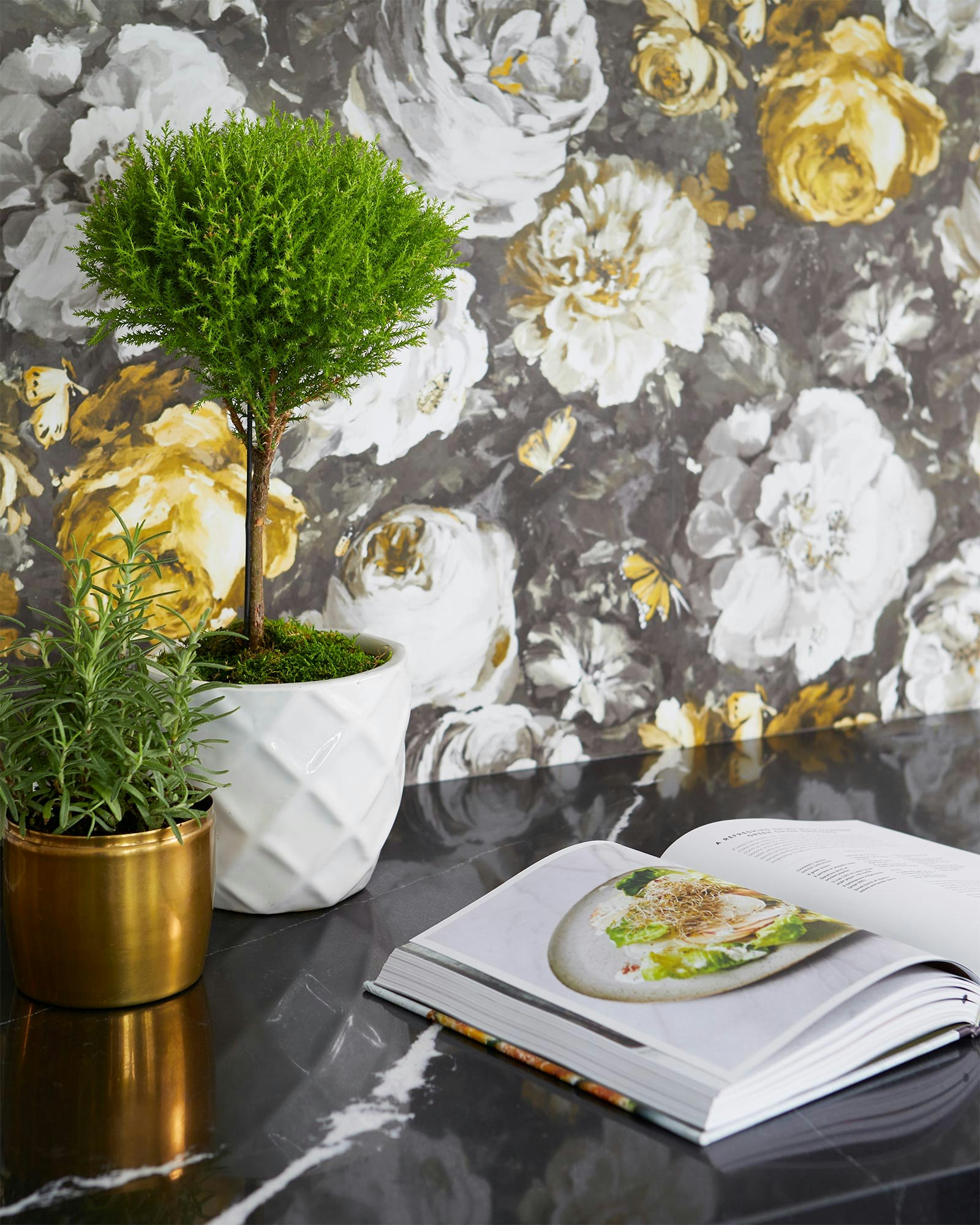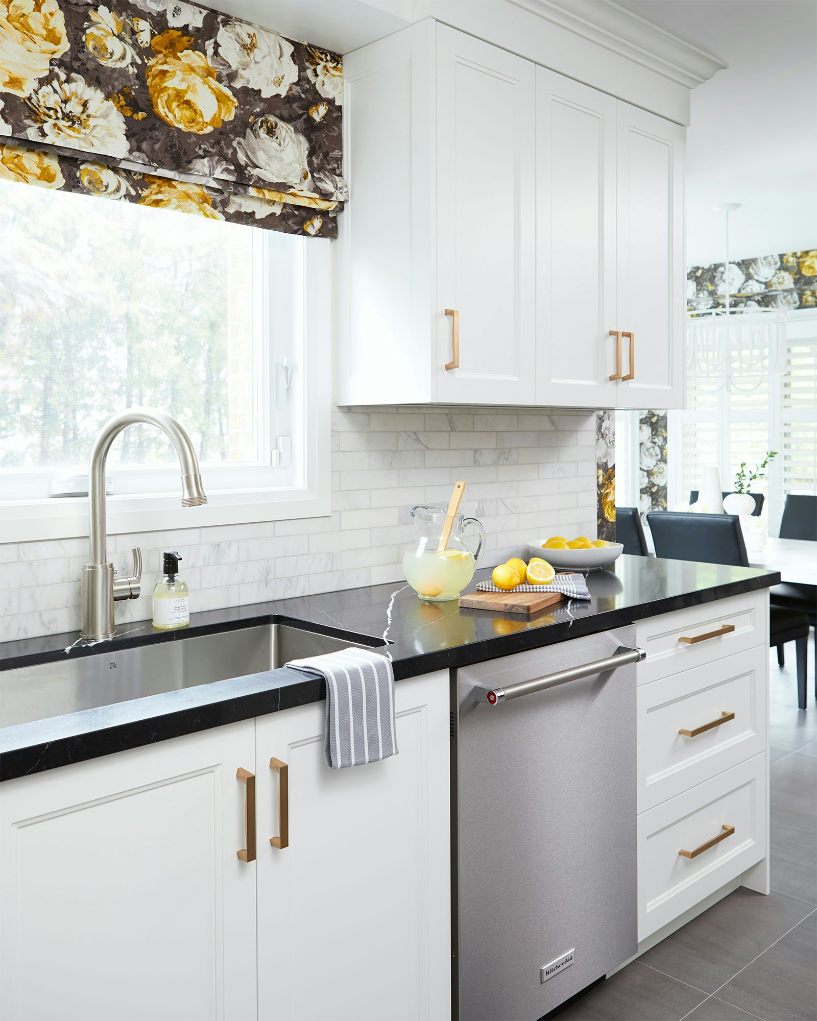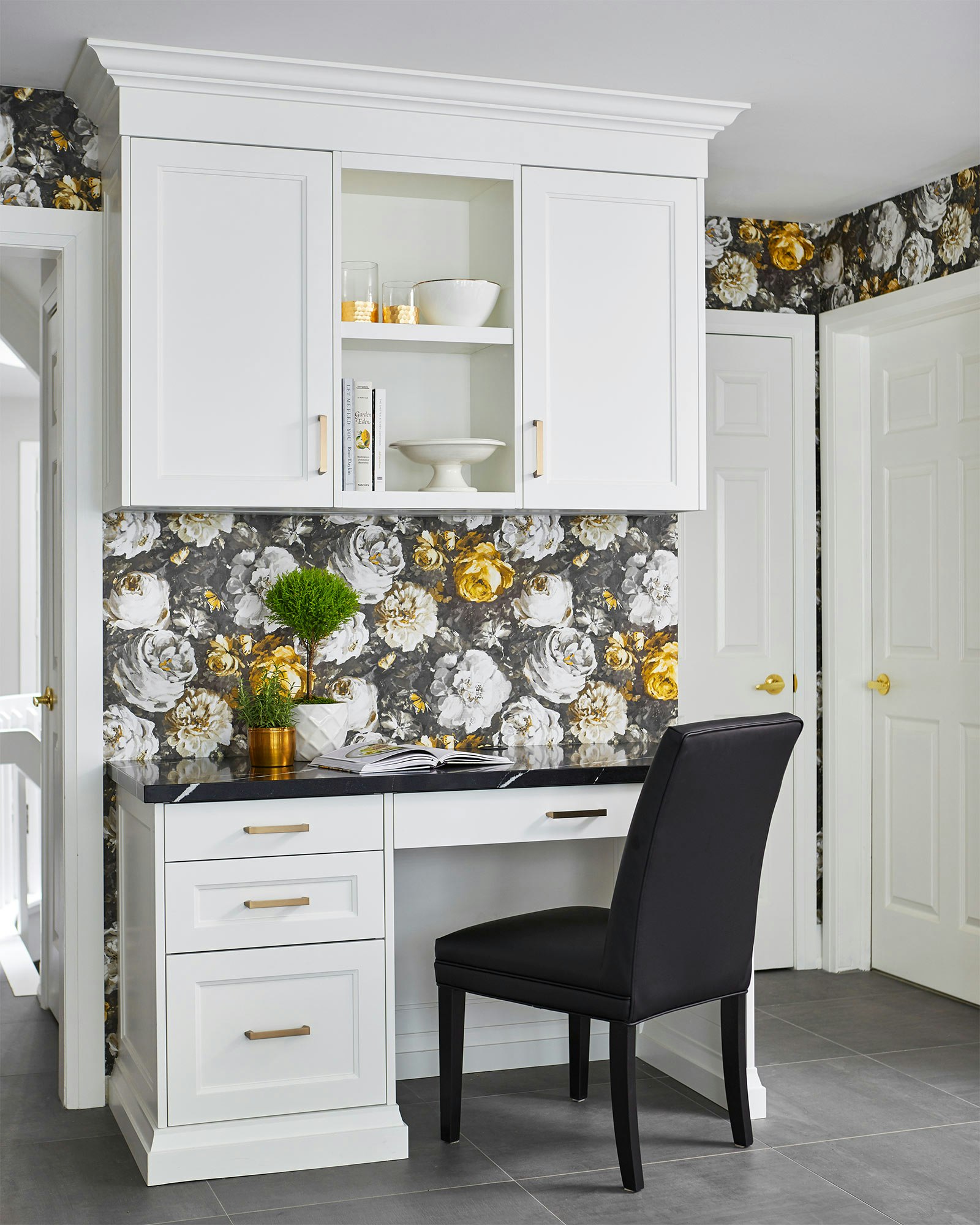 The Silestone Et. Marquina countertops are a beautiful complement to the white cabinets and marble tile backsplash. There were several walls in the kitchen, so instead of painting them all a solid color, the designer proposed a fun and floral wallpaper with a back background which ties perfectly into the black counters and white cabinets.