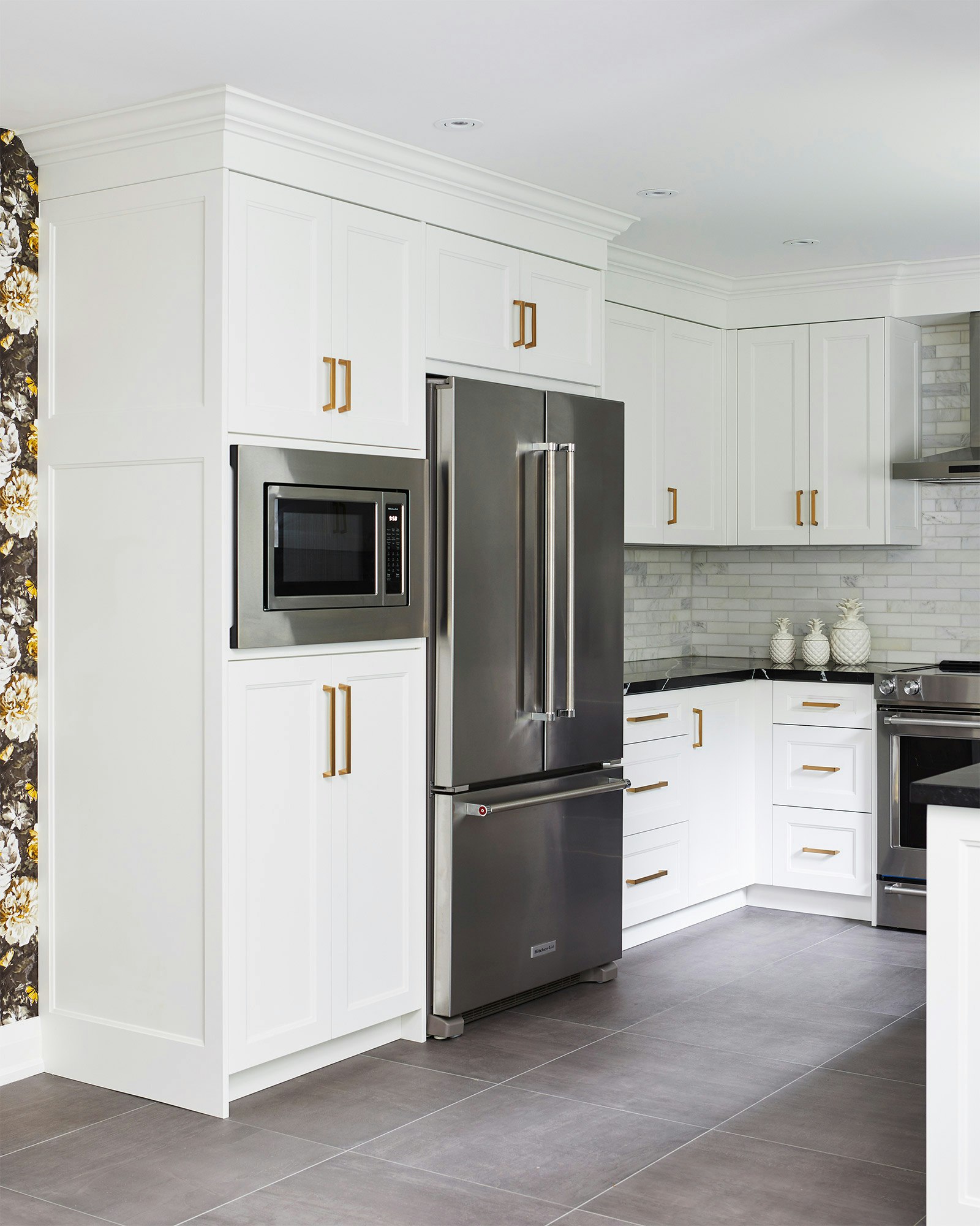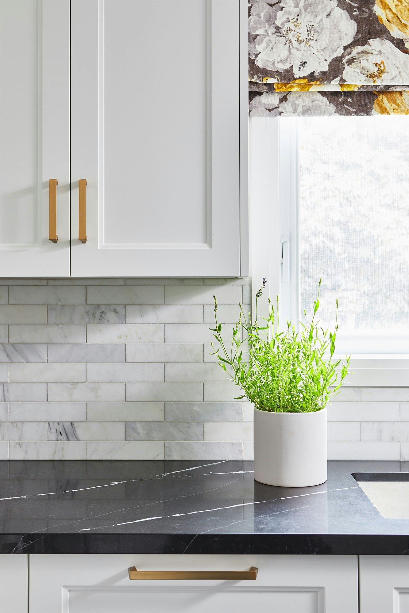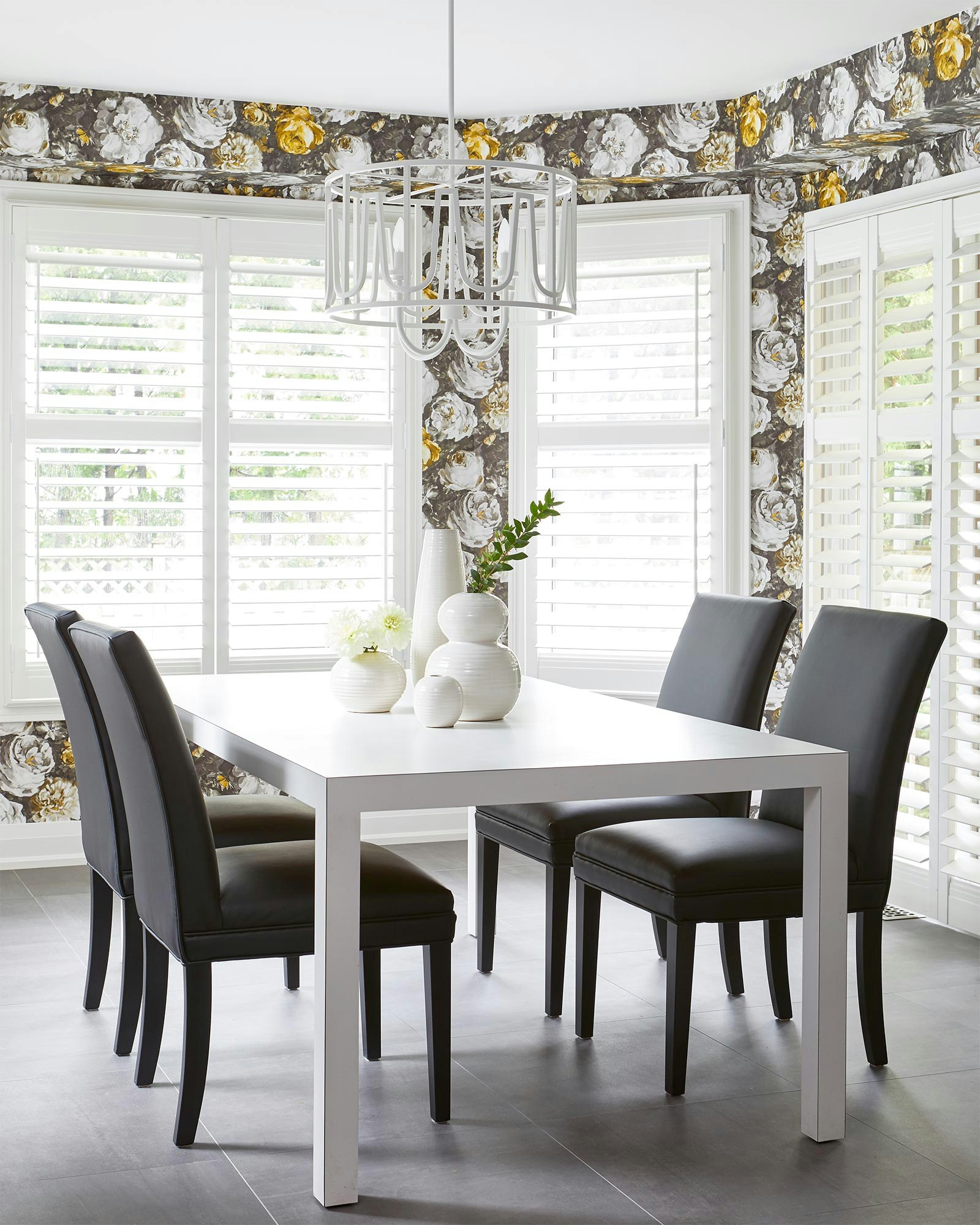 The Silestone Et. Marquina countertops are a beautiful complement to the white cabinets and marble tile backsplash. There were several walls in the kitchen, so instead of painting them all a solid color, the designer proposed a fun and floral wallpaper with a back background which ties perfectly into the black counters and white cabinets.