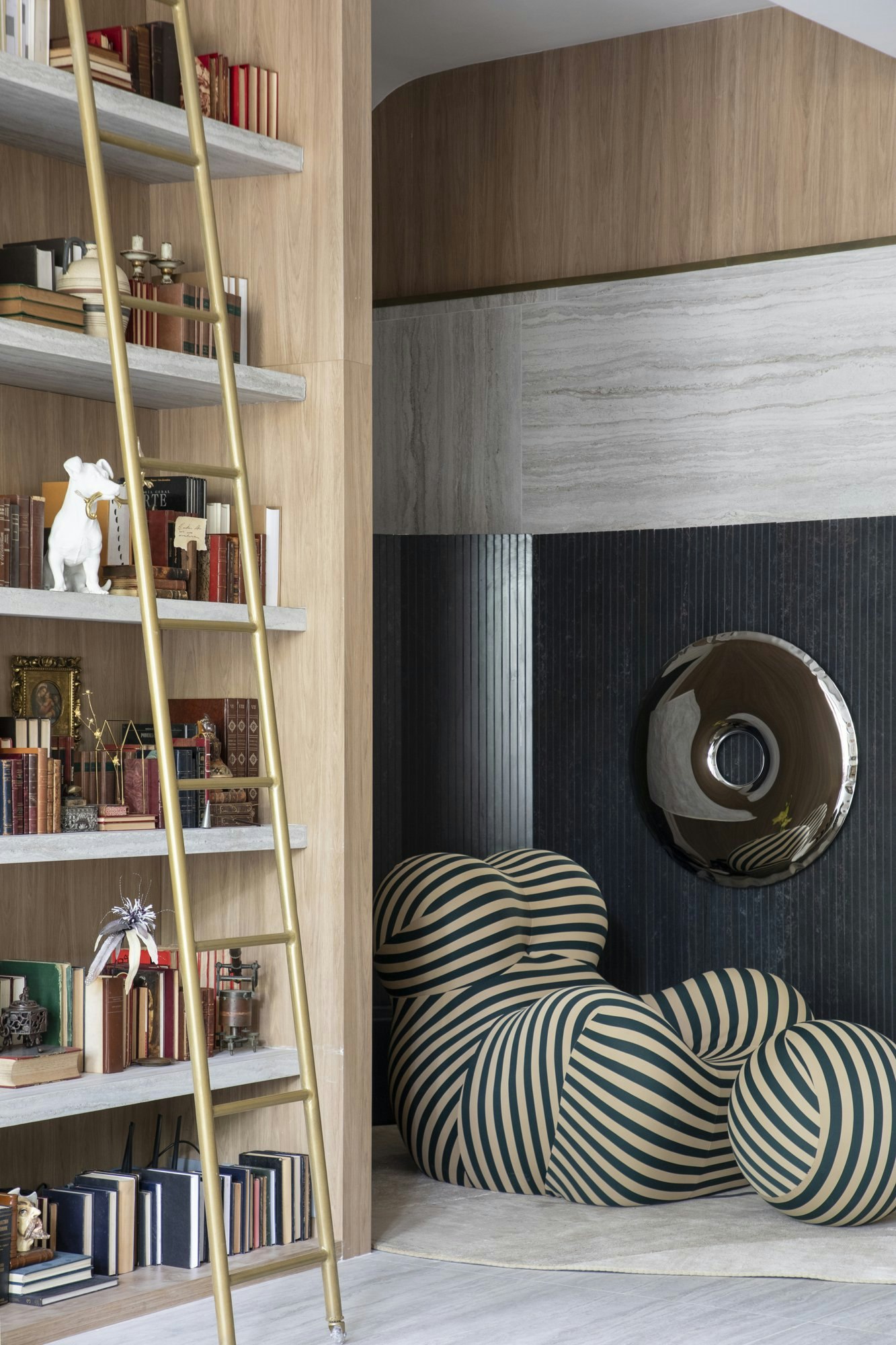The main bookcase in the space, where books, works of art and personal relics are displayed, also features Dekton on the shelves, reinforcing the combination of strength and lightness.