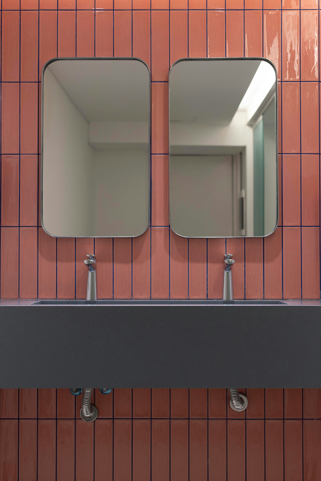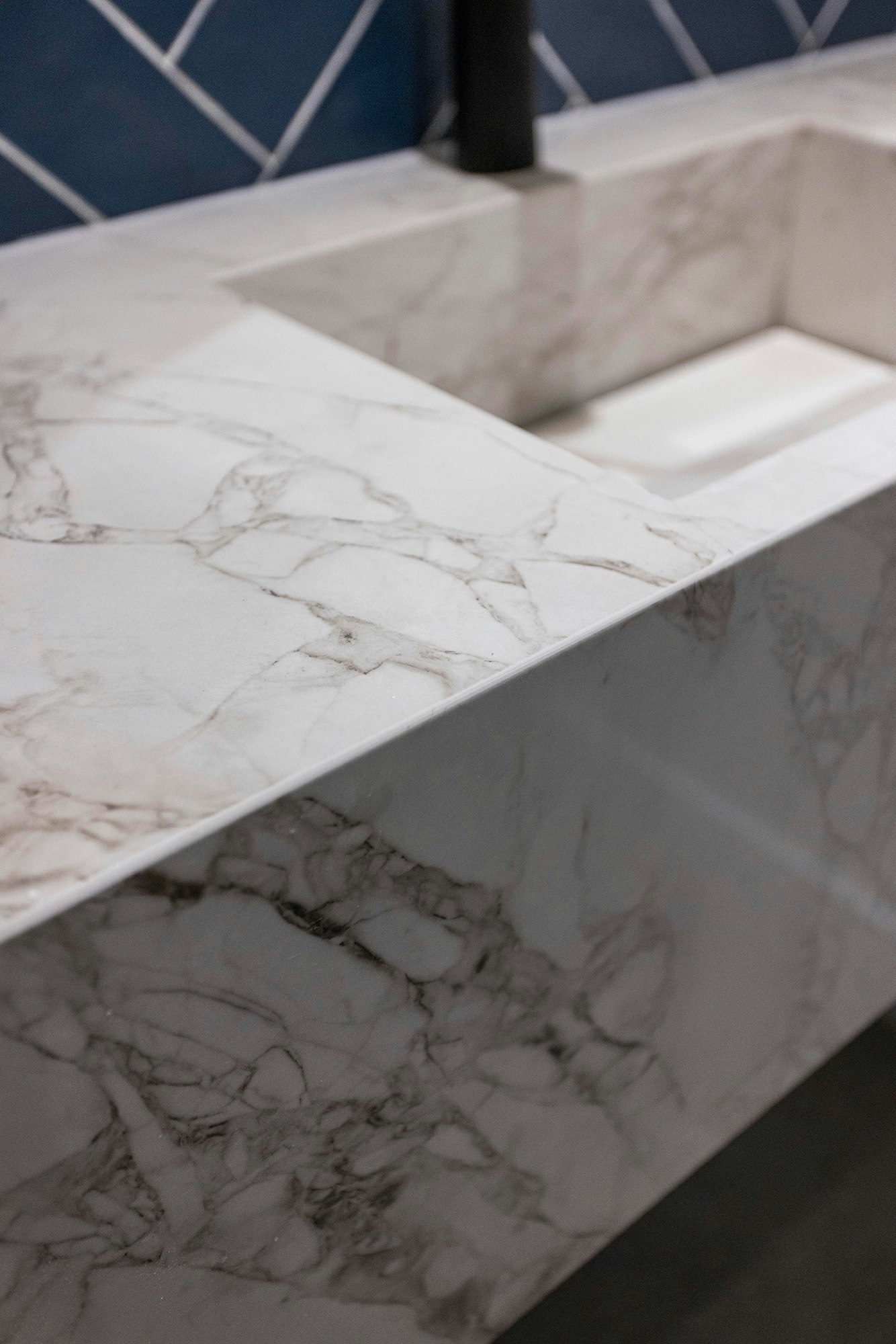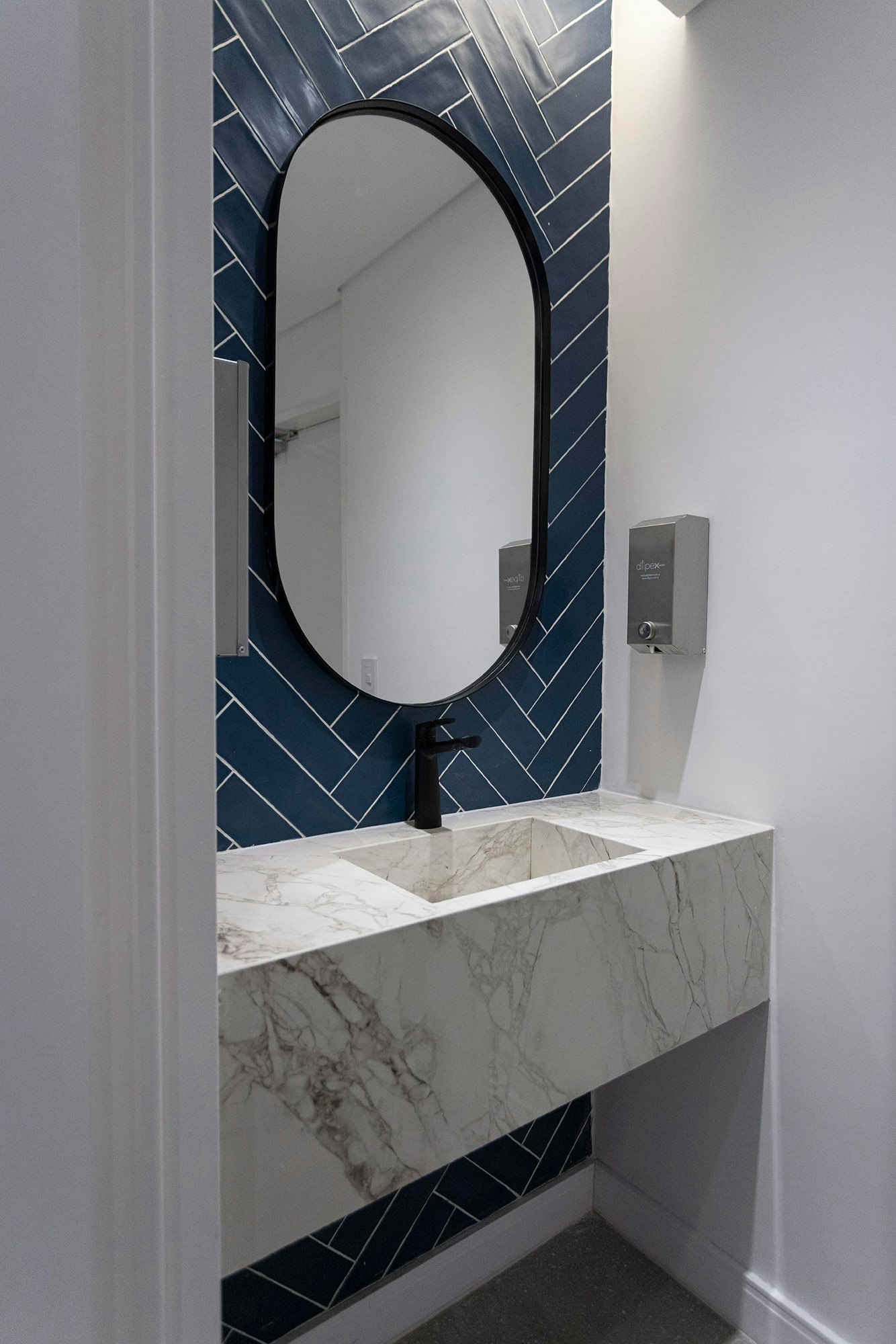 As for the rest of the bathrooms in the building, the material of choice was Dekton. Specifically, Dekton Bergen was the surface chosen for the countertops of the integrated washbasins. “We chose it for its veining and elegance, which matches the blue cladding used on the walls”, the studio says.