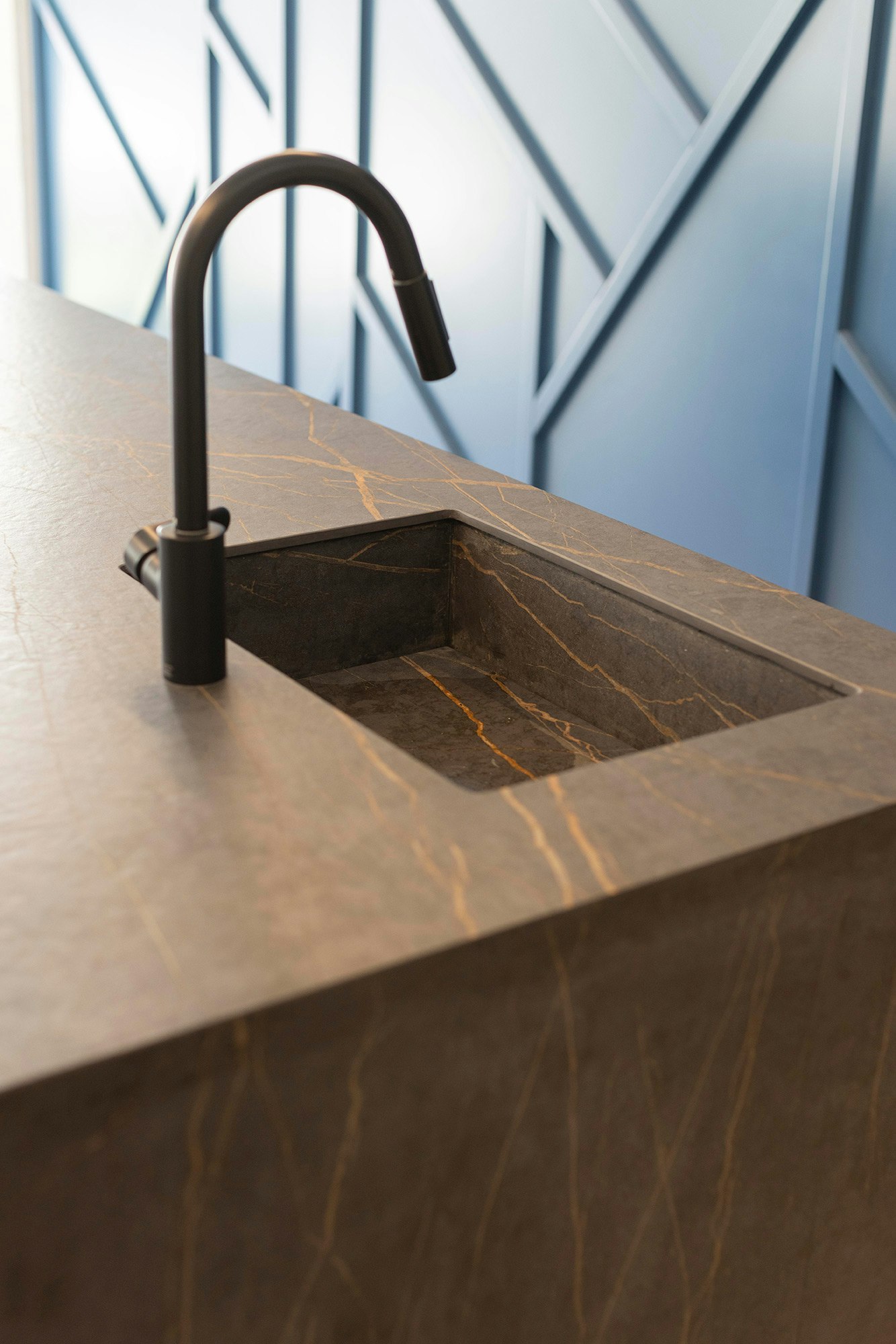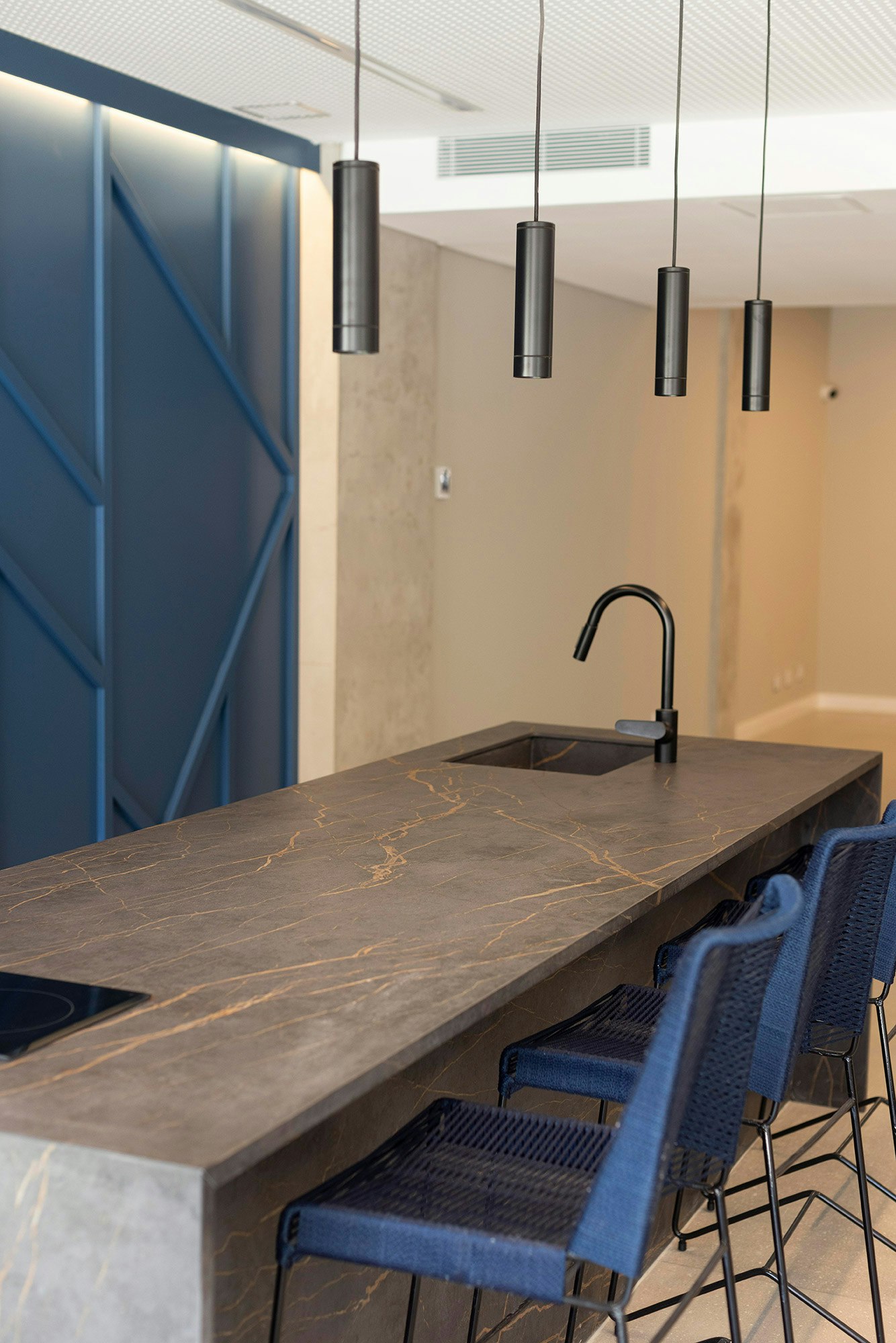 And they further say: “One of the main amenities of our project is the SUM multipurpose room (which stands for ‘Salón de Usos Múltiples’ in Spanish), which serves as a meeting point. For this room we designed a big kitchen island in Dekton Laurent, which thanks to its colour, golden veining and texture enhances the design and makes the island the focal point of the room”.