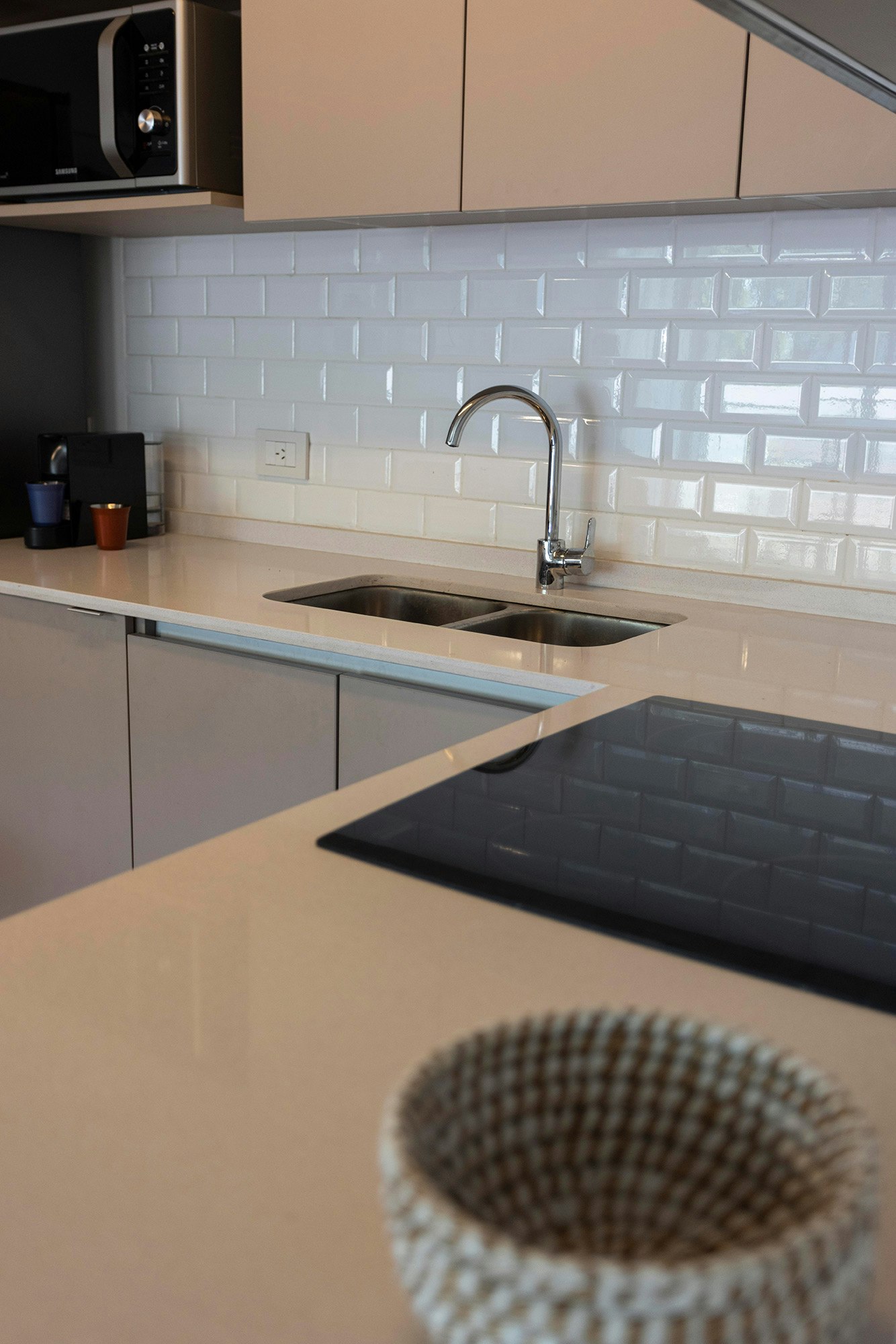 Last but not least, the small kitchen in the coworking space also features the Spanish company’s products. In this case, Silestone White Zeus was the surface chosen for the worktop because of its “simplicity and purity”.
