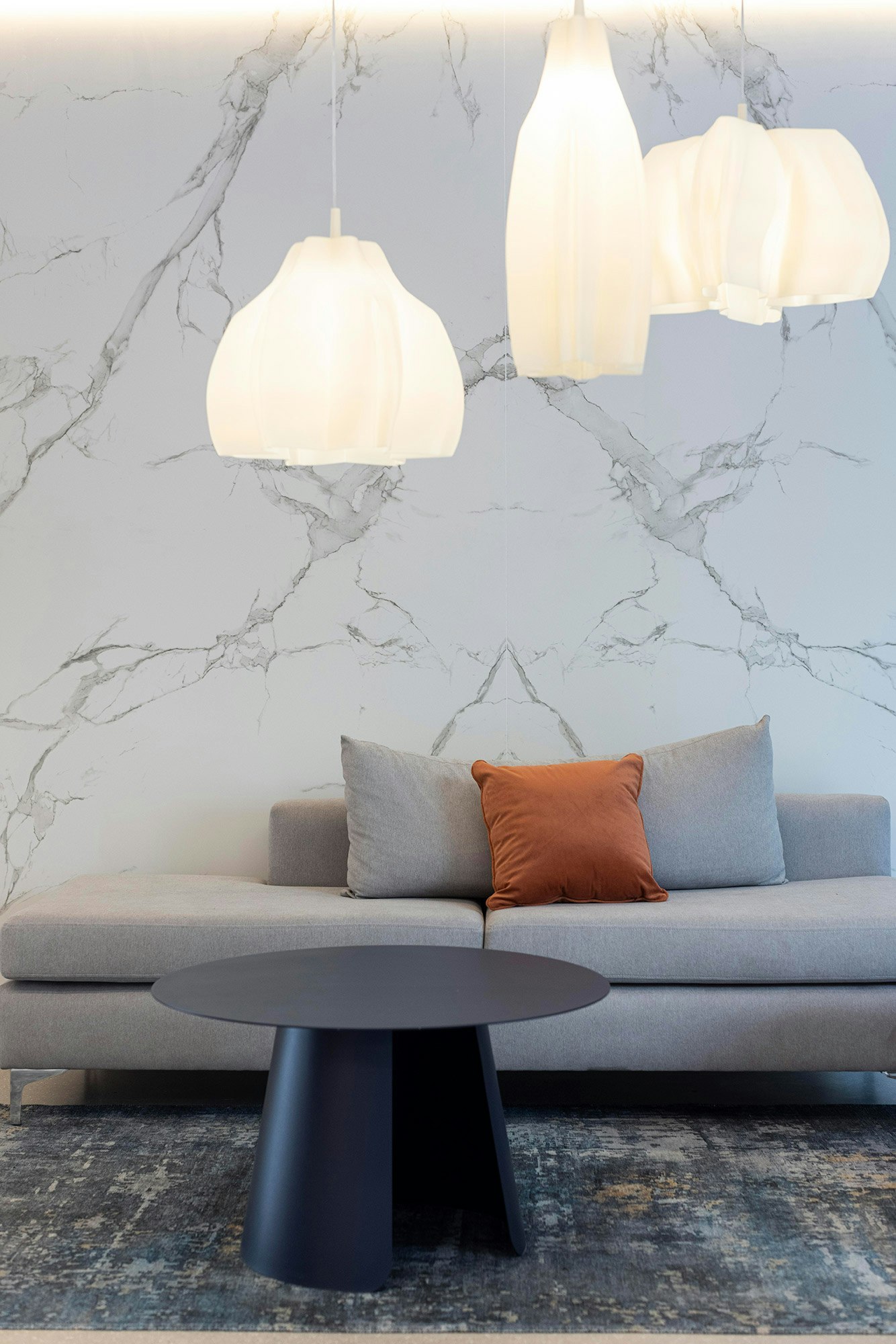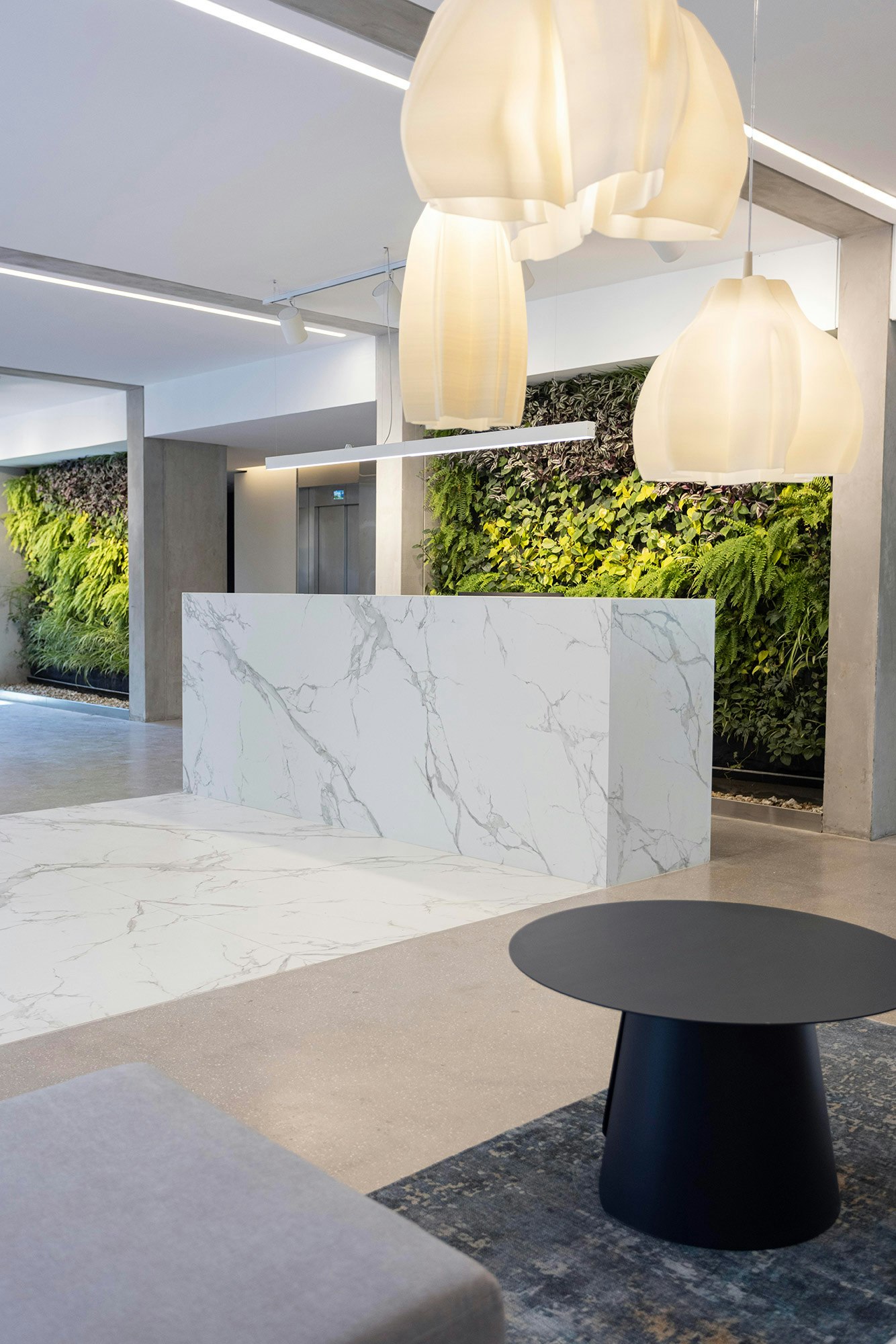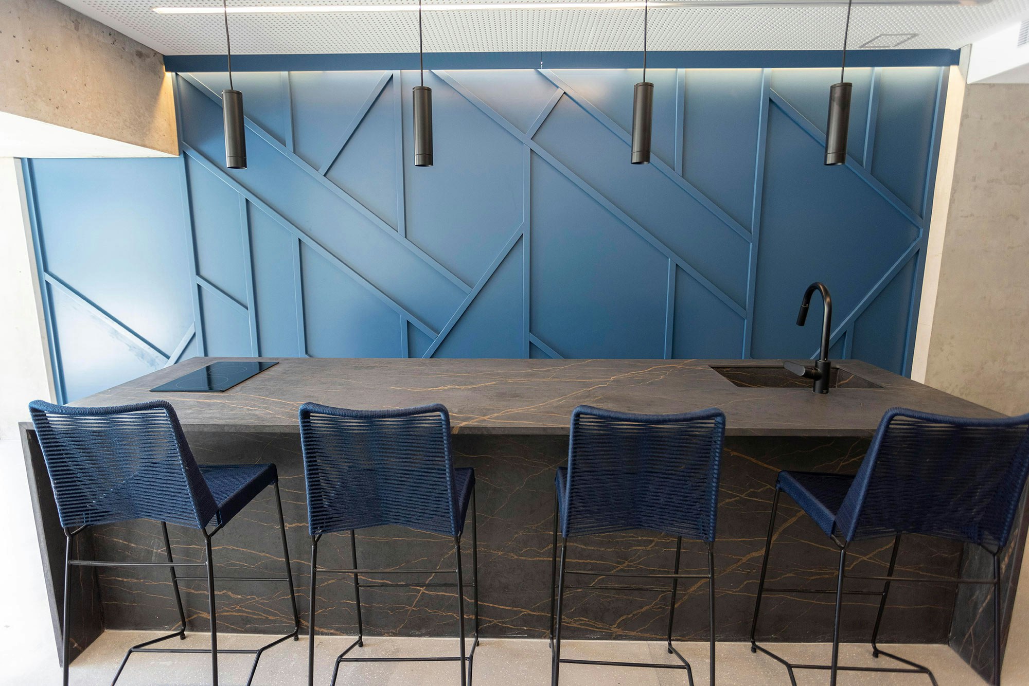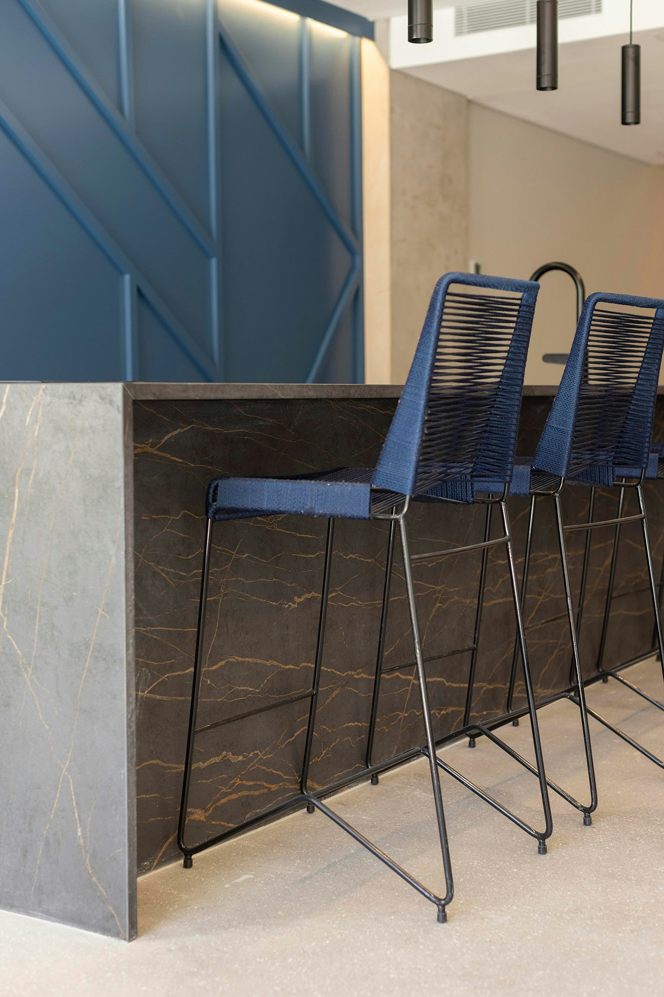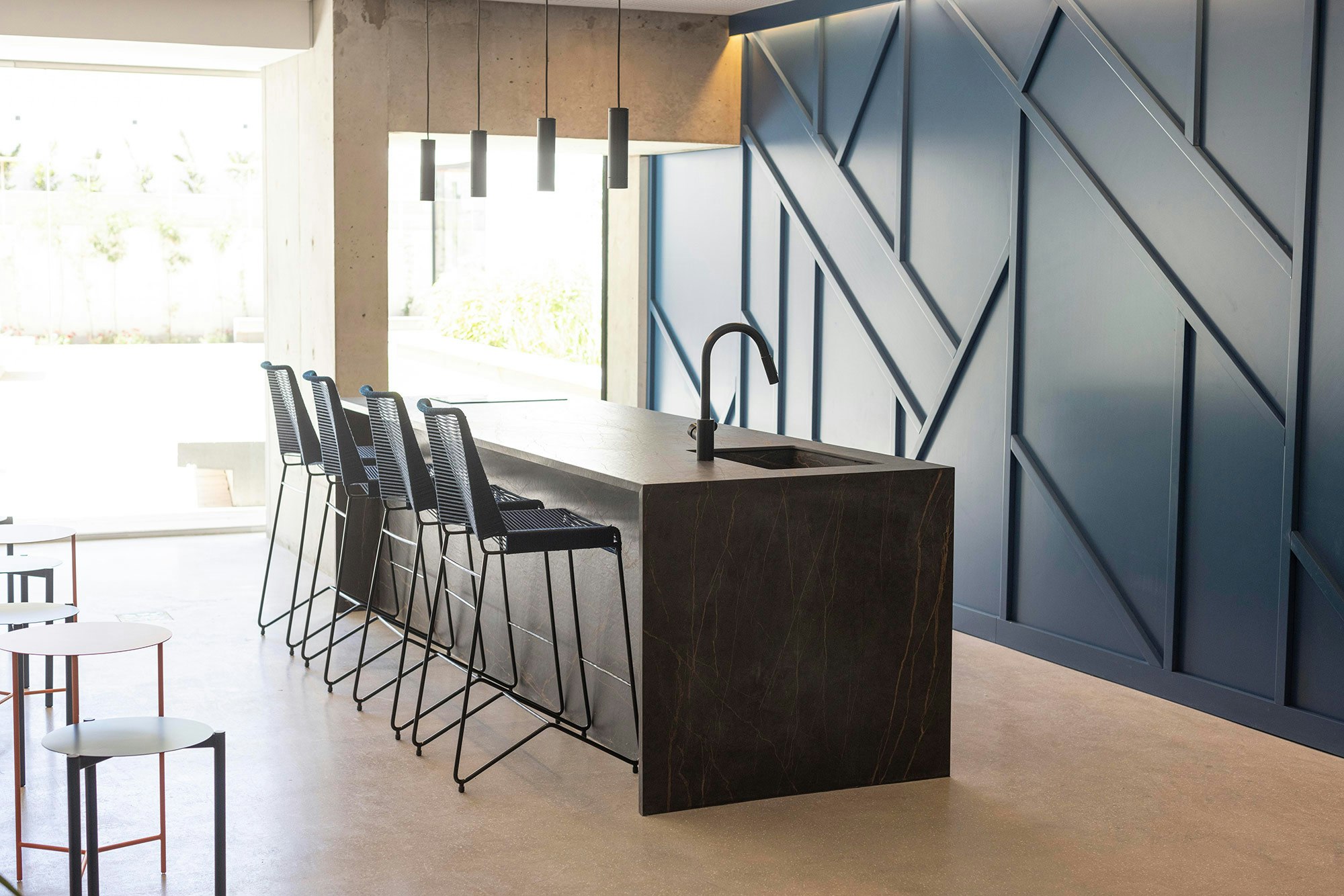 In addition, the professionals also highlight the large size of the Dekton and Silestone pieces. “This allowed us to minimise the number of joints in the claddings and to create one-piece units for the island in the SUM room and the reception area in the lobby. The material’s resistance to scratches, stains and thermal shock was a significant advantage in relation to the intensive use of the common areas”, the studio says.