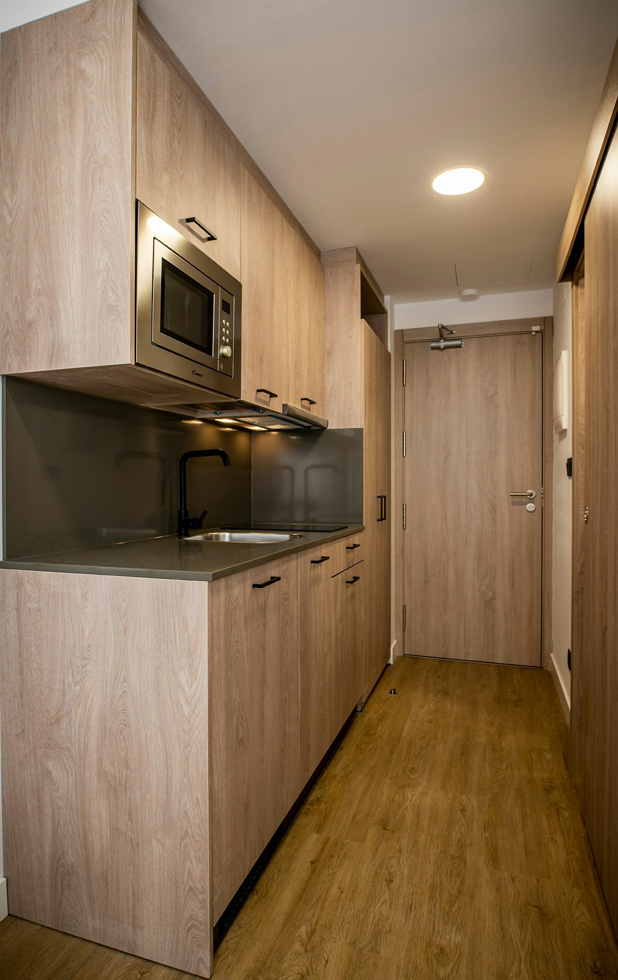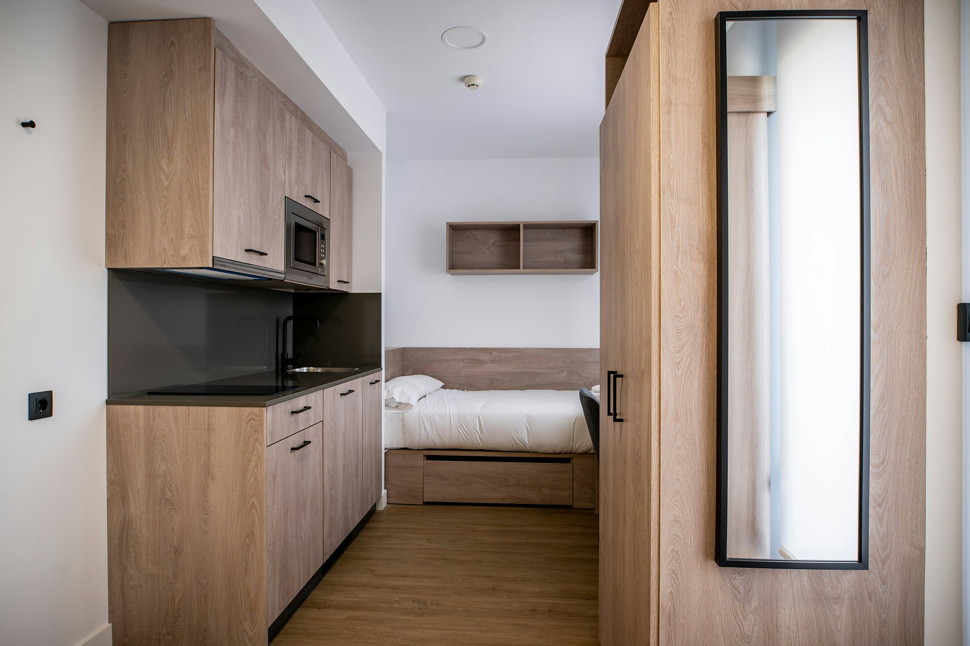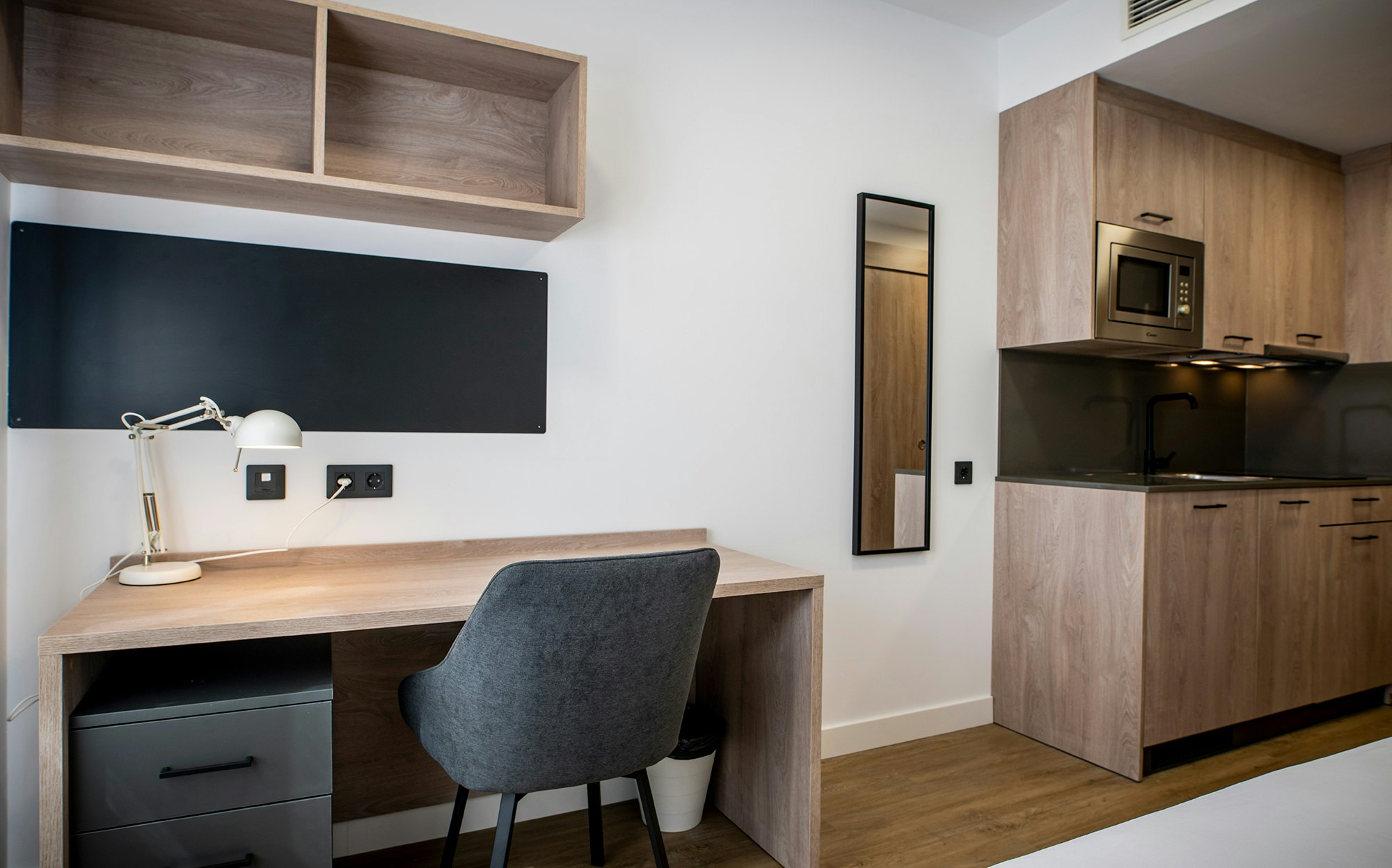 With a functional and welcoming design, the fully-equipped flats of the Micampus Sinesio Delgado hall of residence are conceived to provide university students with everything they need. Located in a residential area of Madrid (Spain), this hall of residence offers accommodation with ensuite bathroom, air conditioning, central heating, 5G Wi-Fi and a modern kitchen built to withstand the heavy use and traffic of the different occupants.