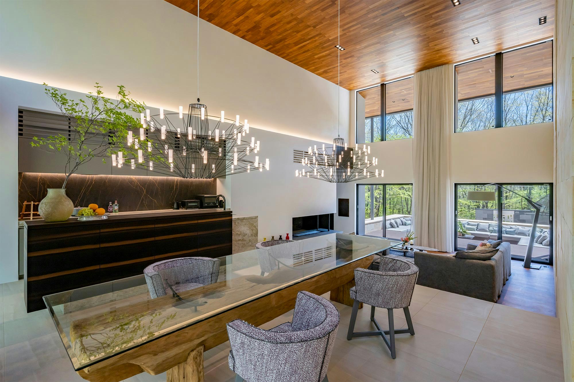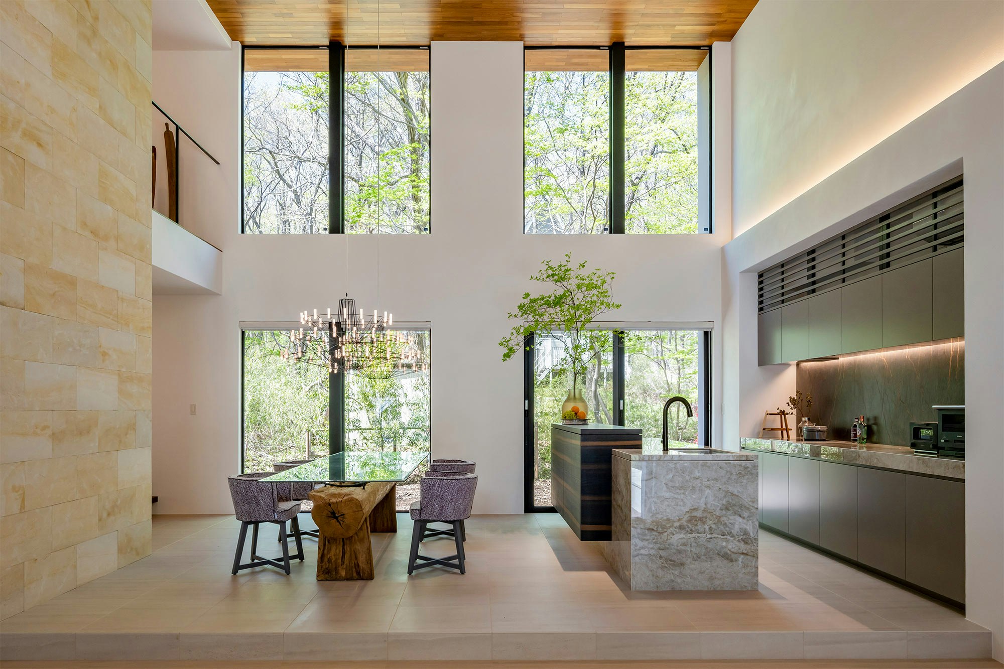 The company has built a model home that perfectly reflects the experience of living in one of their properties. It is characterised by an extraordinary daytime area, 'an open-plan living-dining-kitchen space with a height of six metres,' as explained by its creators. This space features large windows that allow the outside nature to flow into the house, a large Quinn natural stone wall, and a spacious kitchen-diner separated from the living room by a raised area and distinct flooring.