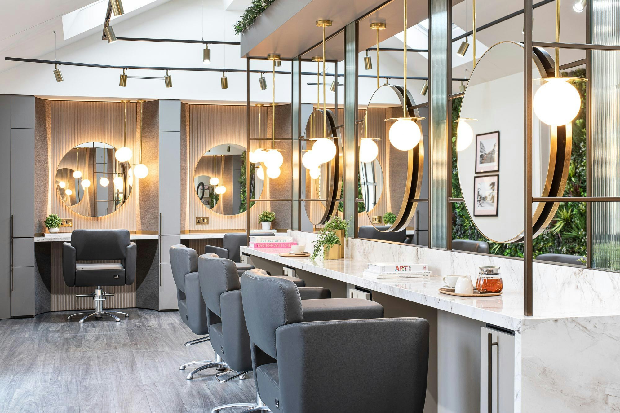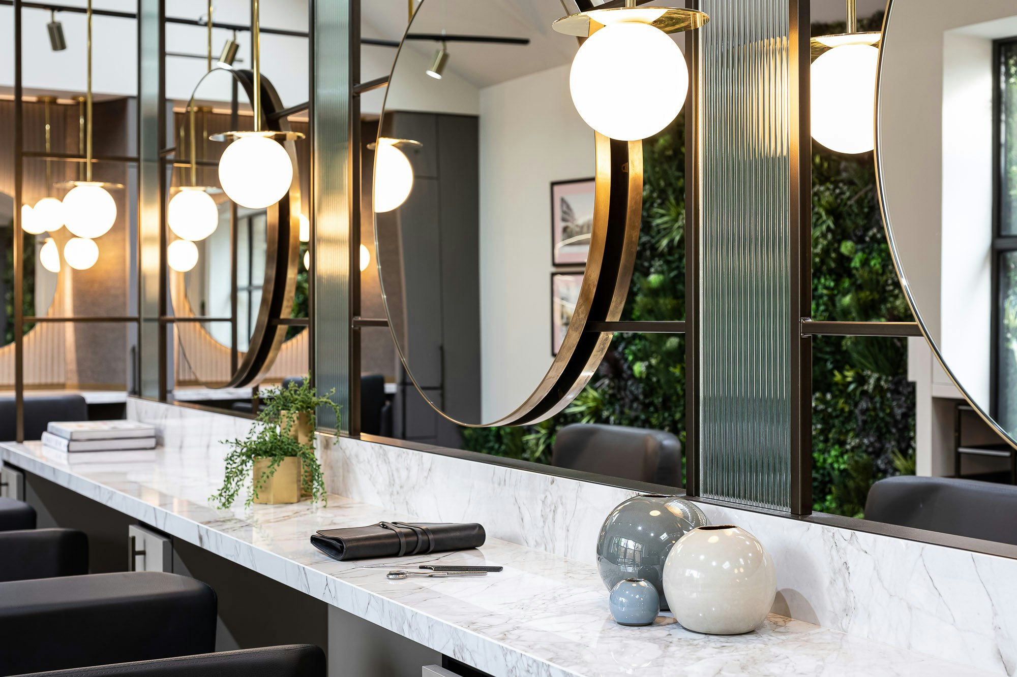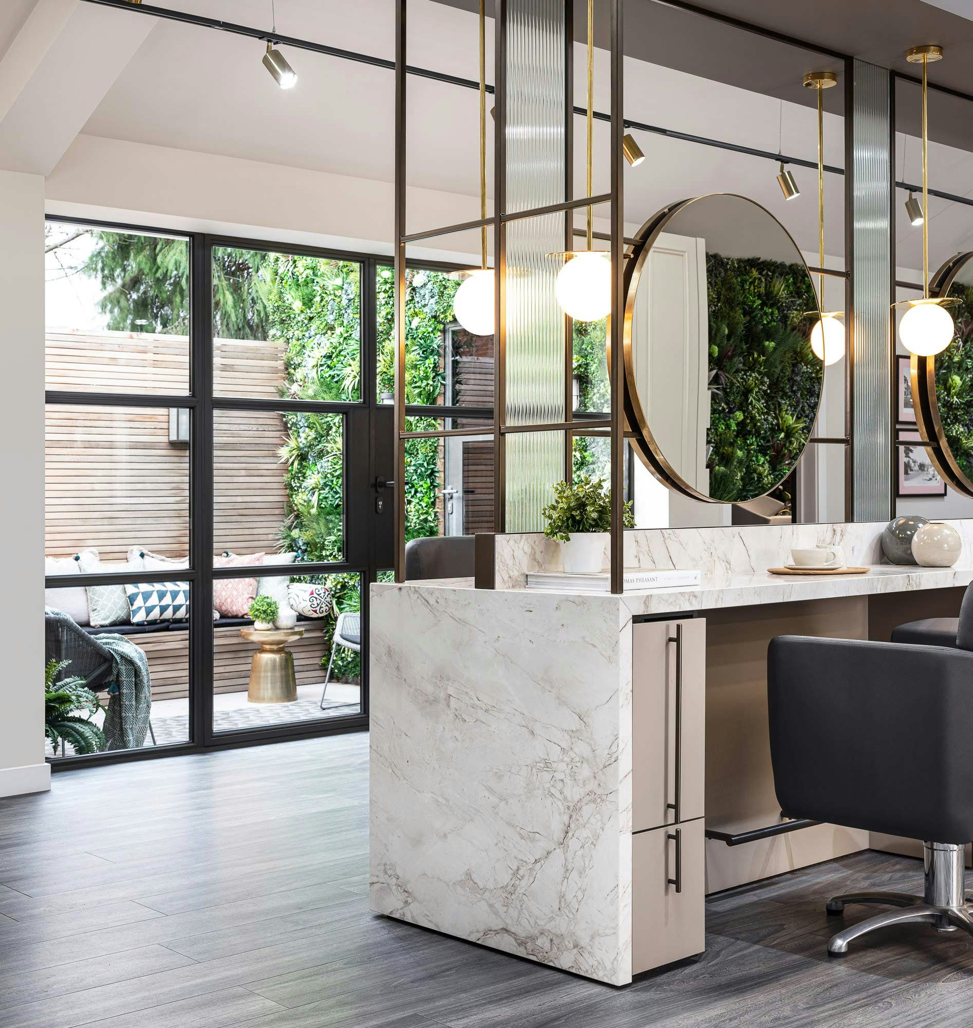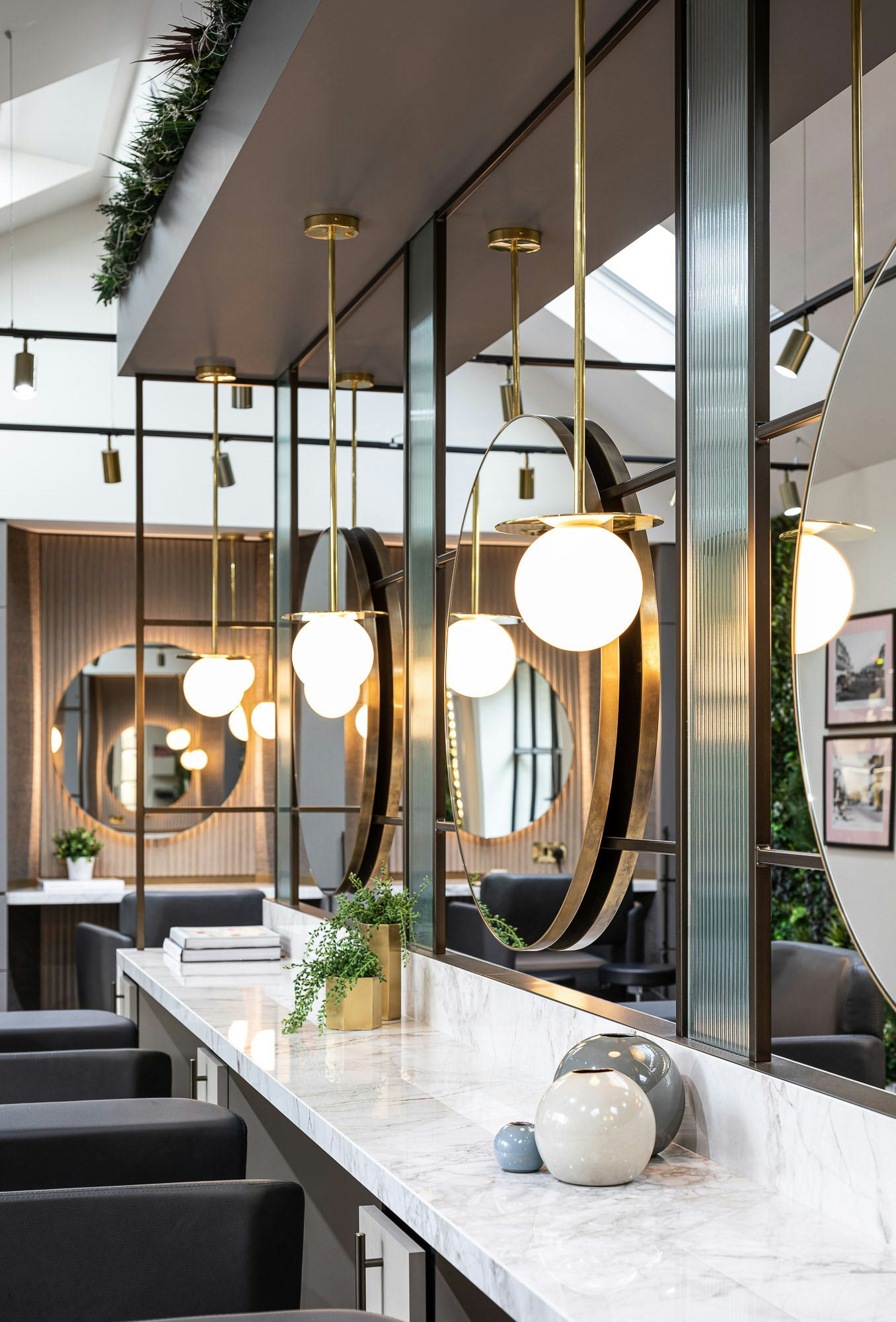 Various textures are embraced throughout the salon to offer interest, from ribbed wood to bespoke brass framed mirrors and pendants to add glamour. What’s more, external and internal green walls were chosen to bring a bit of nature to the space and ensure the salon is a calming area for customers to fully relax in.