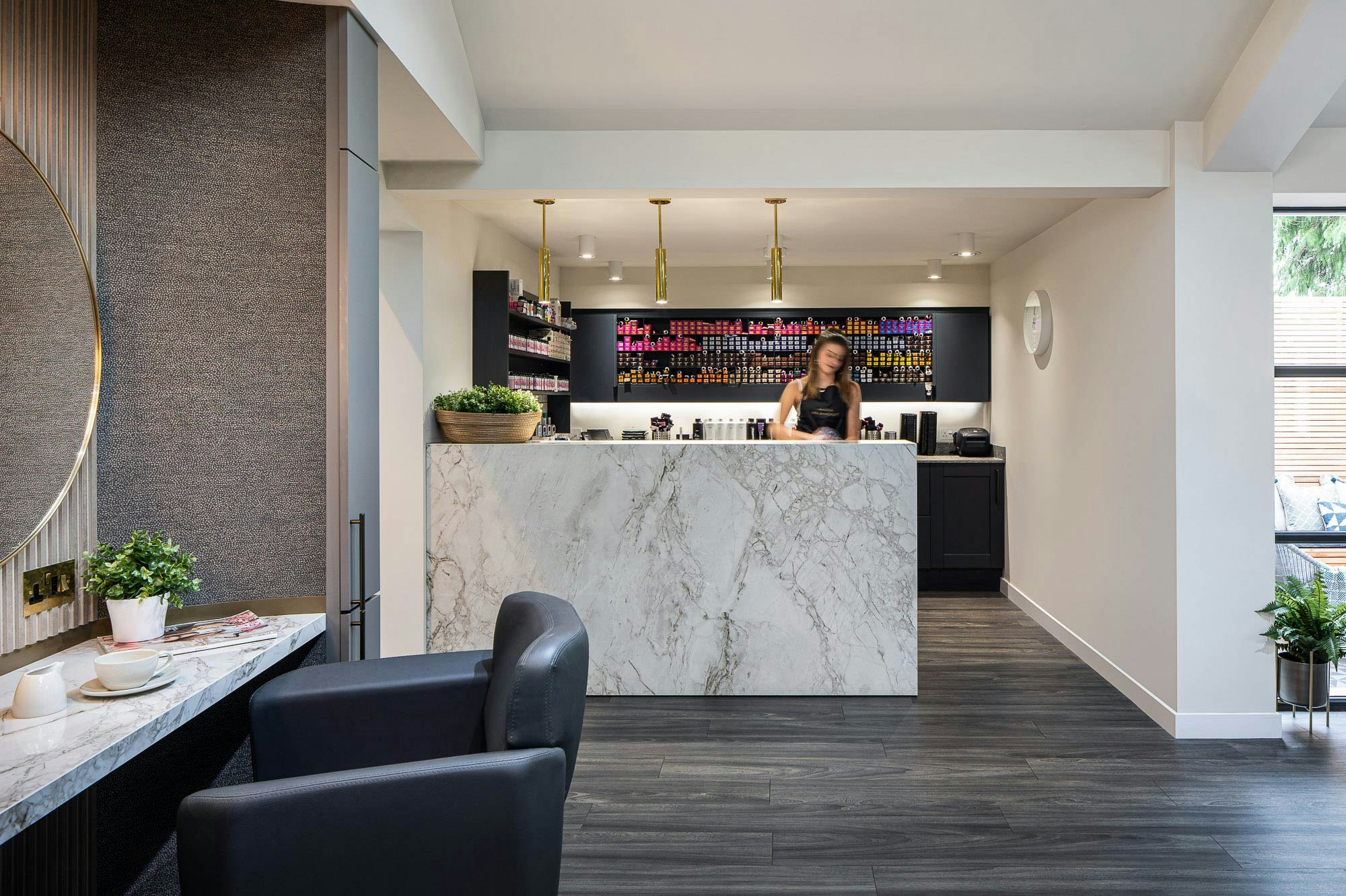 To help achieve a luxury feel, designers Gordon-Duff & Linton chose Dekton Bergen to adorn various areas of the salon, including a large central island with a striking waterfall edge for customers to be pampered at and a welcoming reception desk front.