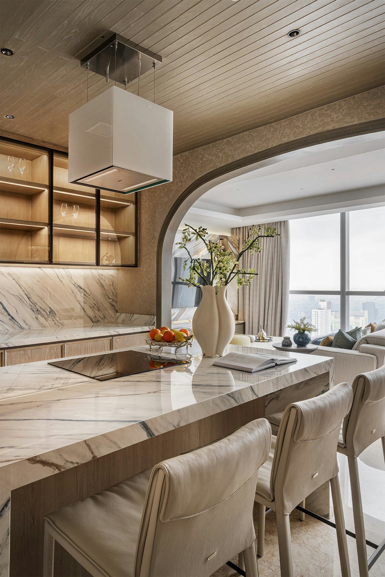 As a result, Dekton Trance was chosen for the kitchen island, worktop and splashback. Its white base with bluish and golden veins was undoubtedly the perfect complement. “We chose it for its bold character; it creates a striking look that makes the kitchen stand out without being overwhelming, whilst also offering high durability.” The light-coloured wood and details such as the lamp and the chairs in a raw finish completed the look.