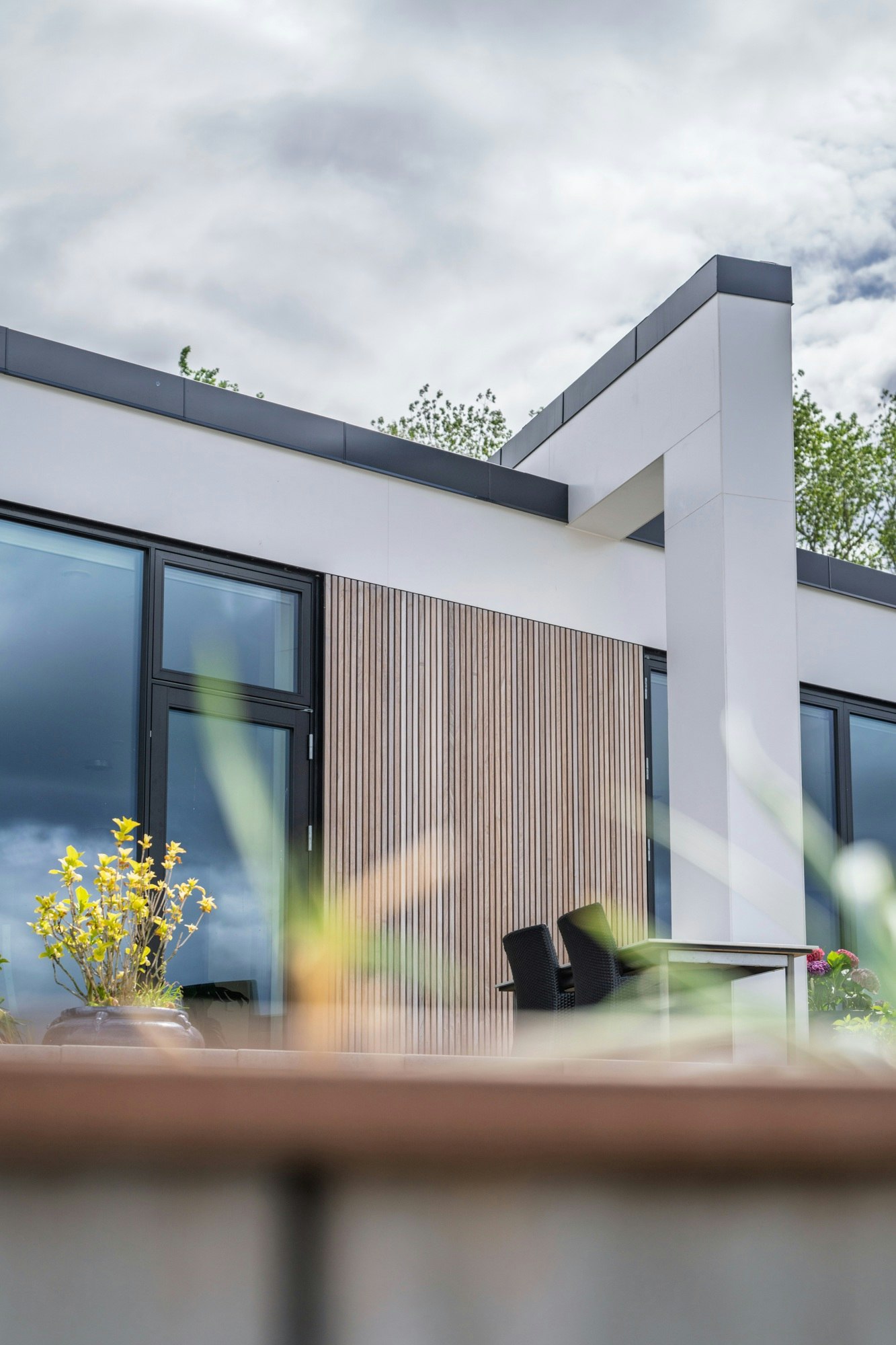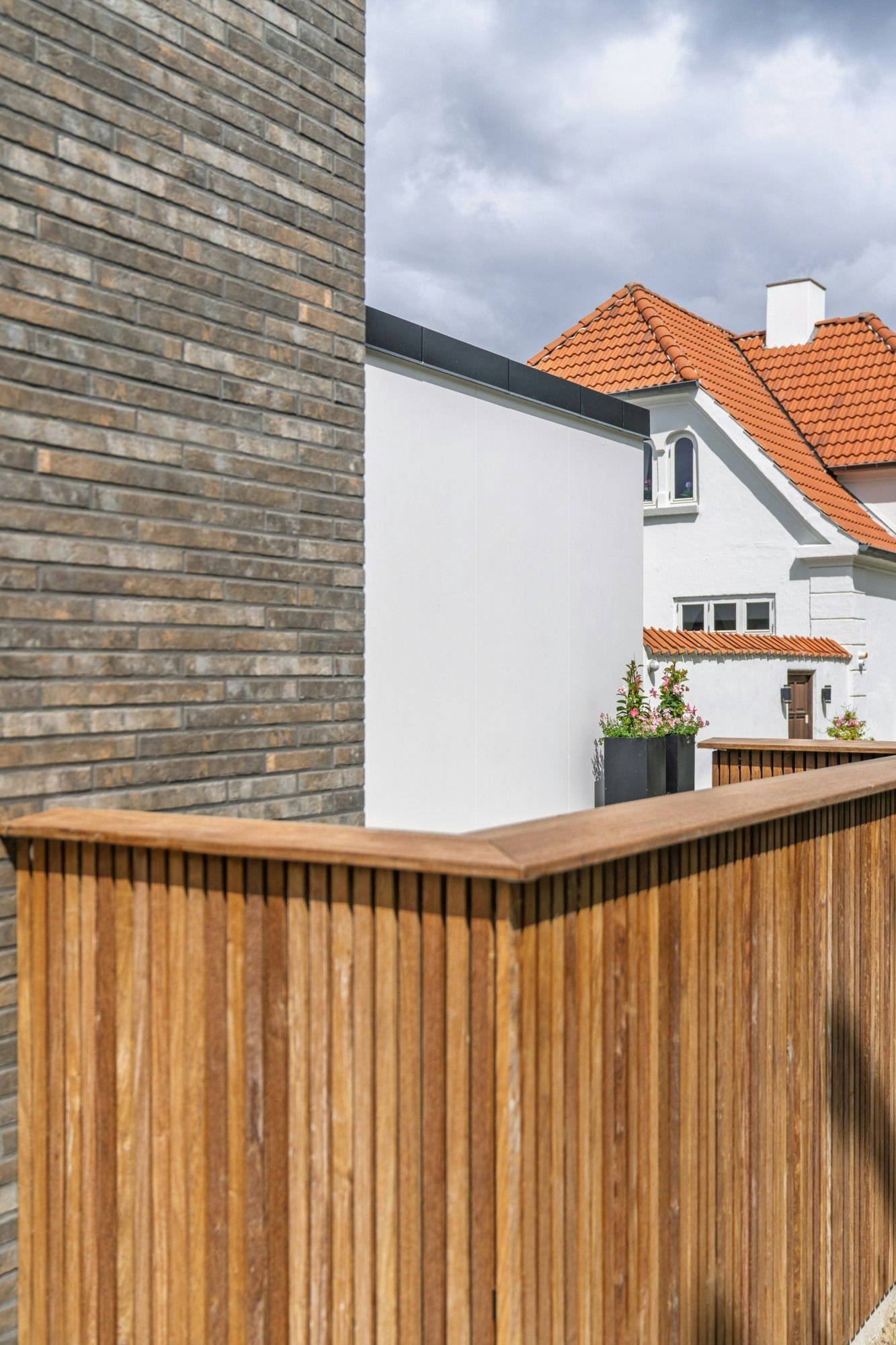 The façade is clad with Dekton Uyuni, applied using a bonded system that covers the main surfaces of the structure. This pure, luminous white material enhances the brightness of the home, accentuating the contrast with the dark brick elements, natural wood, and large glazed surfaces that characterise the project.