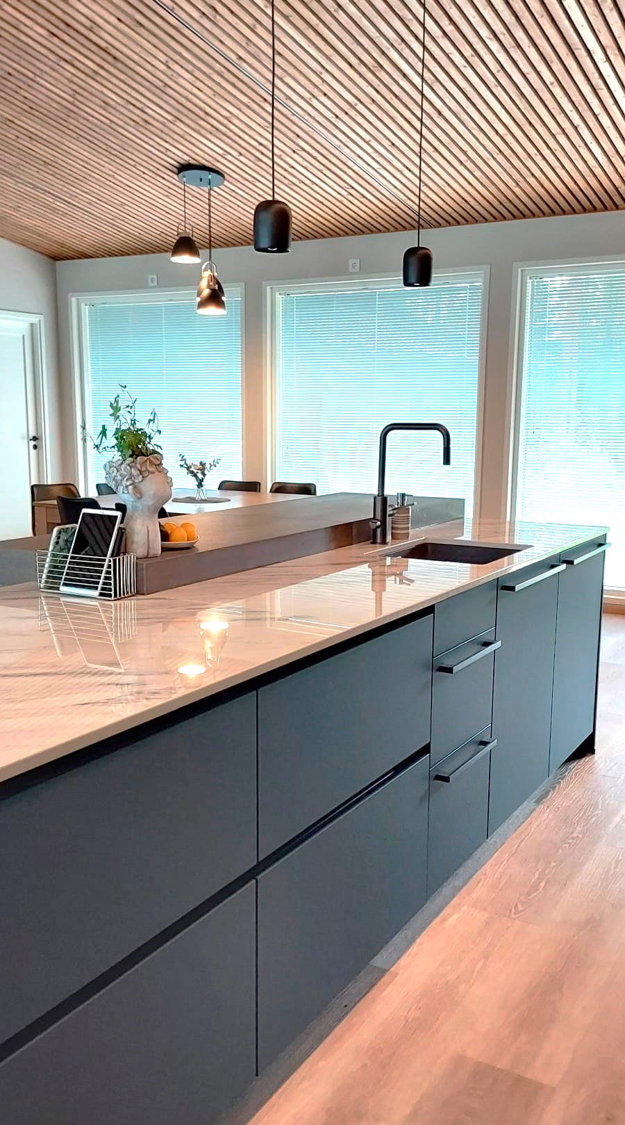 “I am a furniture designer and my husband works in construction and together we have completed dozens of projects. When designing the layout of the house, we would of course give enough space to the kitchen and we would choose functional, high quality furniture for it. At Noblessa we found a model of furniture that we liked: Divine Fjord blue, which has an ultra matt finish. In our search for style and elegance, we used the LineN collection of handleless furniture in combination with furniture with large black handles and other all-black furniture,” says Saana Mantere.